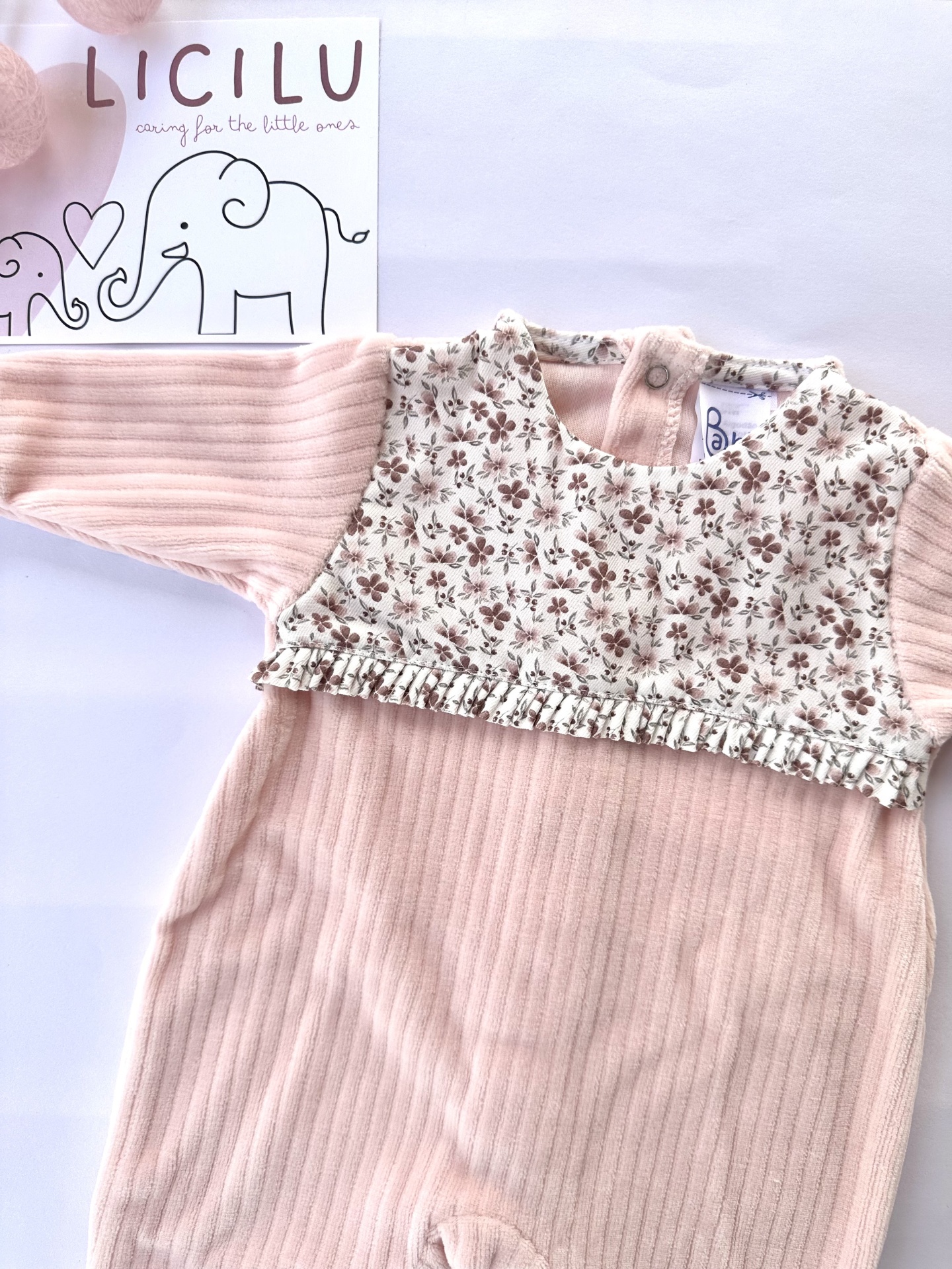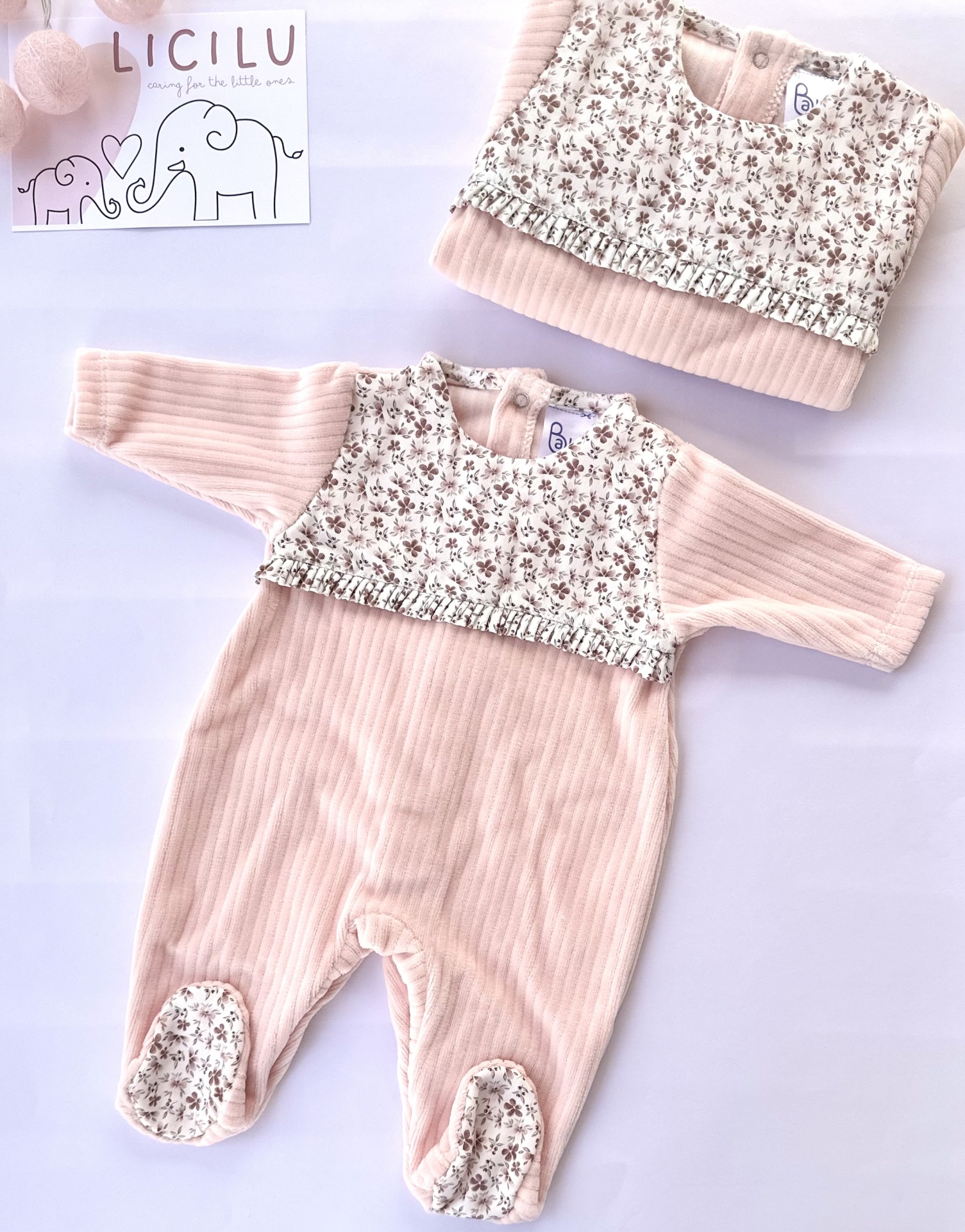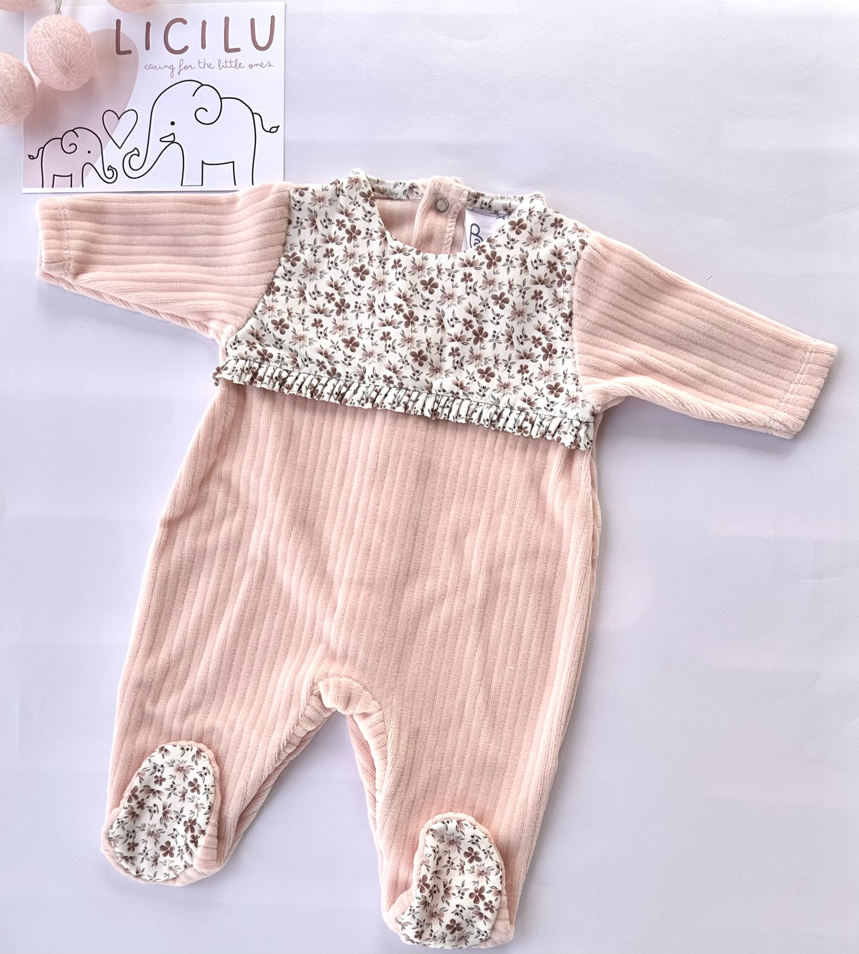 Babygrow decorado com padrão de florinhas nos tons de cor-de-rosa.