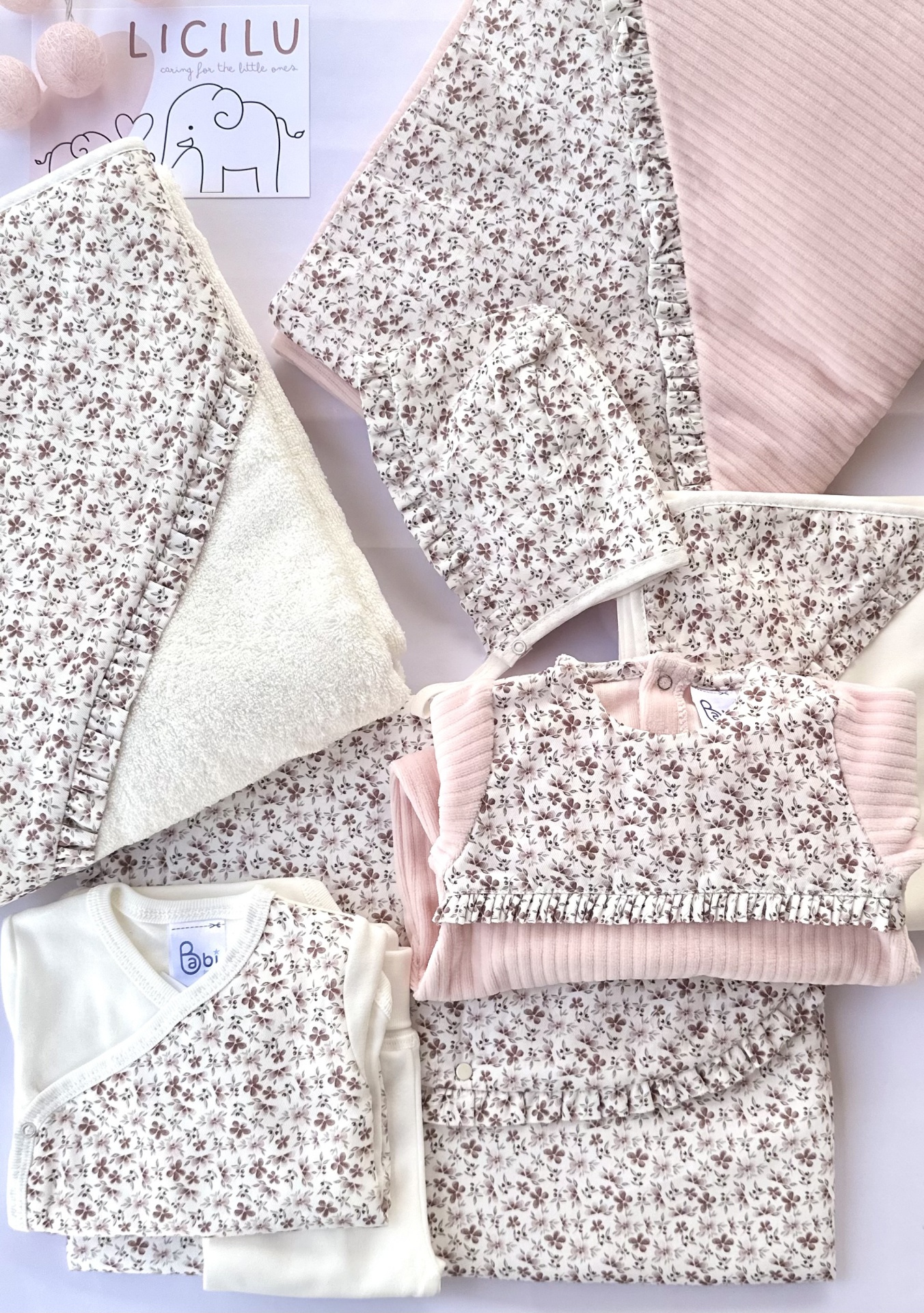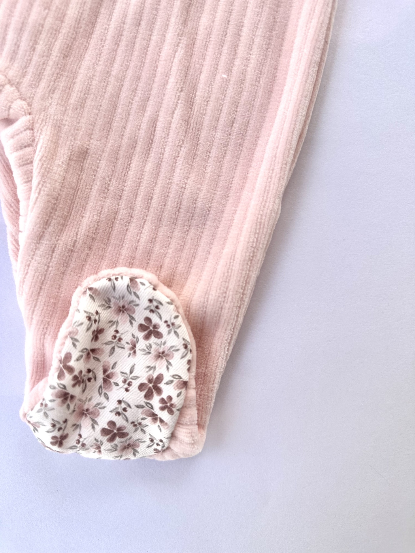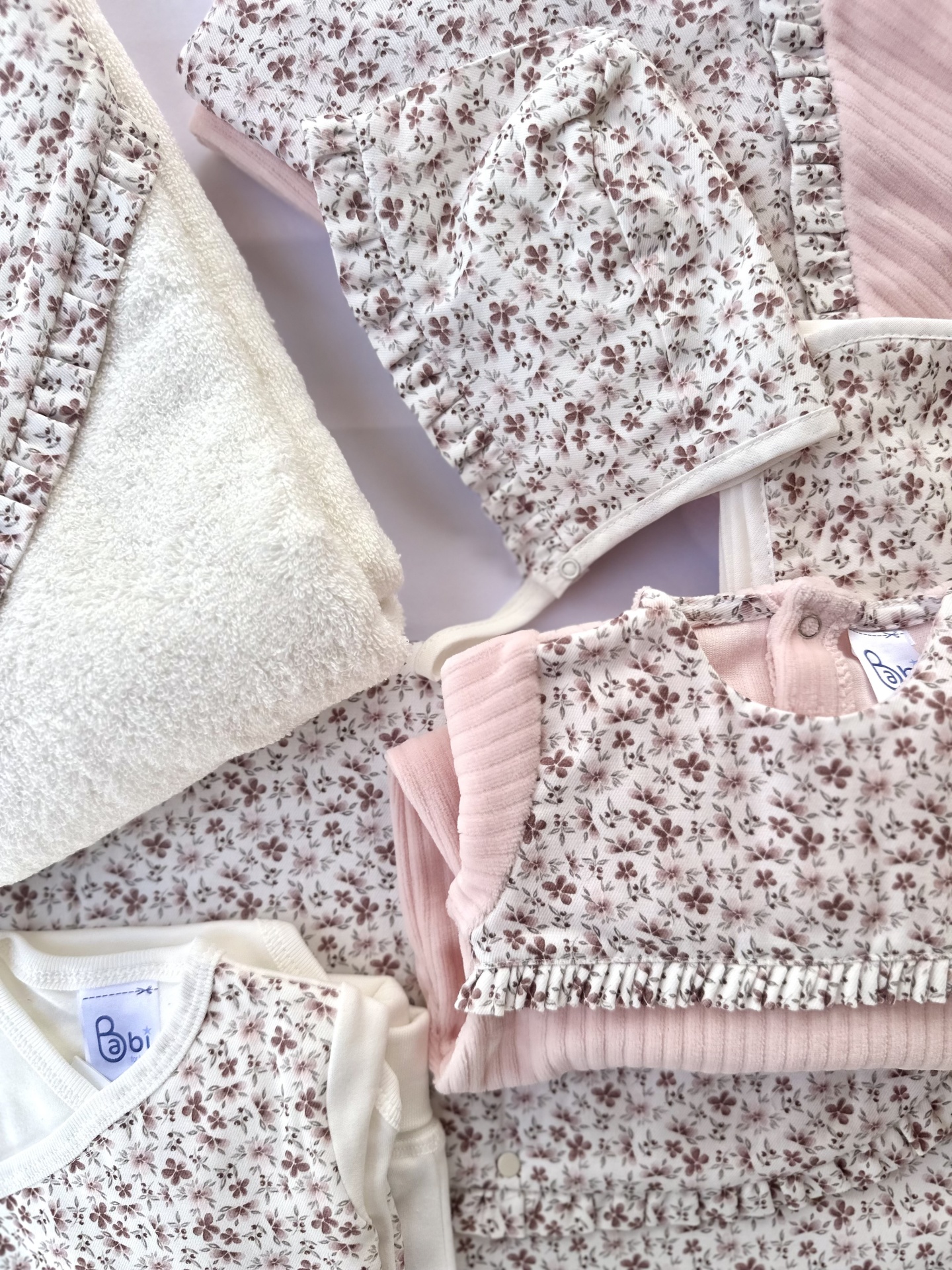 Babygrow decorado com padrão de florinhas nos tons de cor-de-rosa.