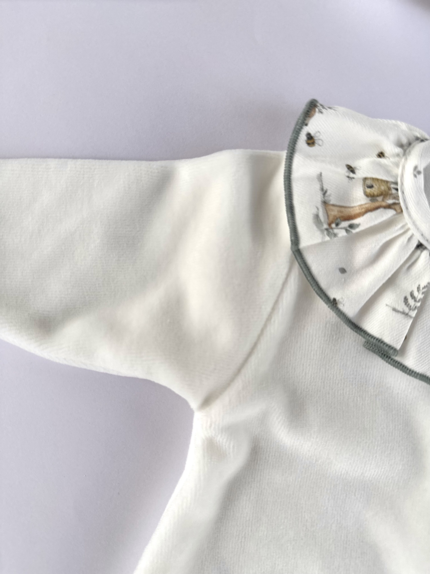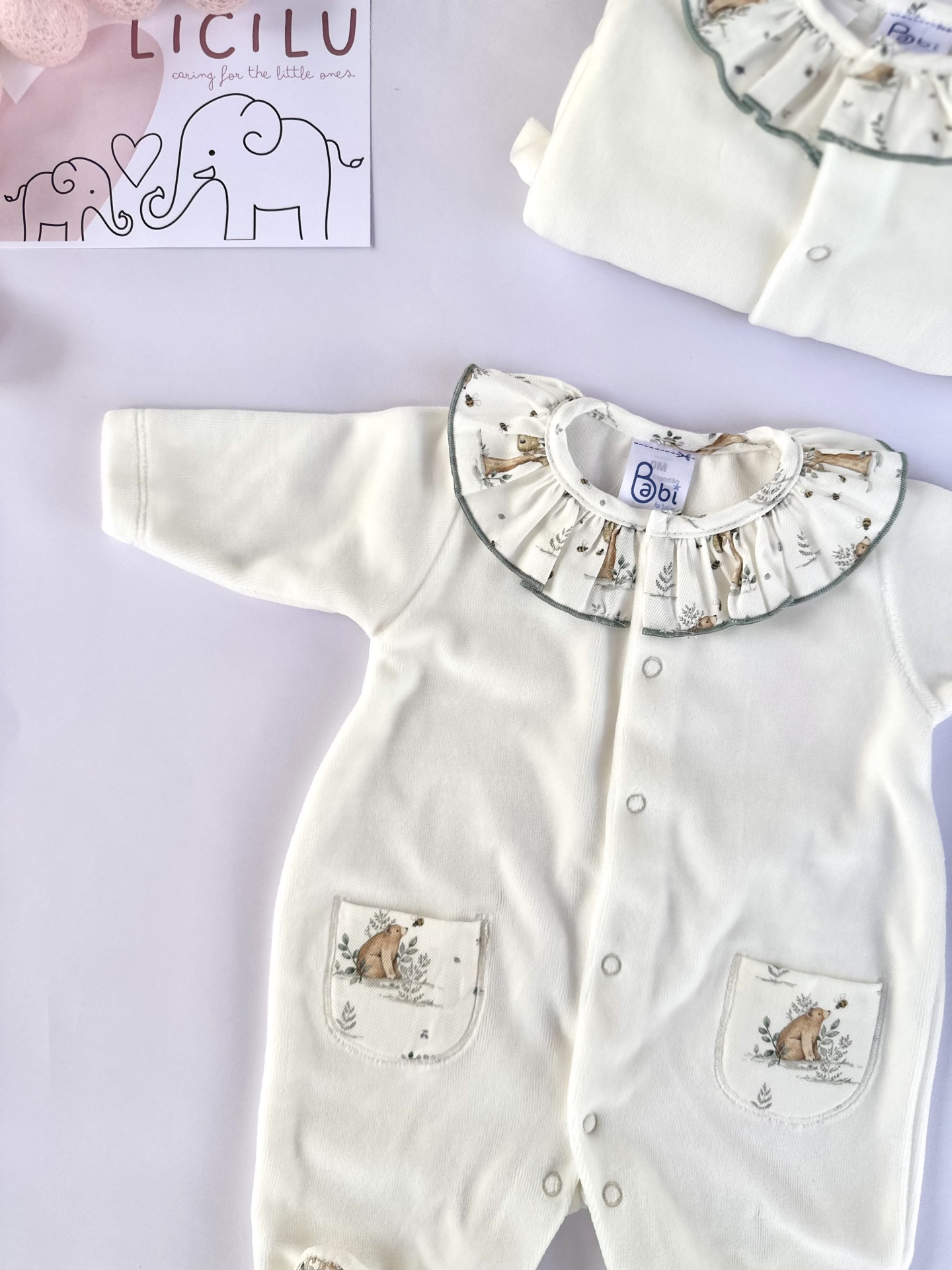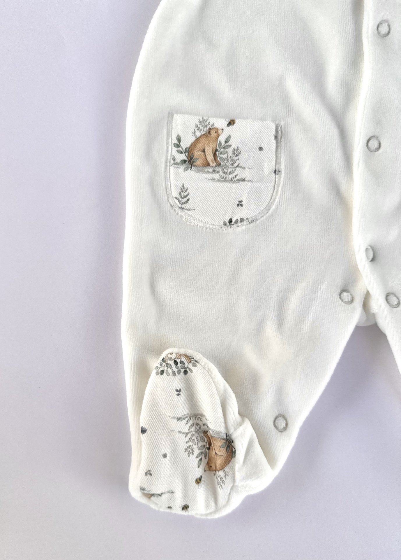 Babygrow decorado com padrão intemporal 'honey' com elementos da natureza incluindo ursinhos e abelhas. Com uma gola redonda que o torna ainda mais bonito.