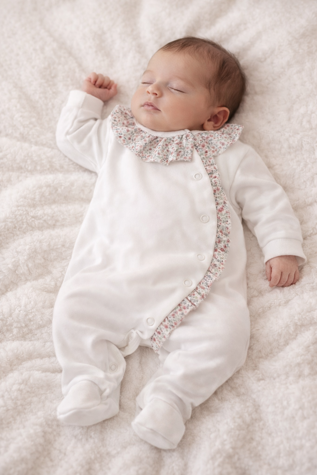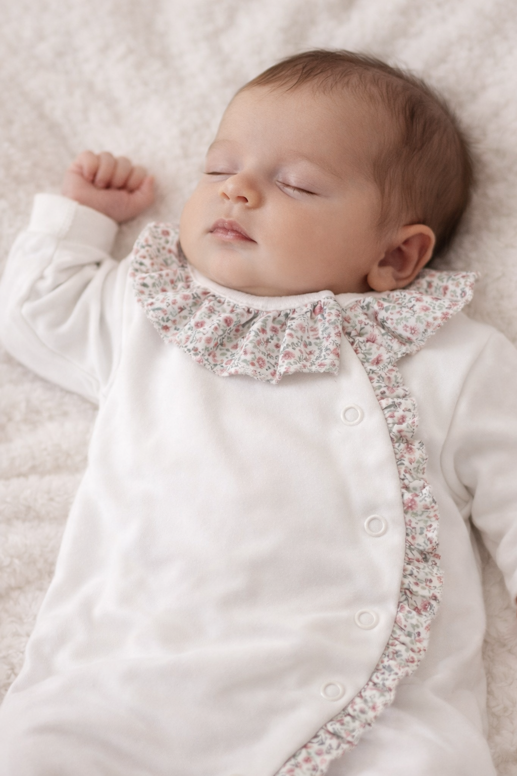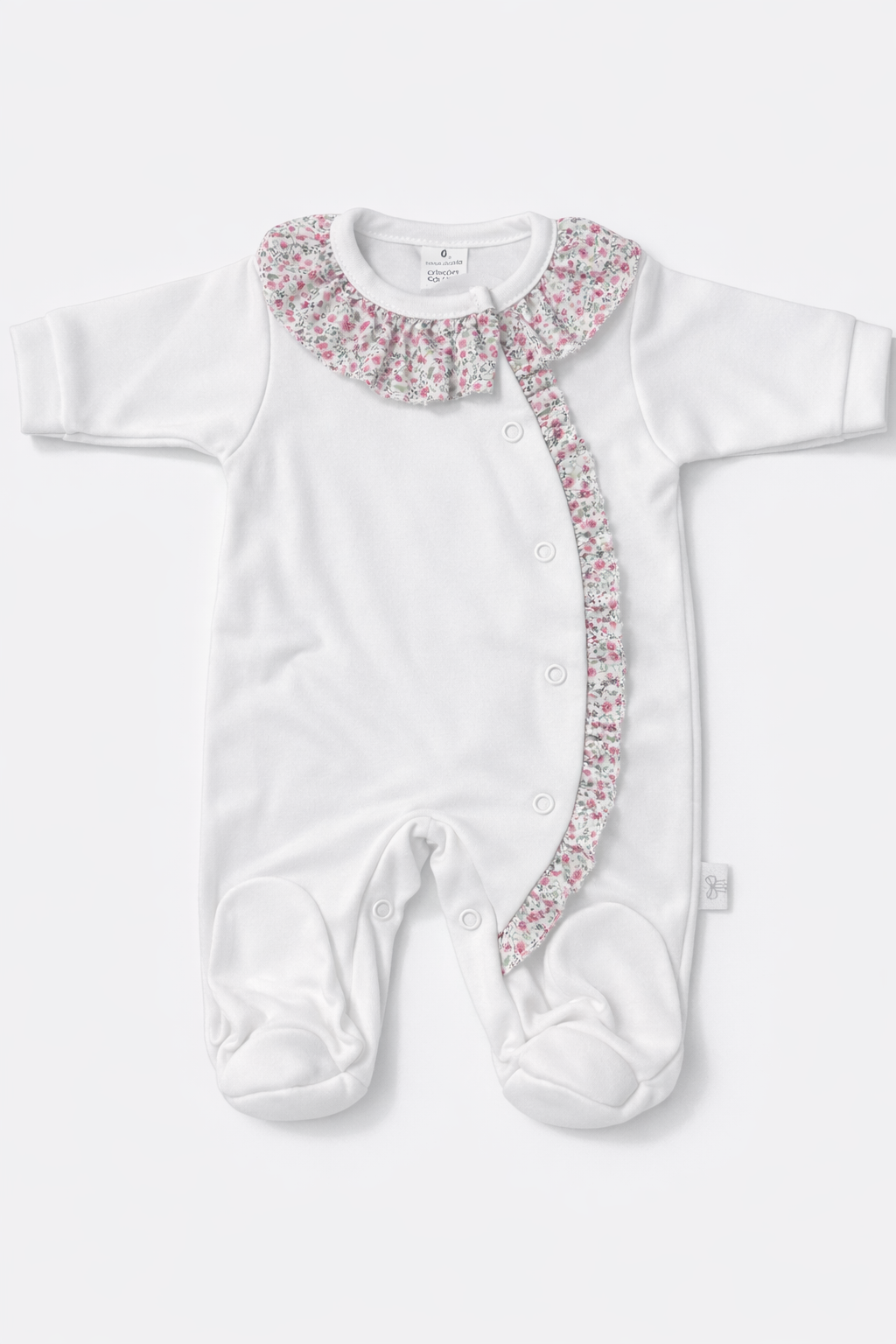 Babygrow com folhinho na gola e ao longo de todo o comprimento. Tem por base tecido de algodão simples na cor rosa, pérola ou branco e é depois decorado com o pormenor do padrão floral.