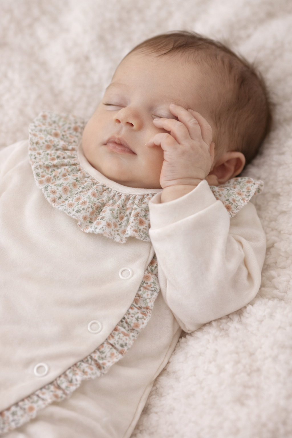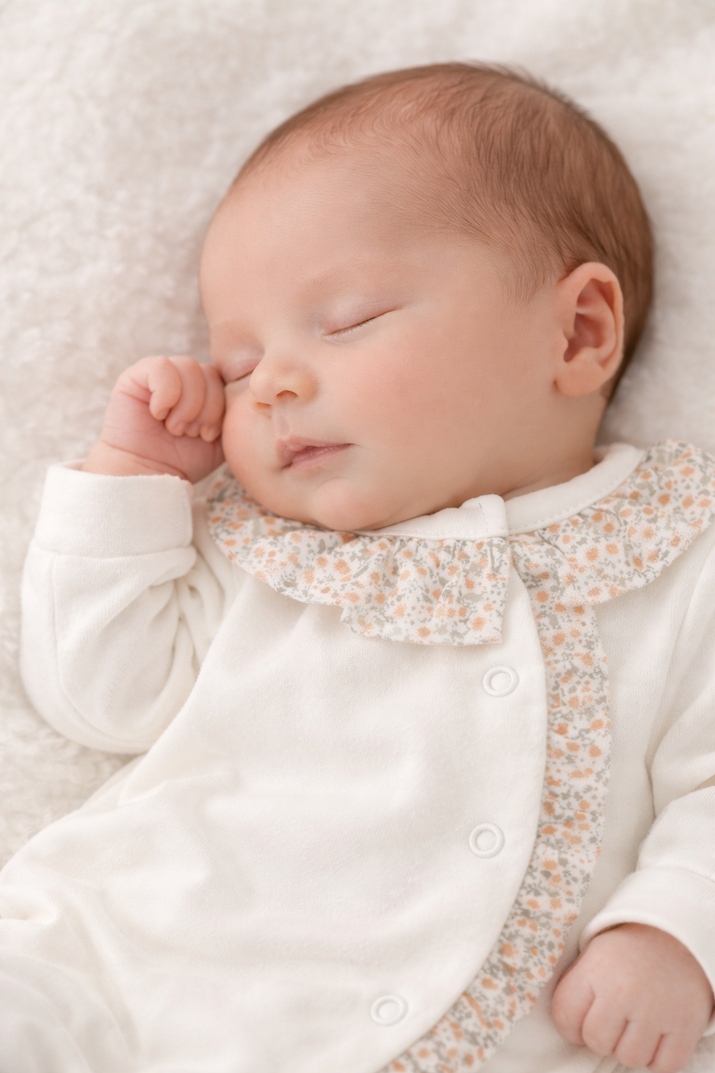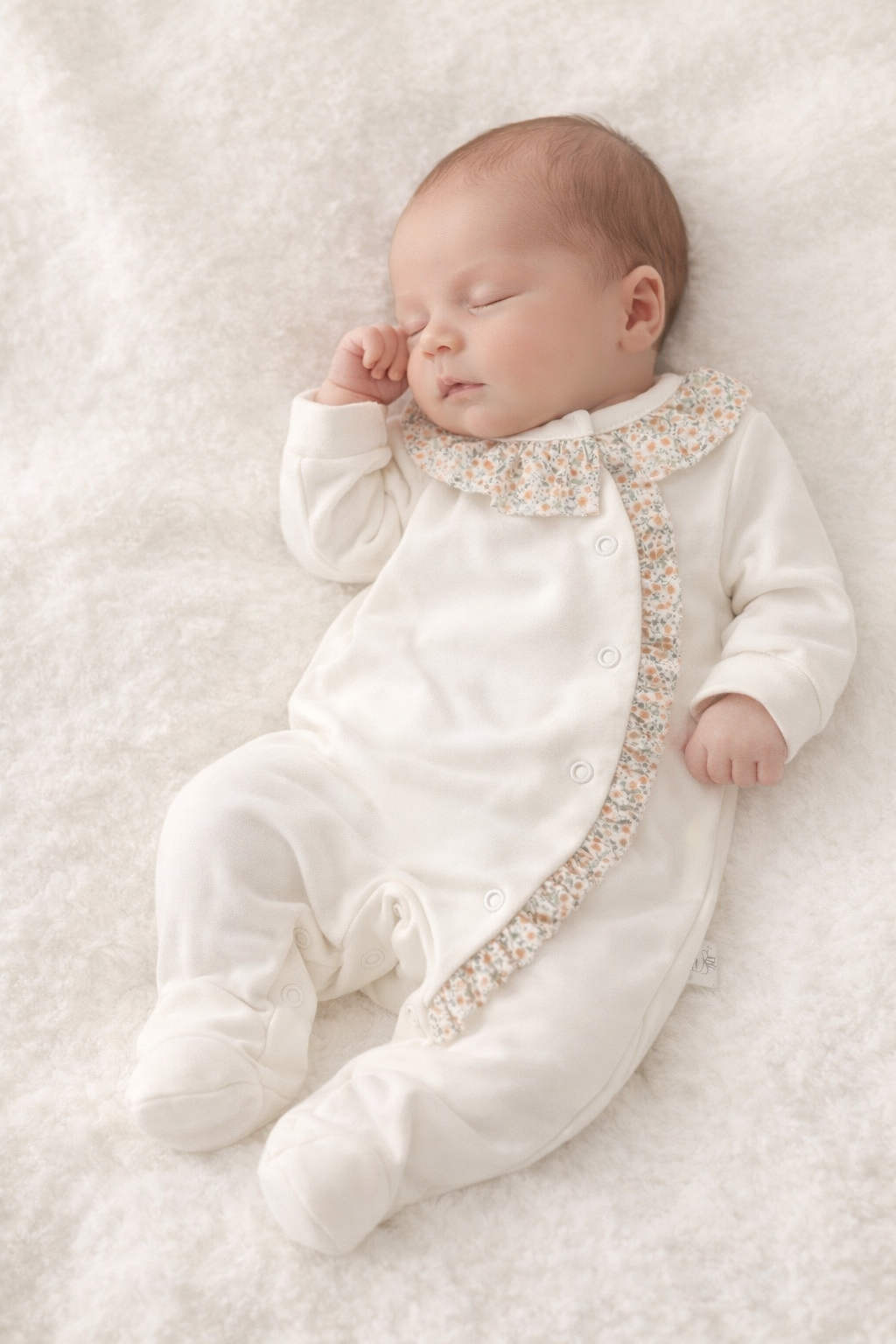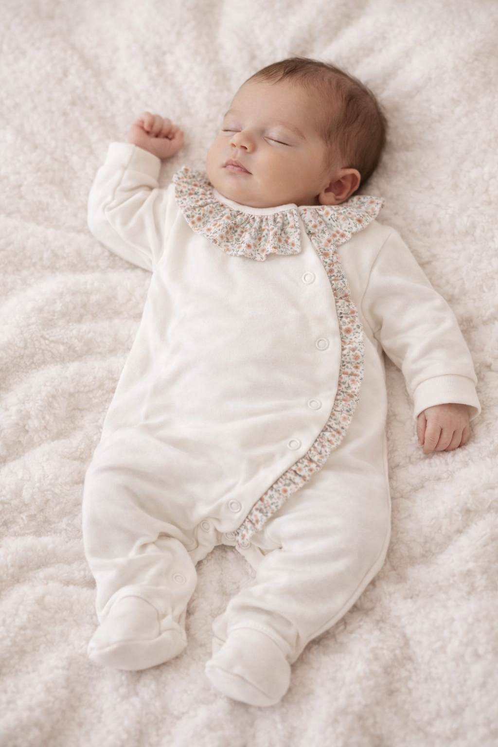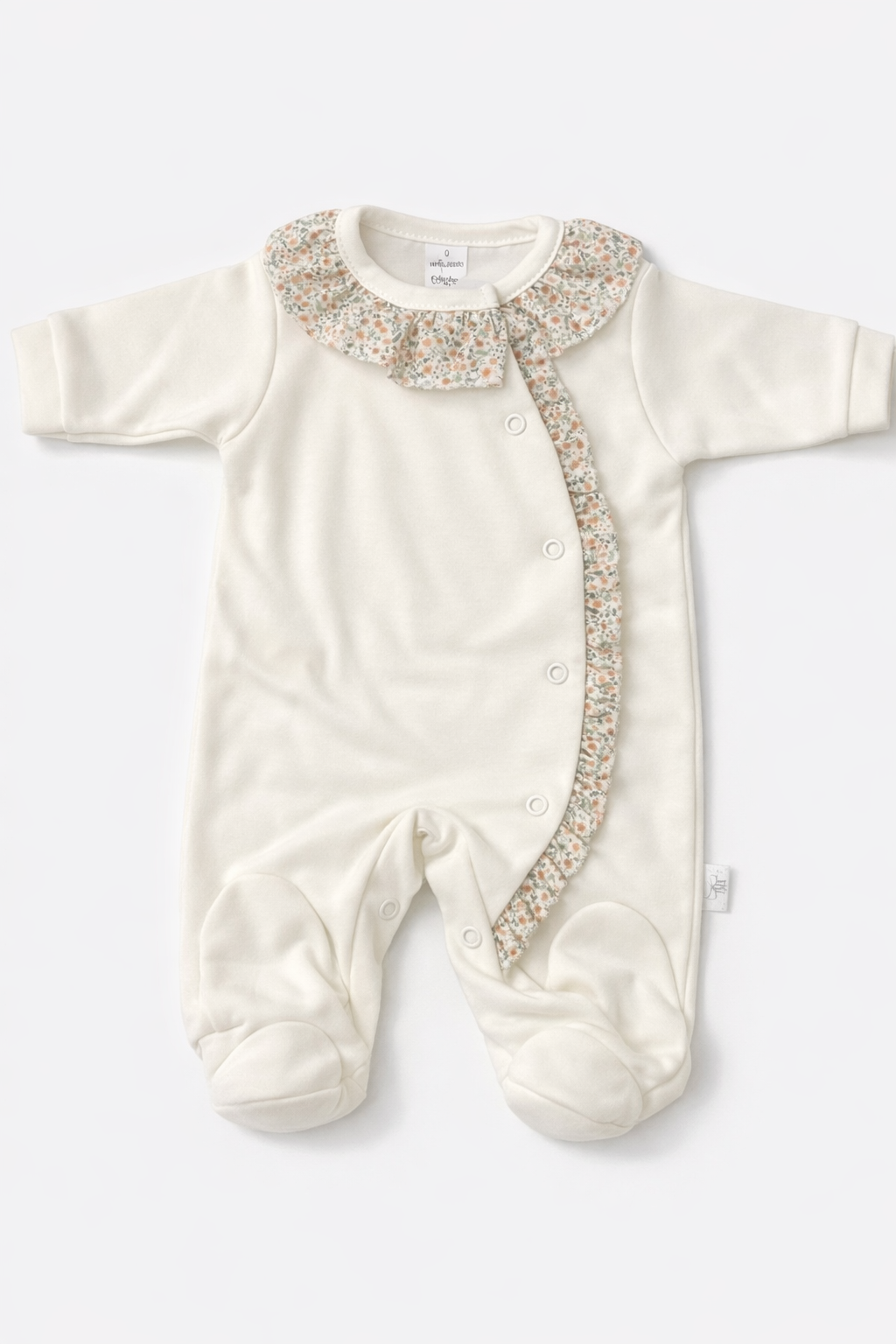 Babygrow com folhinho na gola e ao longo de todo o comprimento. Tem por base tecido de algodão simples na cor rosa, pérola ou branco e é depois decorado com o pormenor do padrão floral.