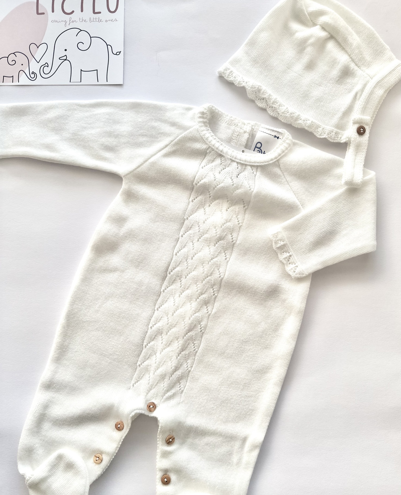 A malha tem trabalhado entrançado no centro do babygrow. É também trabalhada nos punhos e touca.