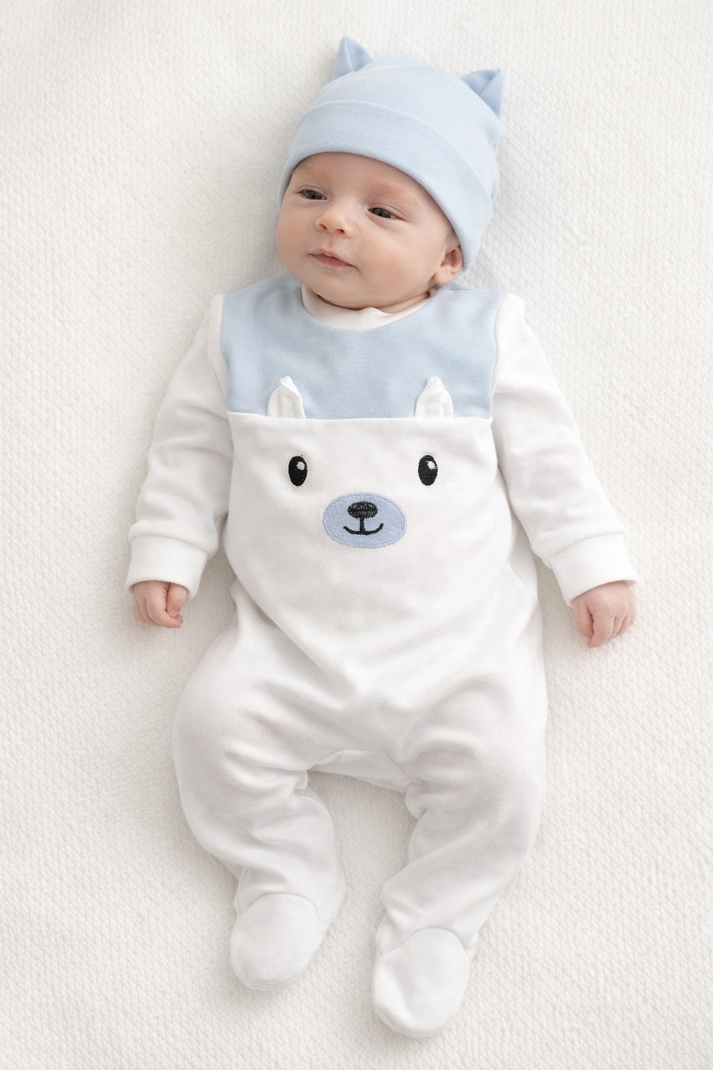 Babygrow com motivo de ursinho. É todo em branco e depois decorado nas cores disponíveis juntamente com o gorro.