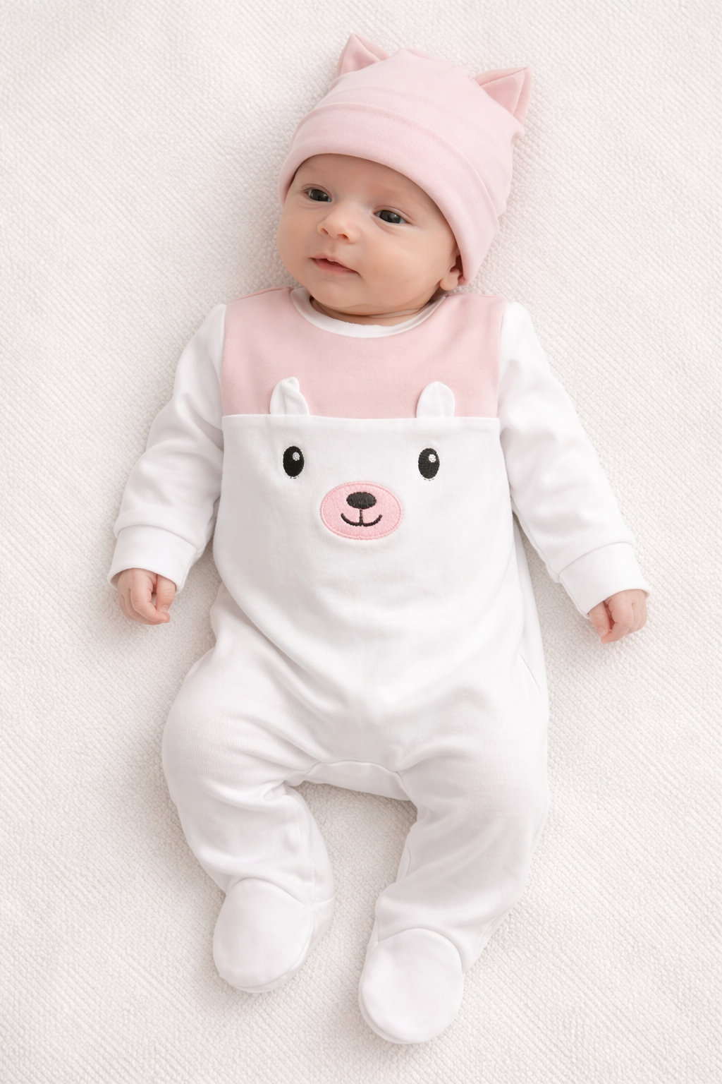 Babygrow com motivo de ursinho. É todo em branco e depois decorado nas cores disponíveis juntamente com o gorro.