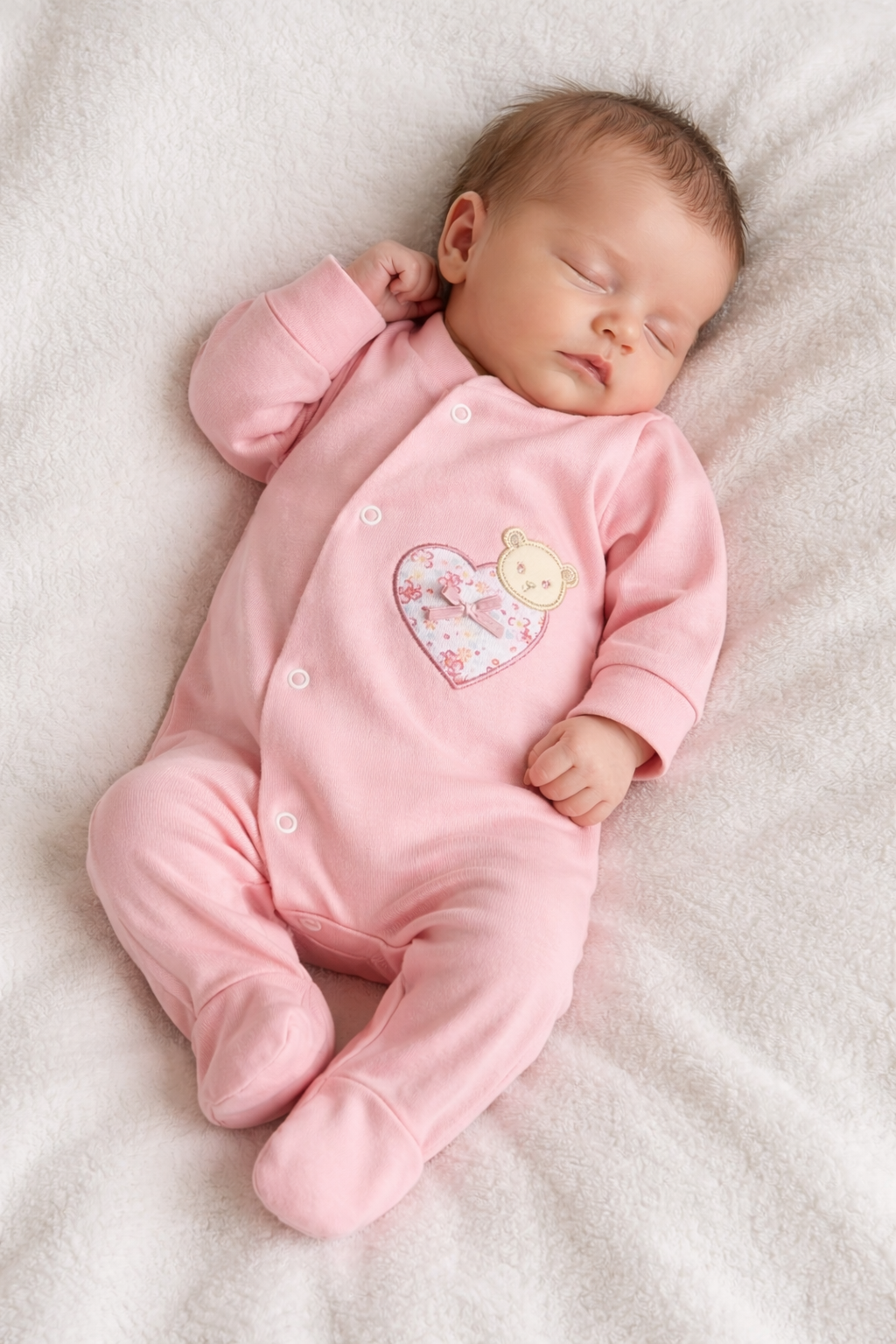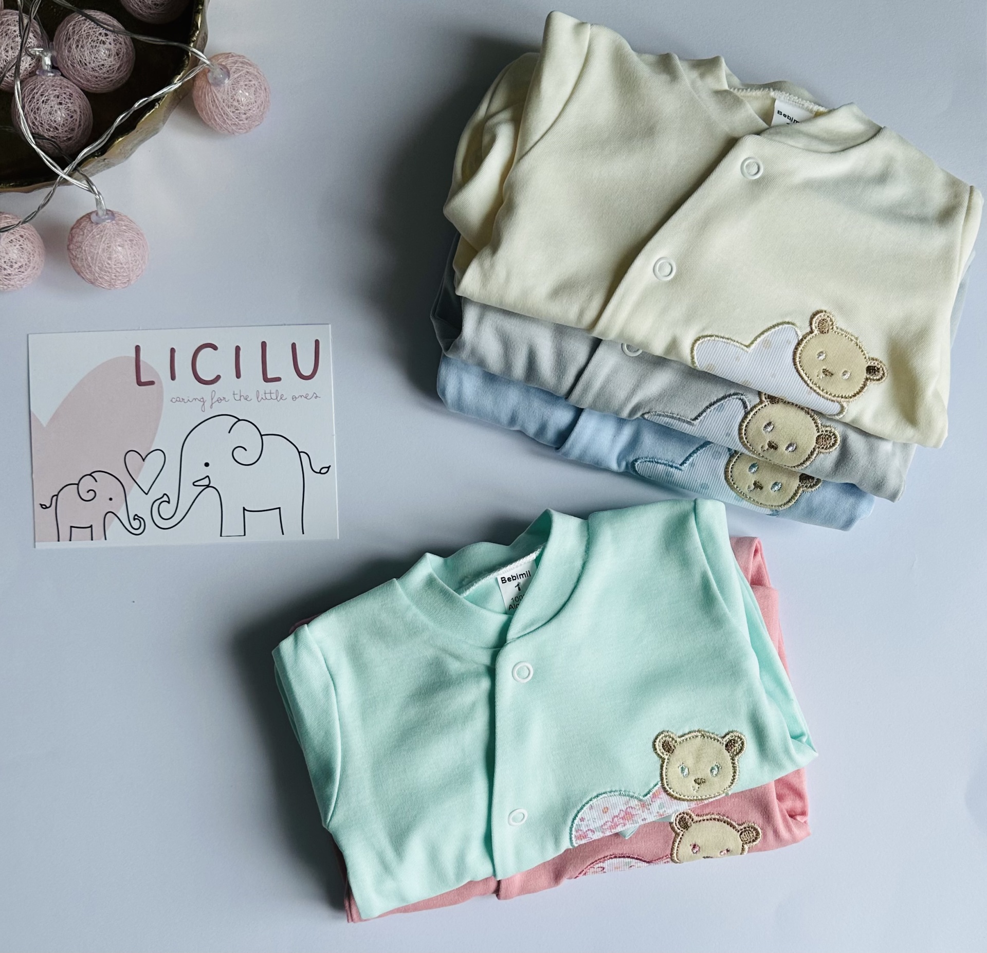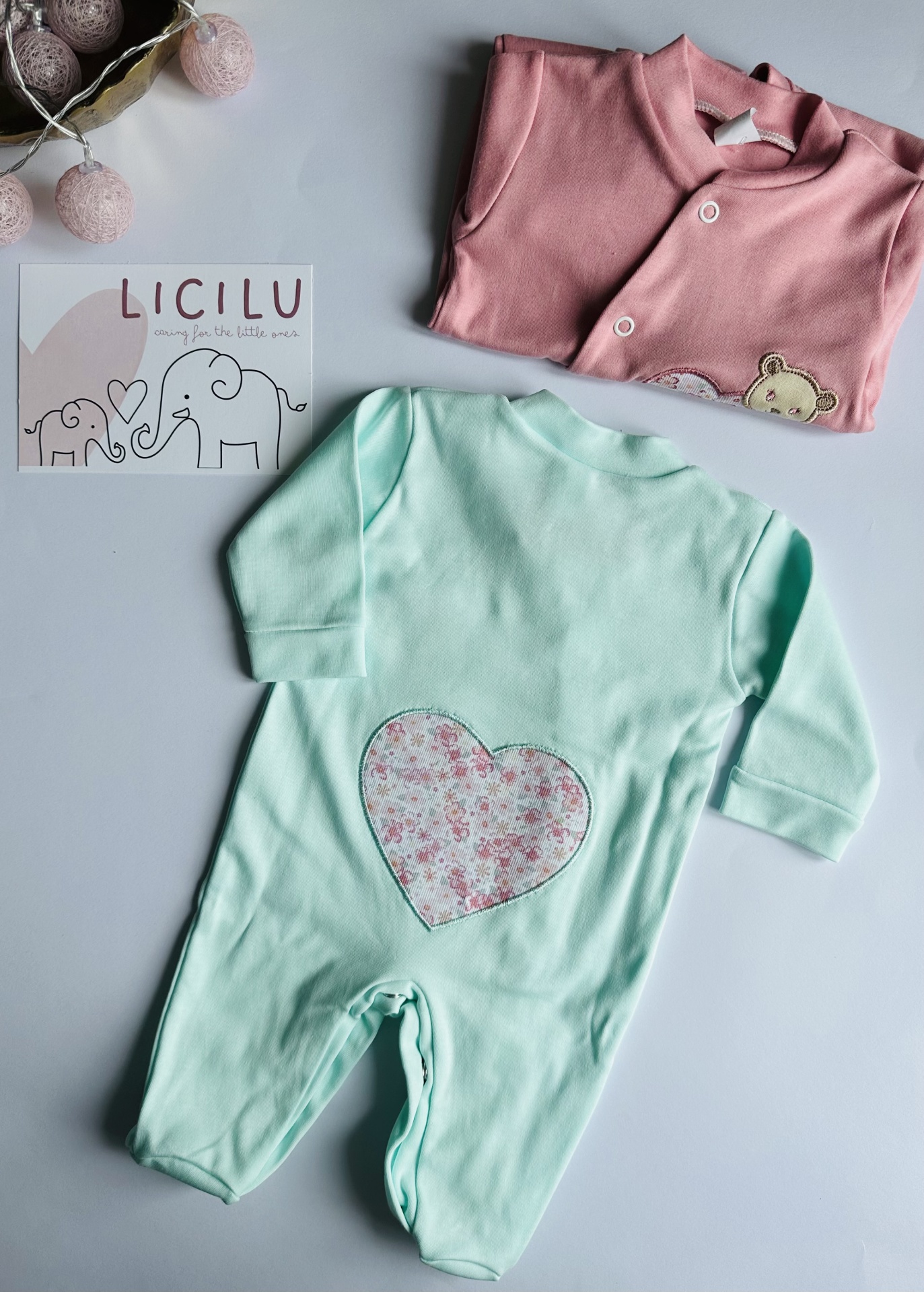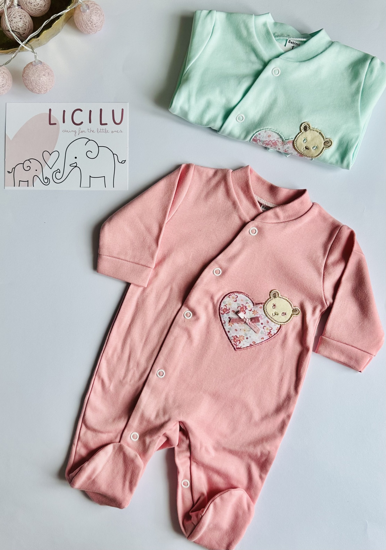 Babygrow com um ursinho e um coração bordados. Bordado de um coração nas costas.