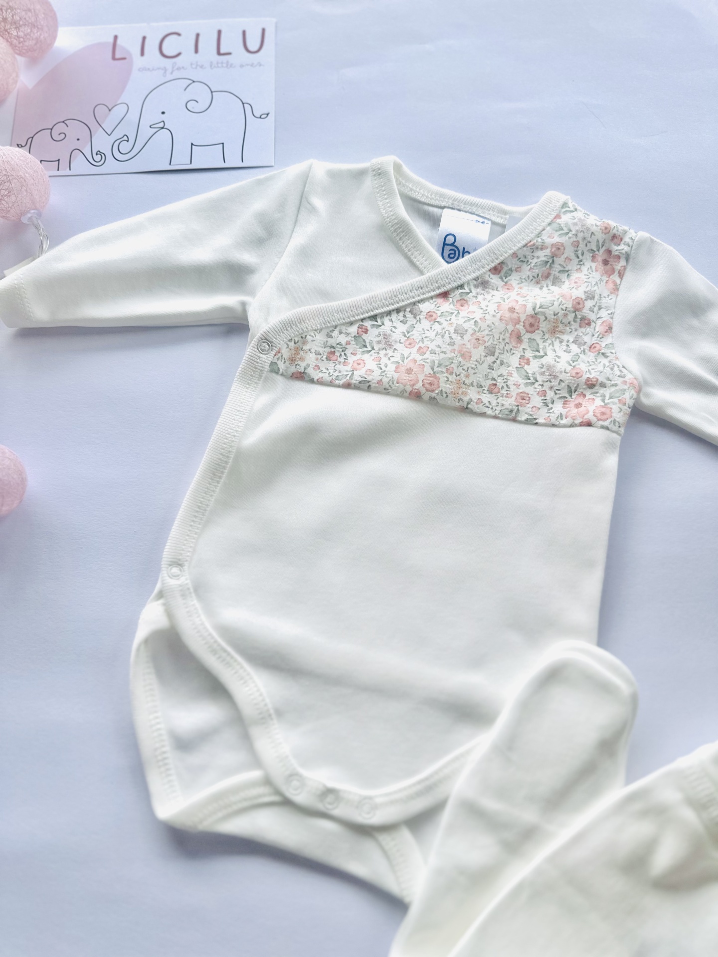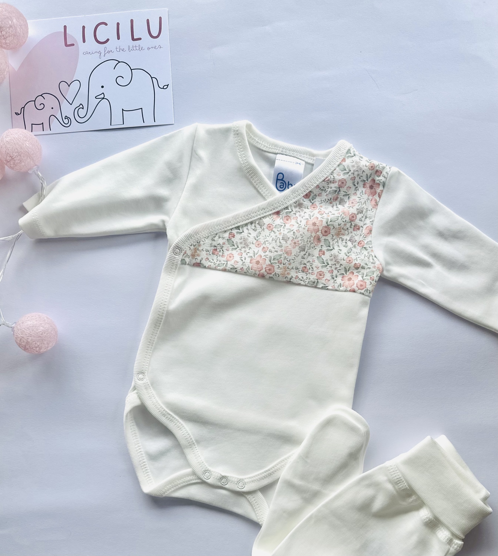 O padrão frontal do body (na zona do peito) é o mesmo da restante coleção composto por flores nos tons de rosa velho com outros elementos florais que acompanham a mesma tonalidade bem como com algumas folhas nos tons de verde seco.