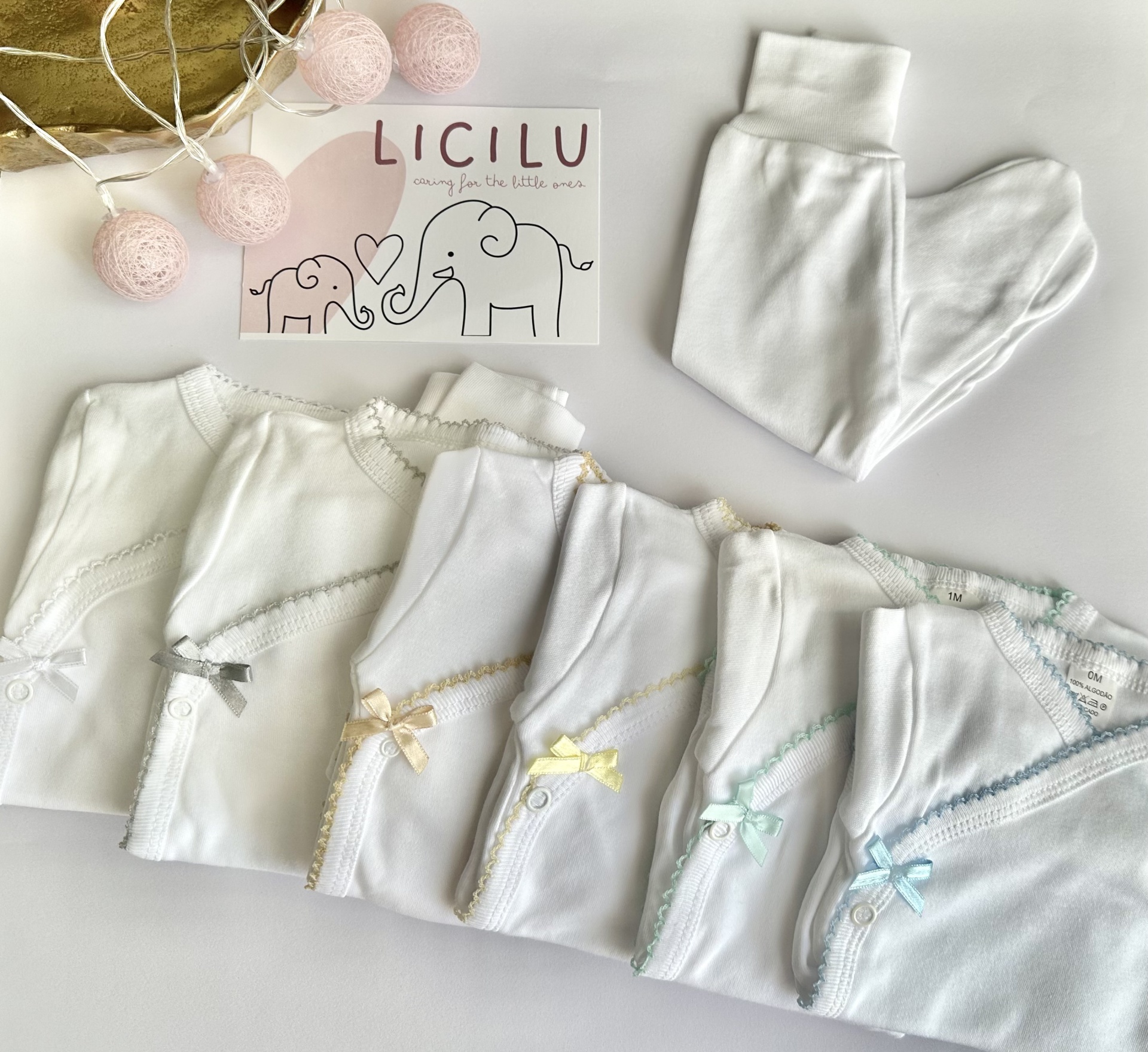 conjunto de bodies de bebé brancos com renda colorida, laços e calças brancas