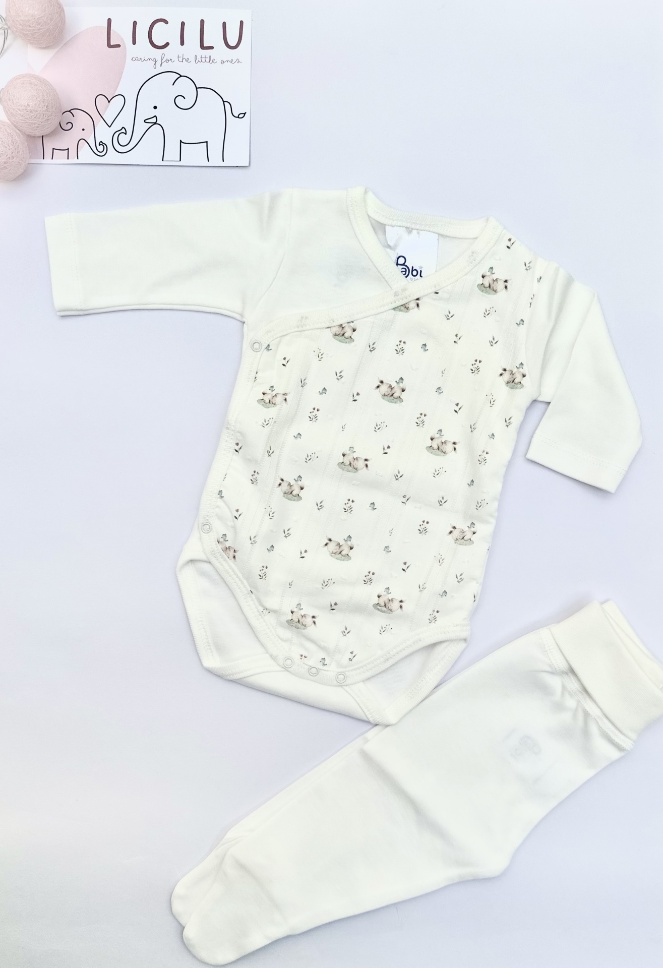 O restante body e calças é liso num tom branco perolado.
