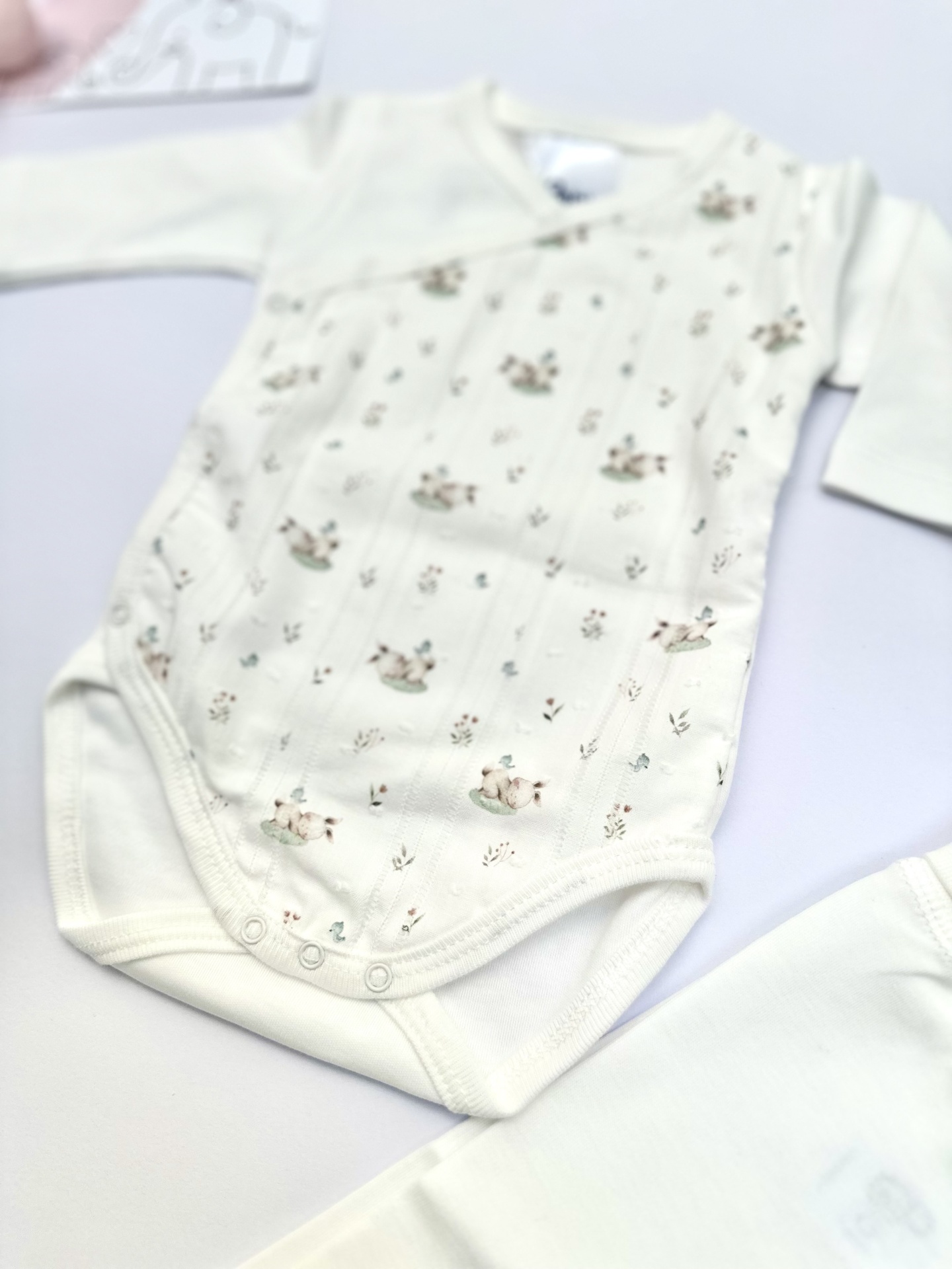 O padrão frontal do body é de coelhinhos e passarinhos muito primaveril e a chamar os dias mais quentes. Tem tons neutros muito delicados.