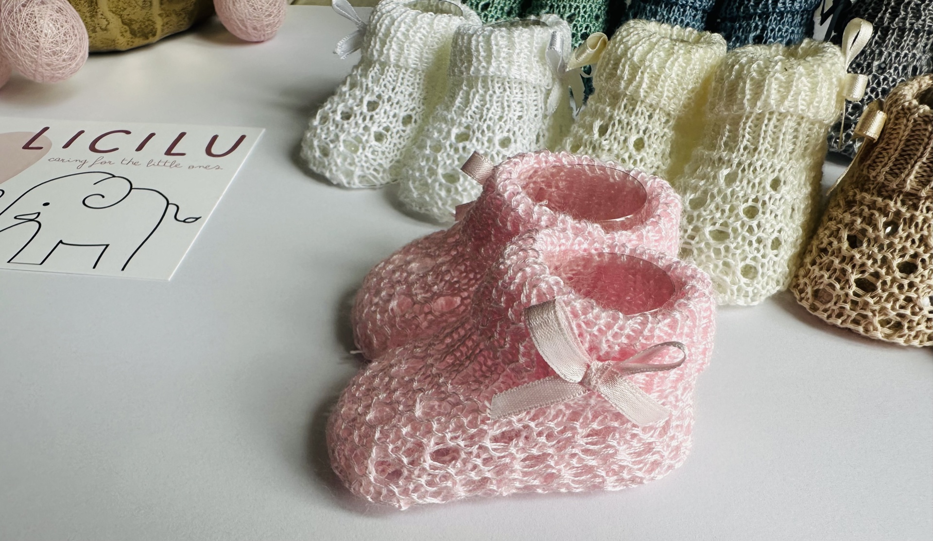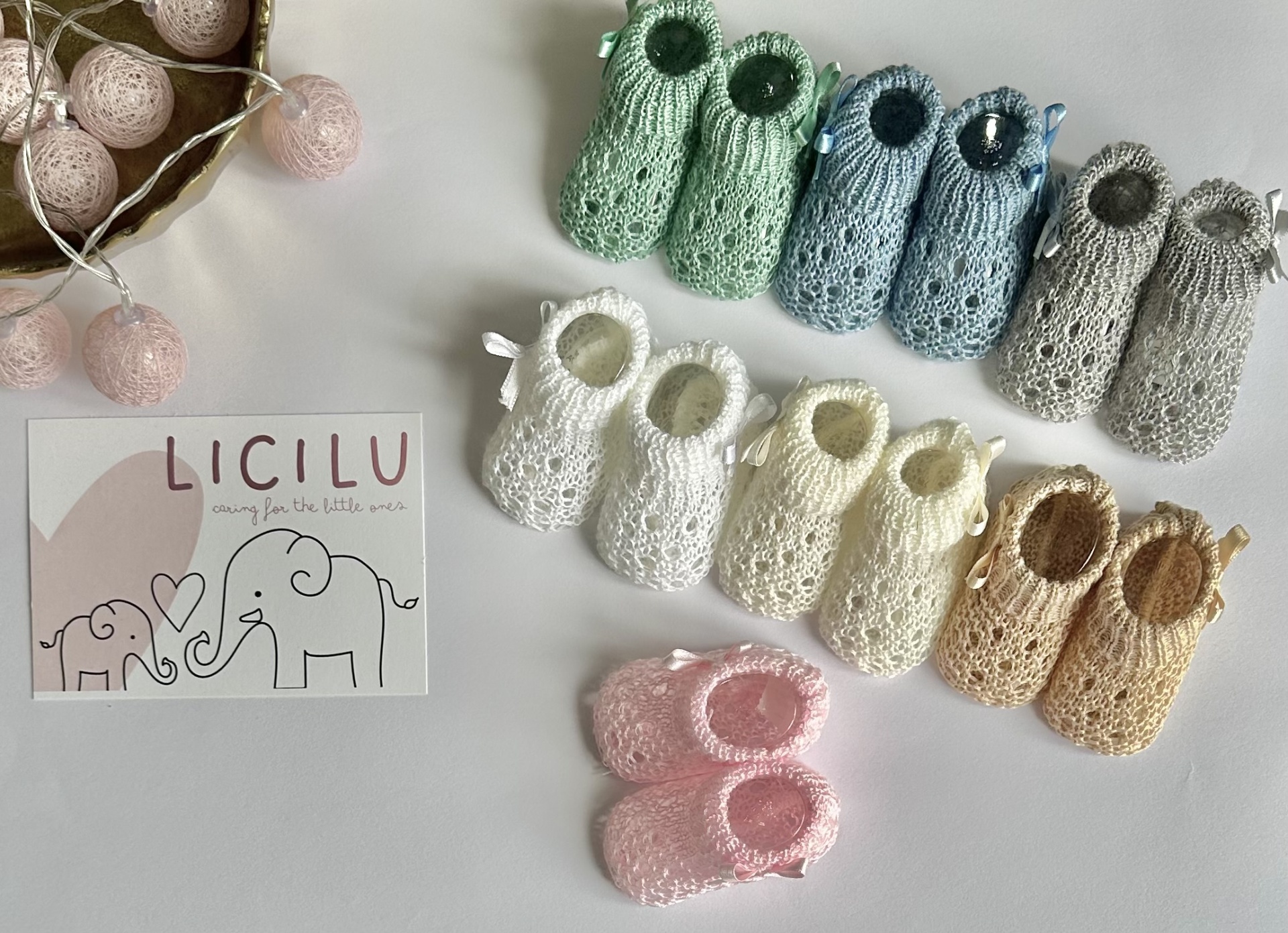 Carapins em Perlé em malha aberta, decorados com lacinhos laterais.