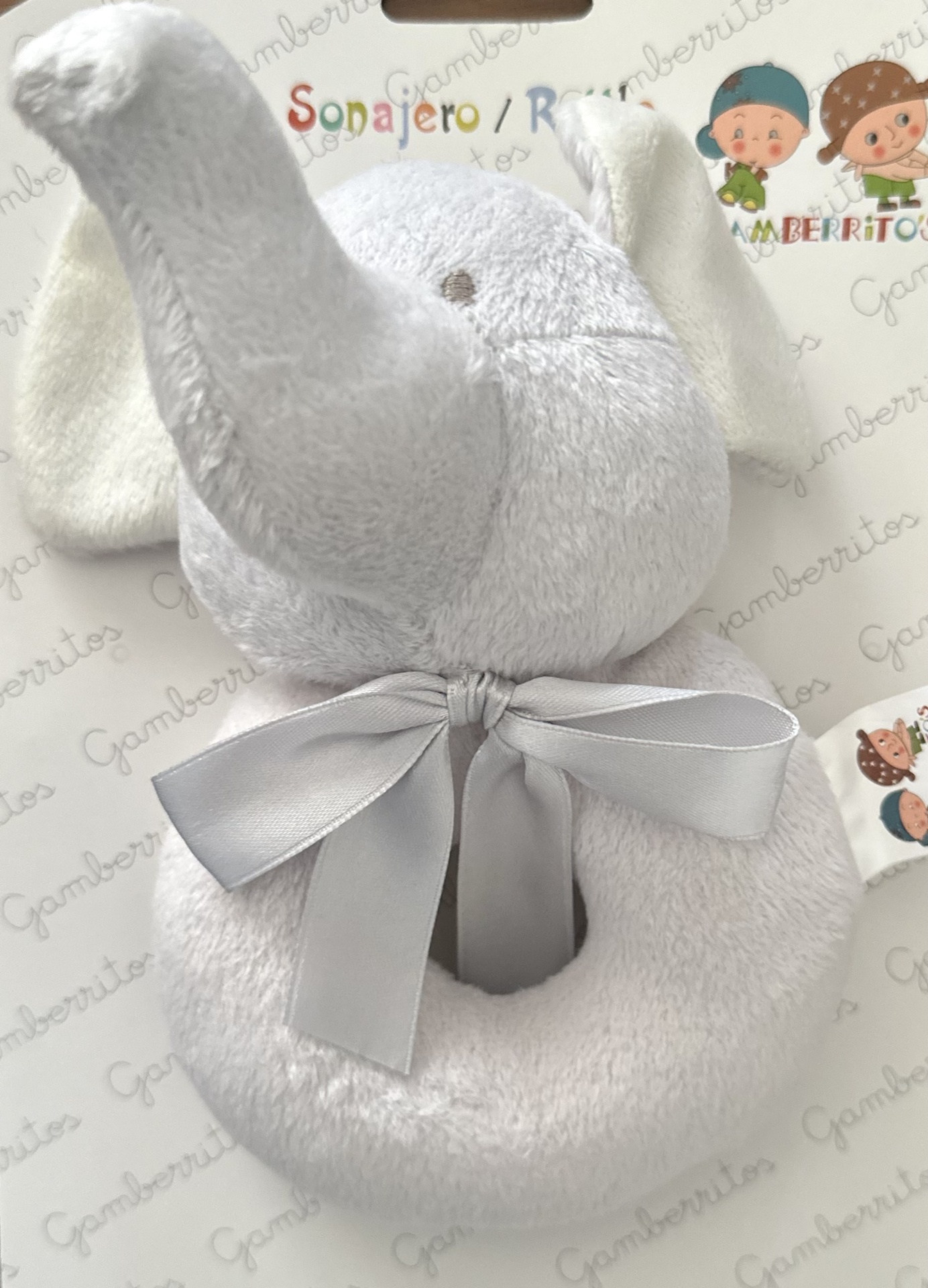 Chocalho de peluche em forma de elefante cinzento claro com laço cinzento