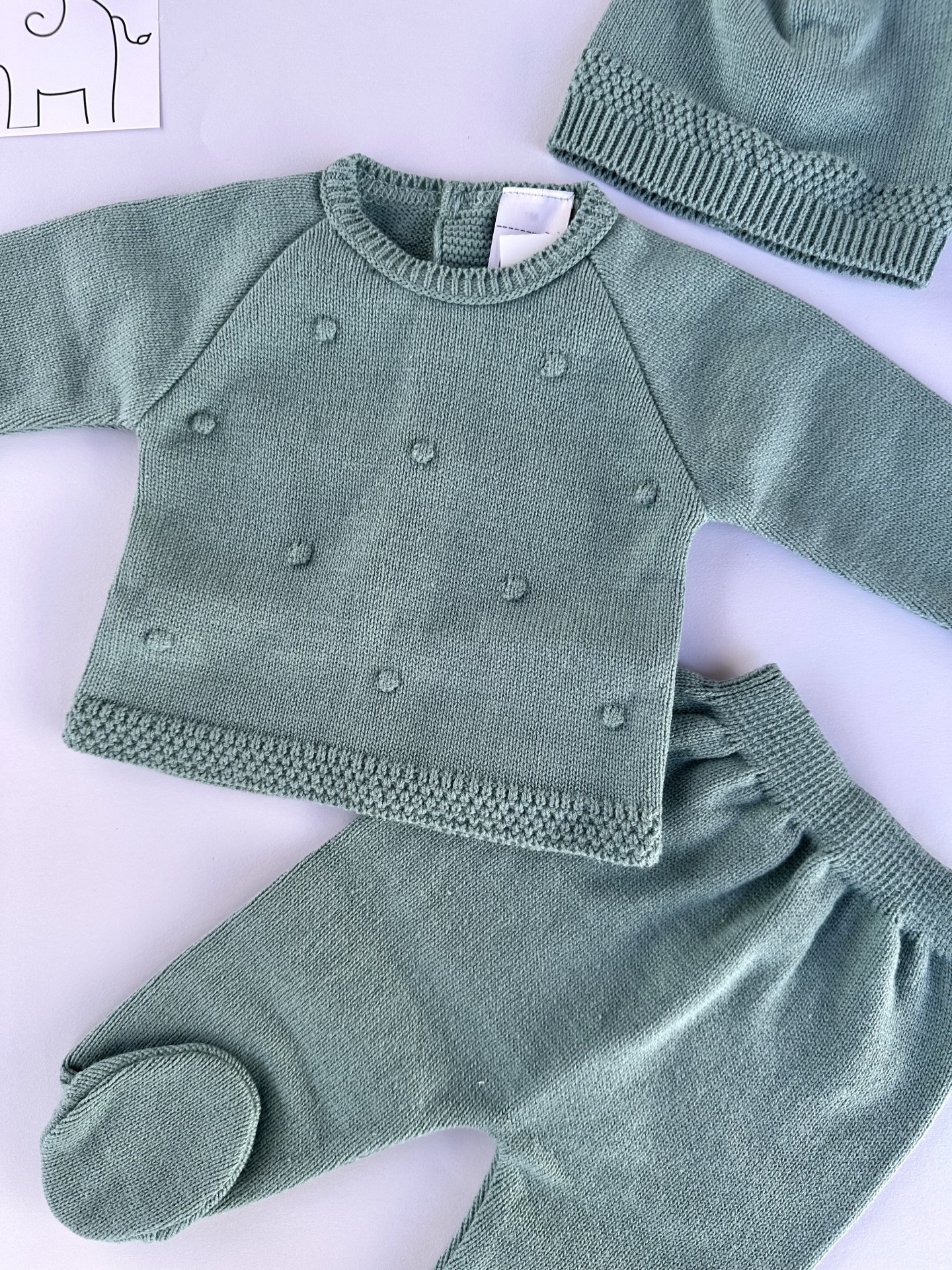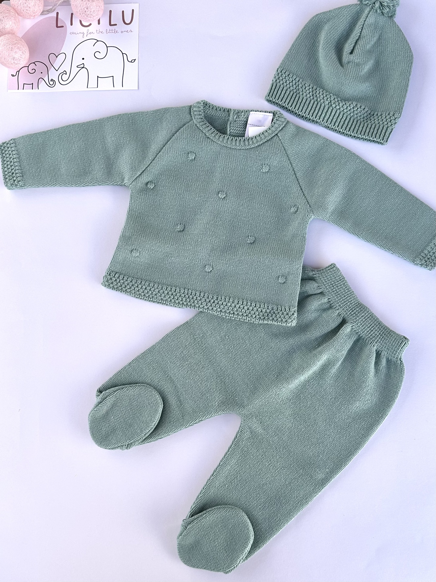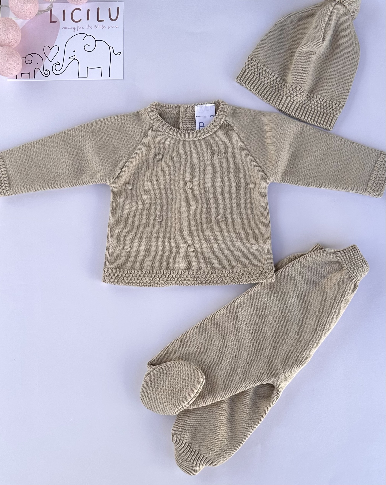 Conjunto composto por três peças: gorro, blusa e calças.