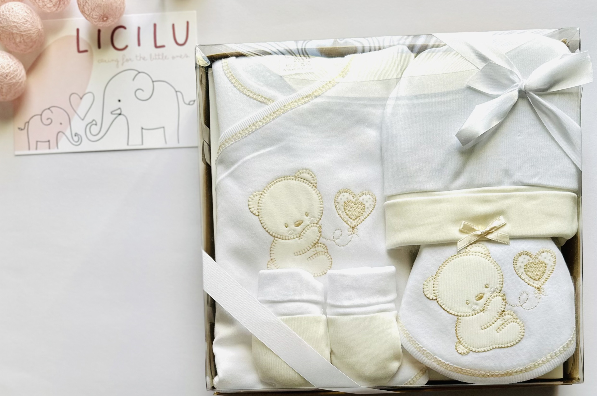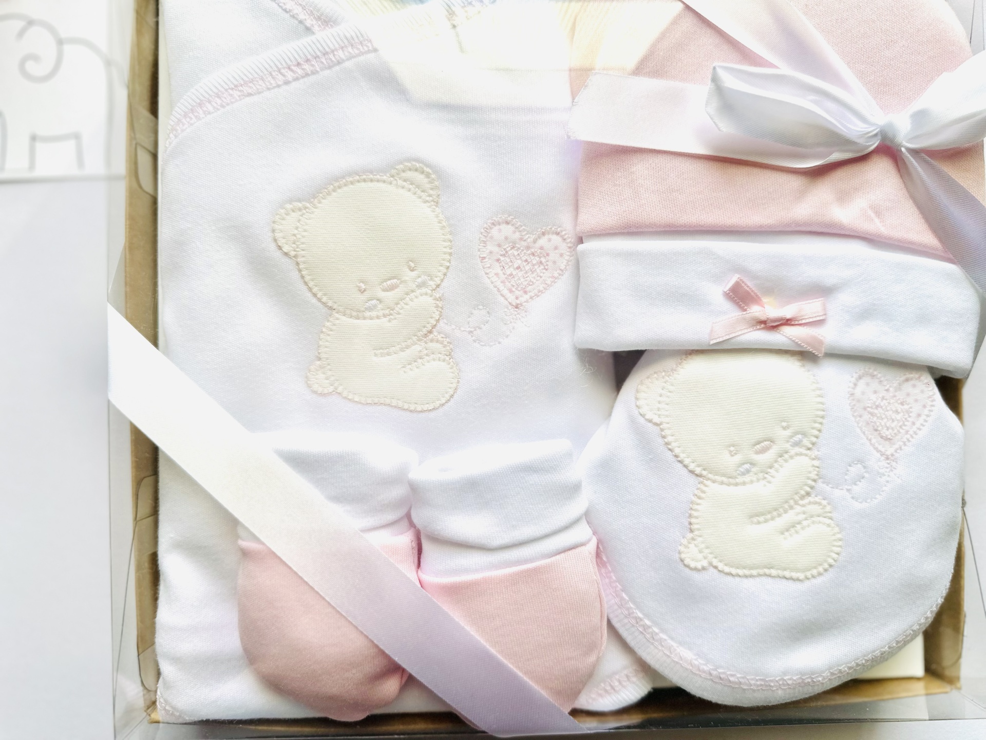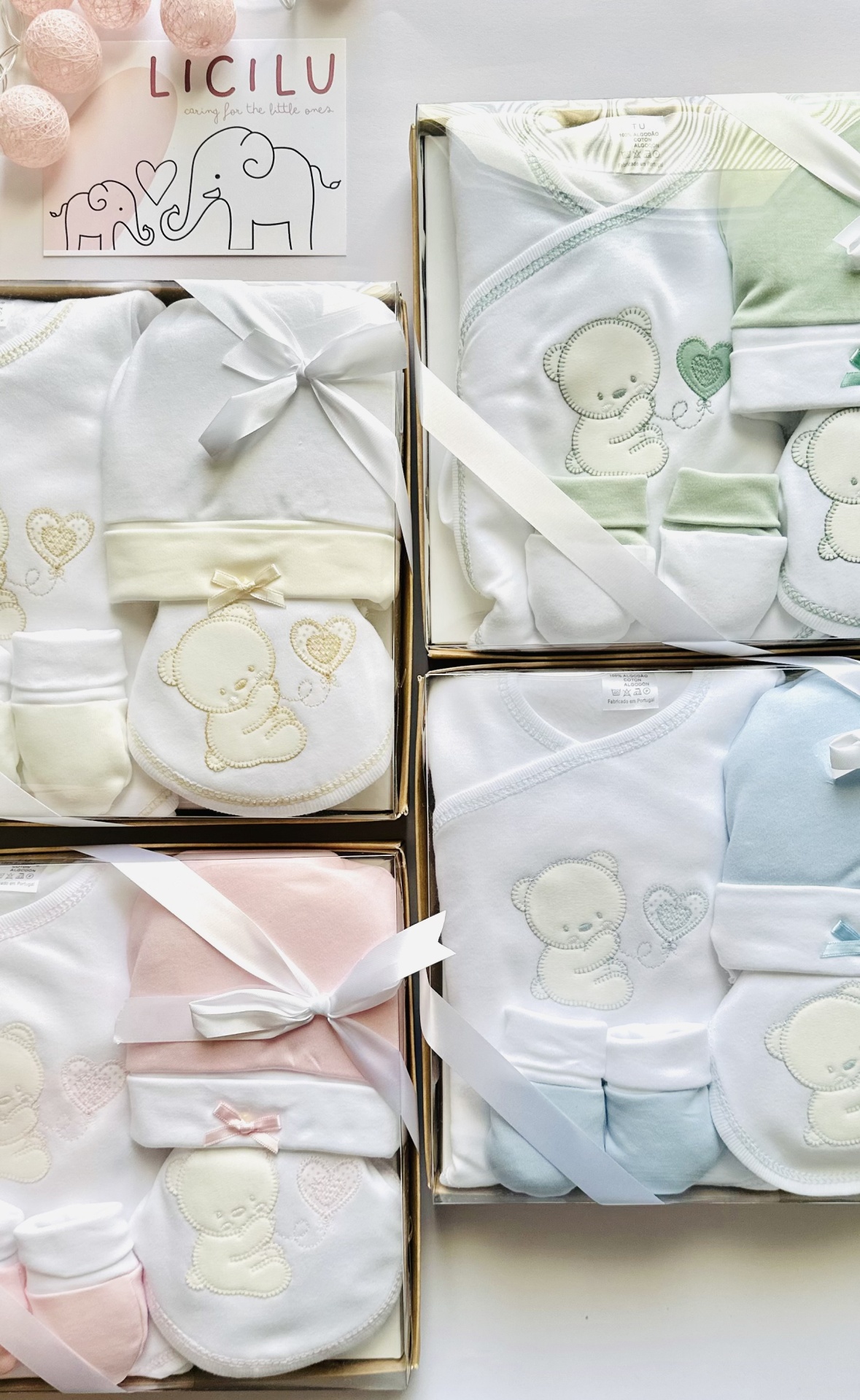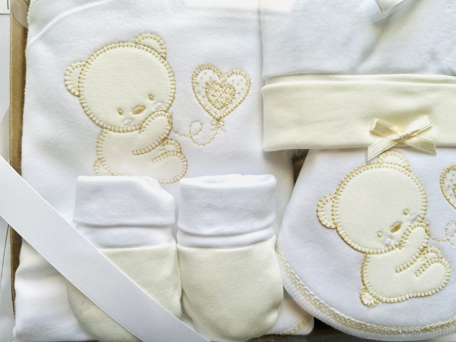 Conjunto de interiores para bebé decorado com ursinho com balão em formato de coração.