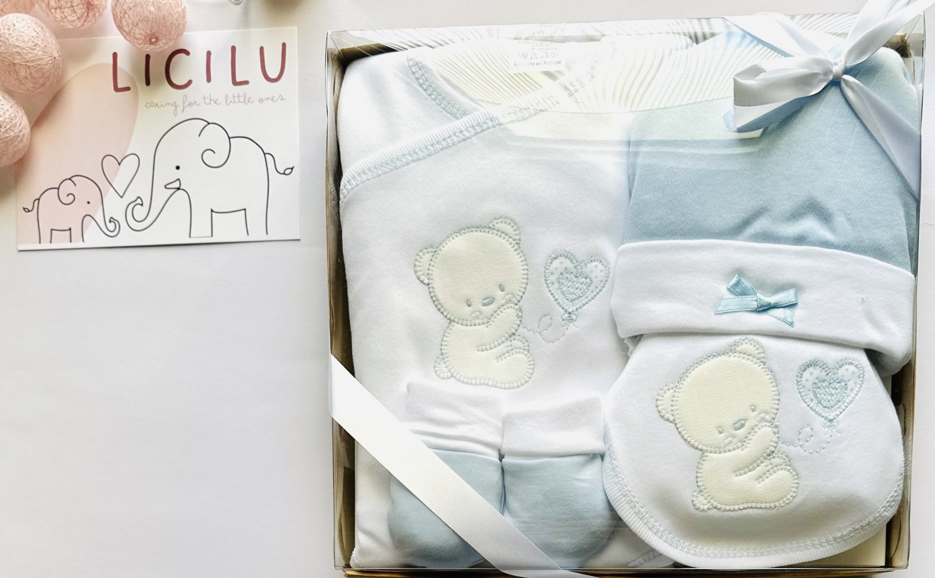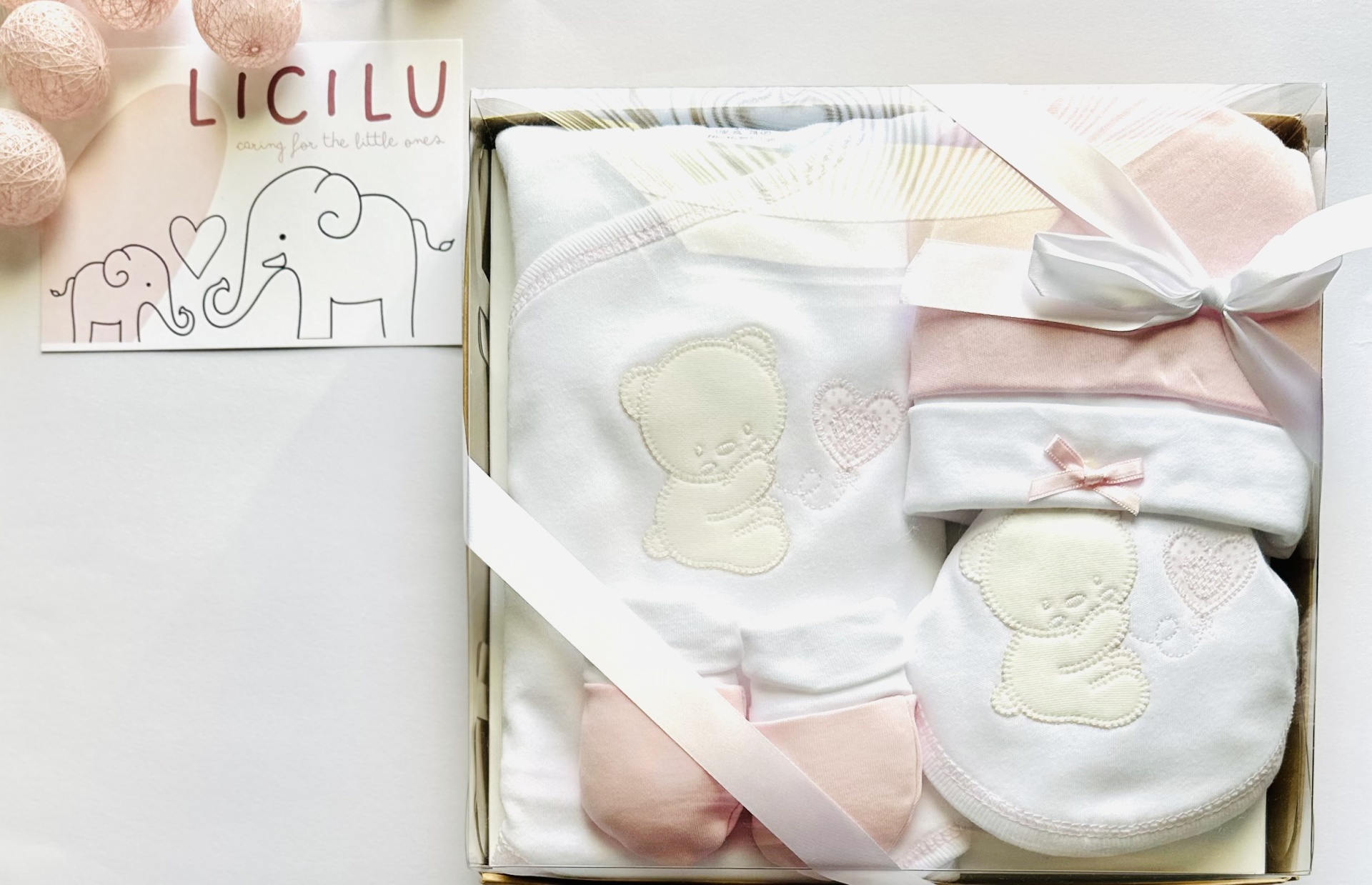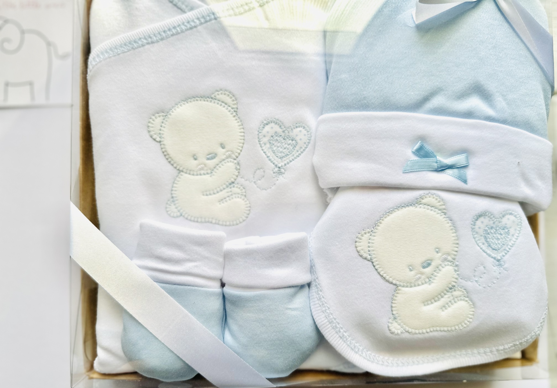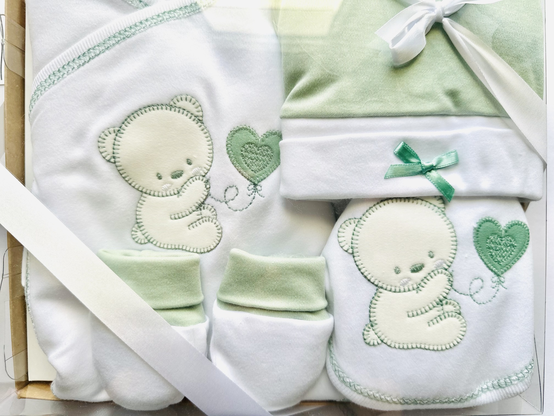Conjunto de interiores para bebé decorado com ursinho com balão em formato de coração.