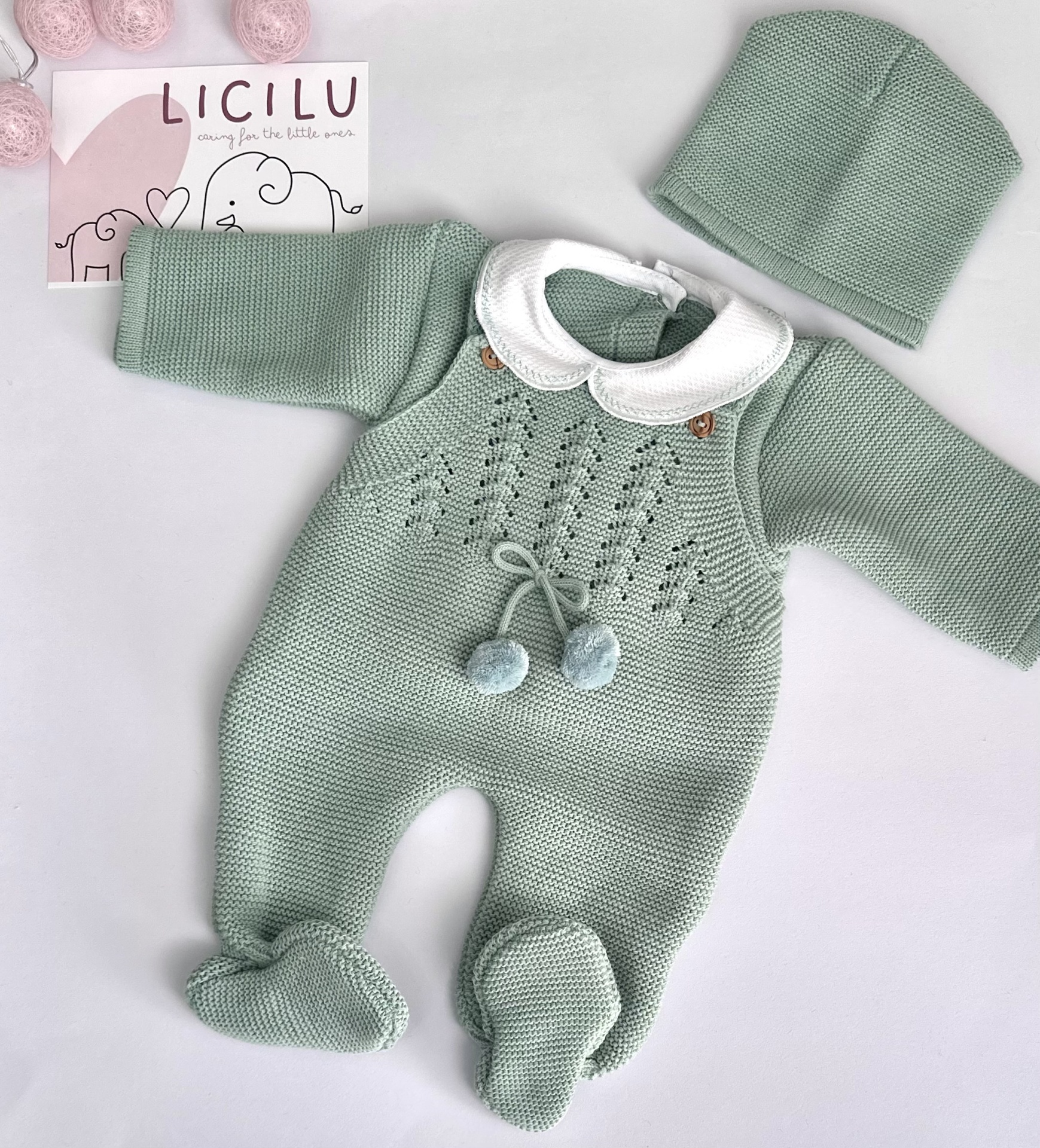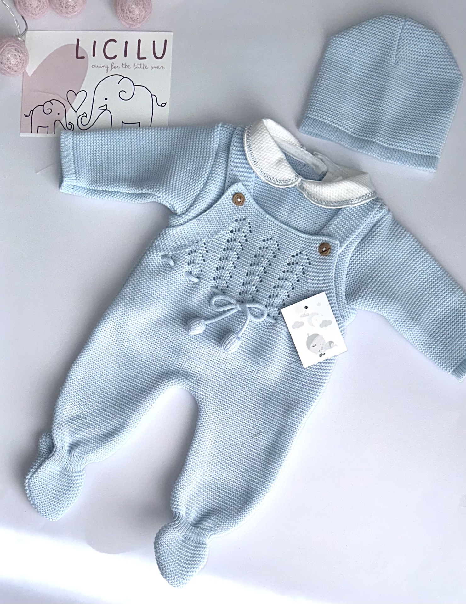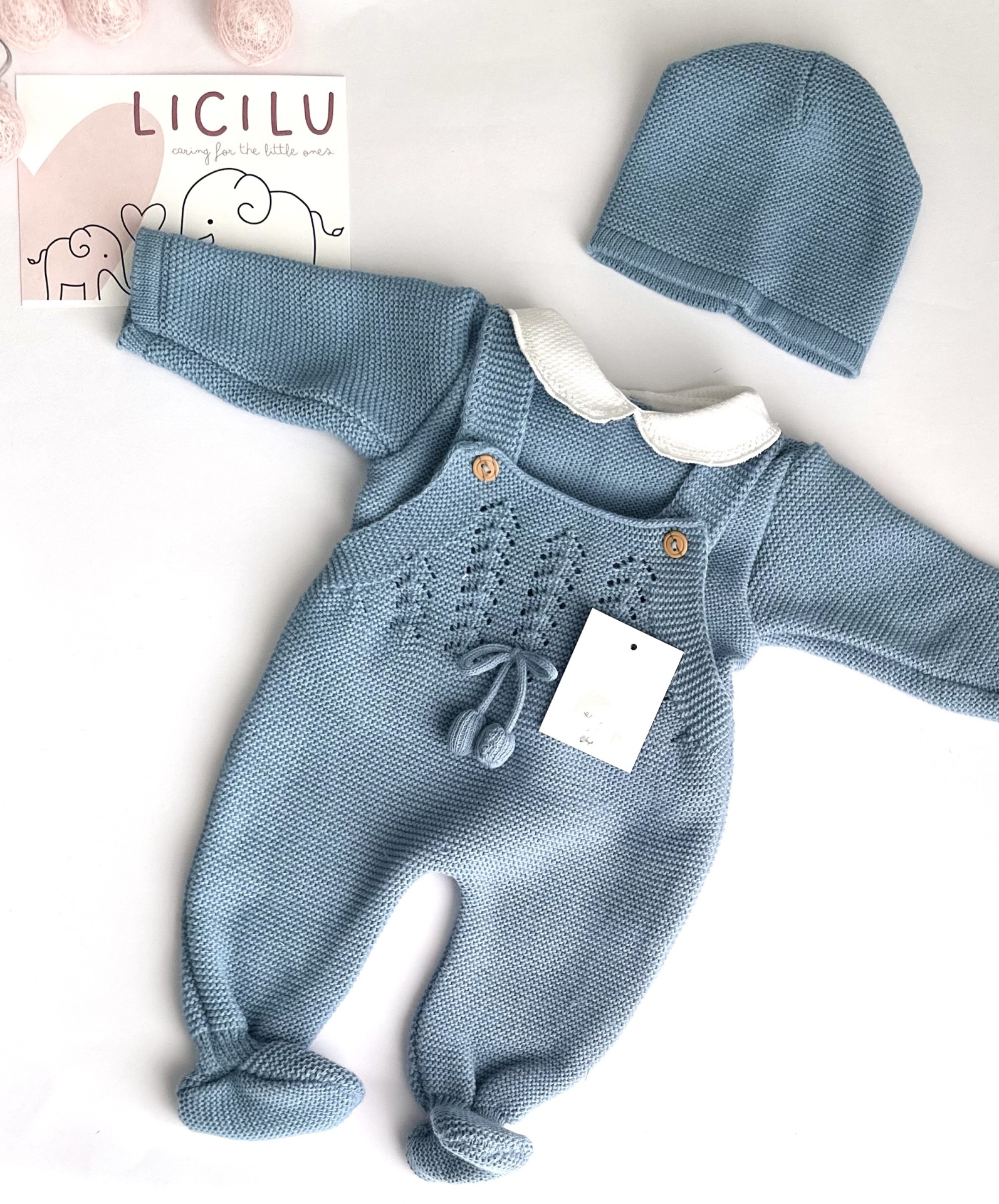 Conjunto de malha Outono/Inverno composto por: jardineira, camisola e gorro.