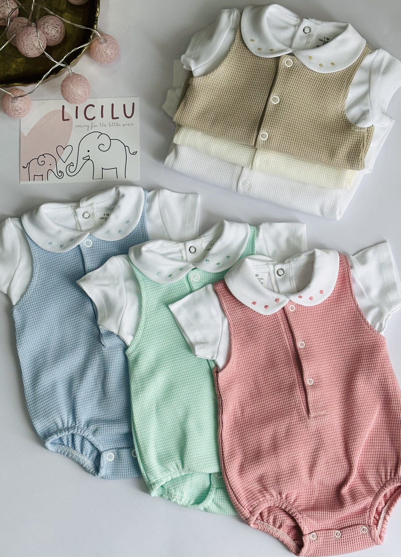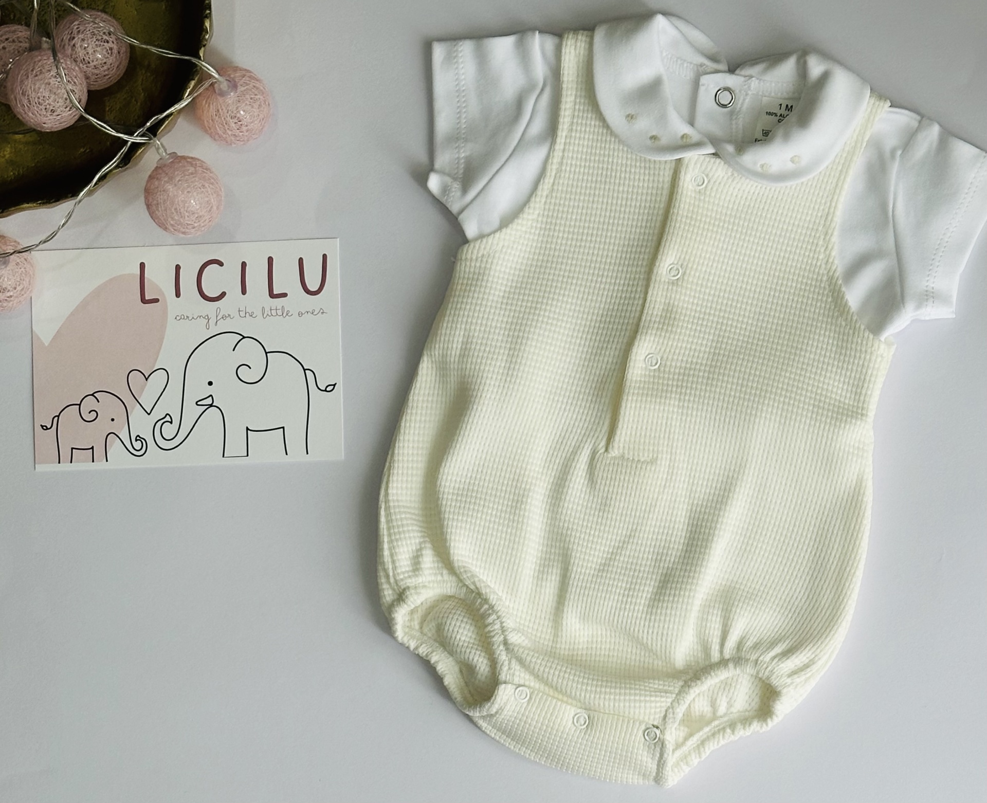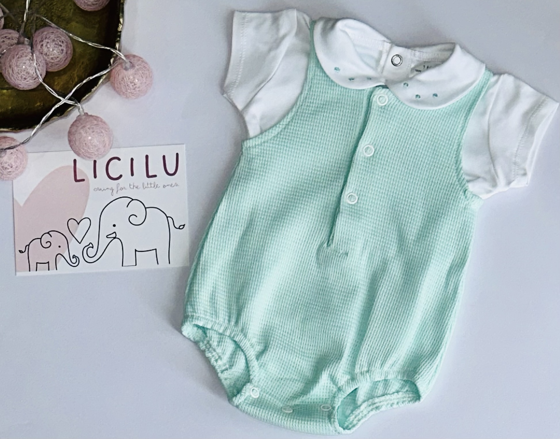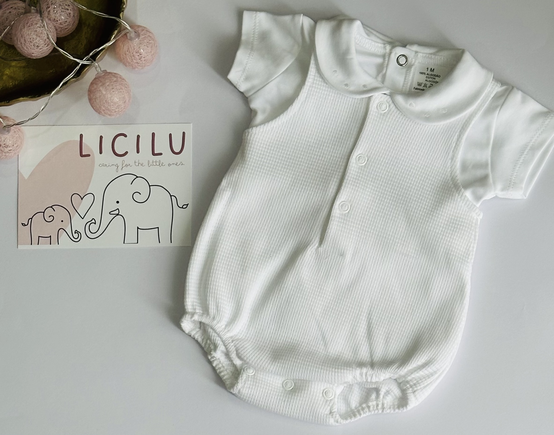 Conjunto de verão composto por camisola com golinha aberta e fofo caveado.