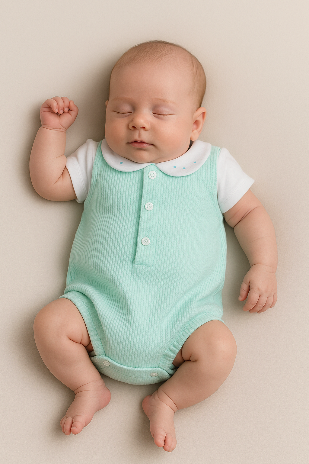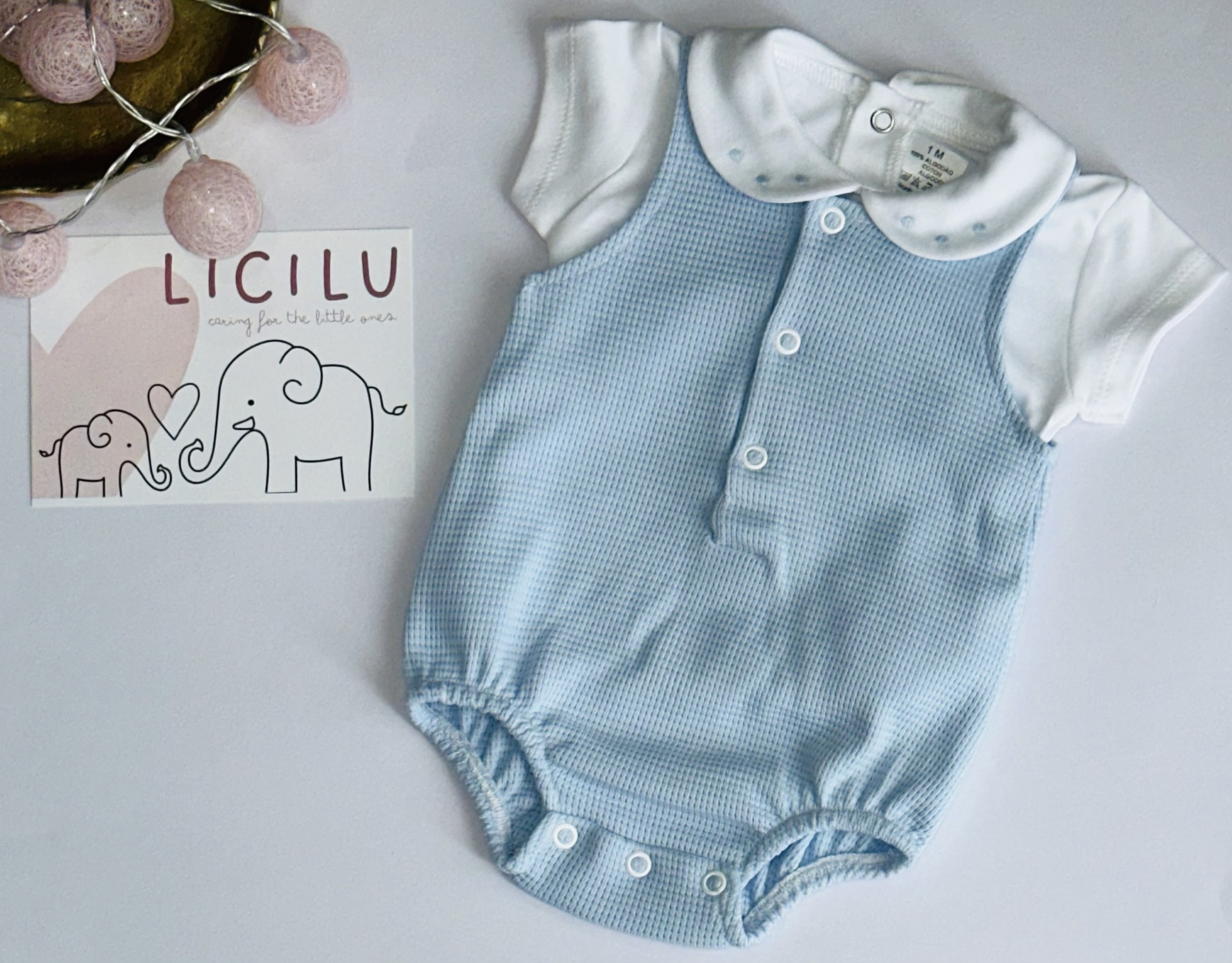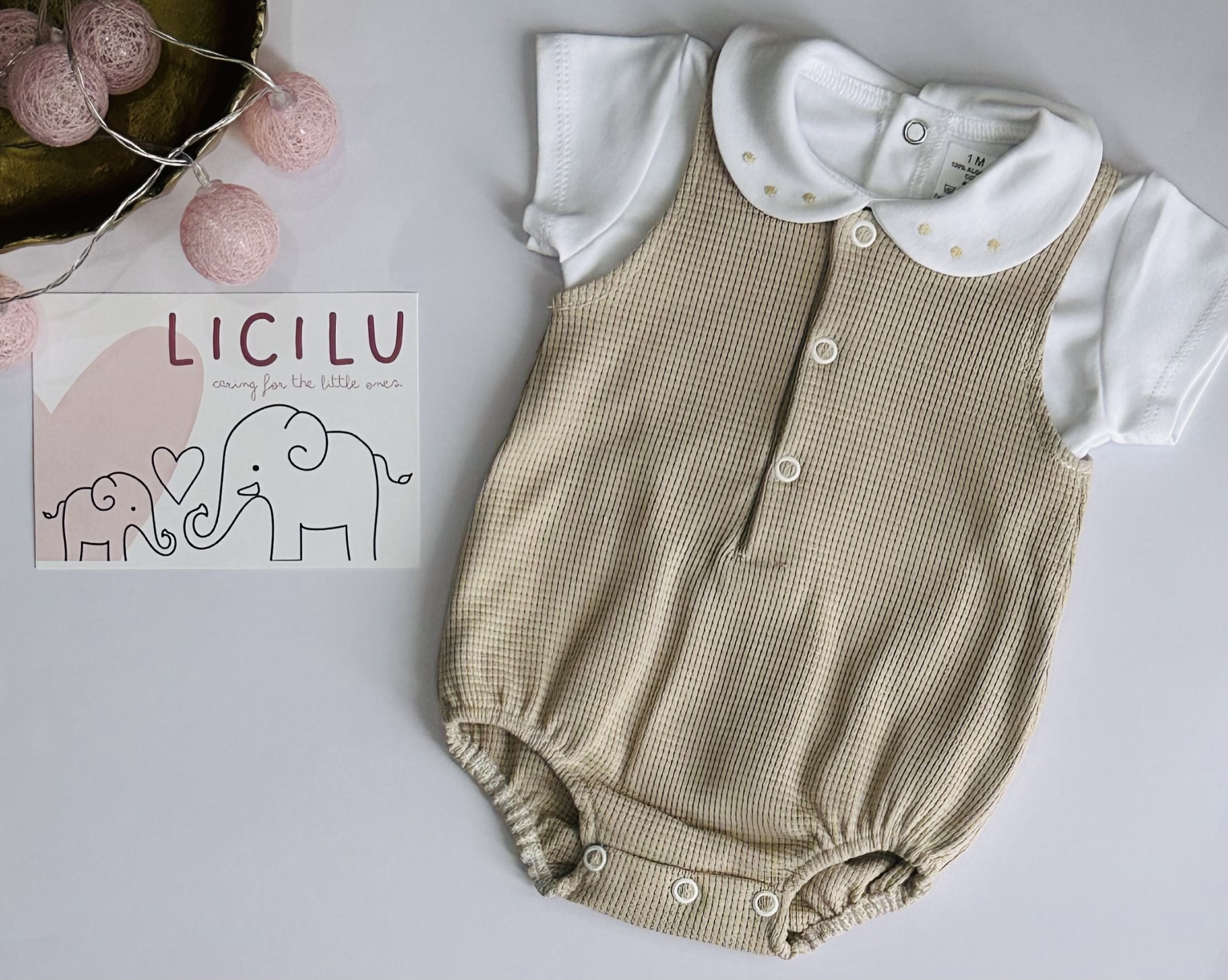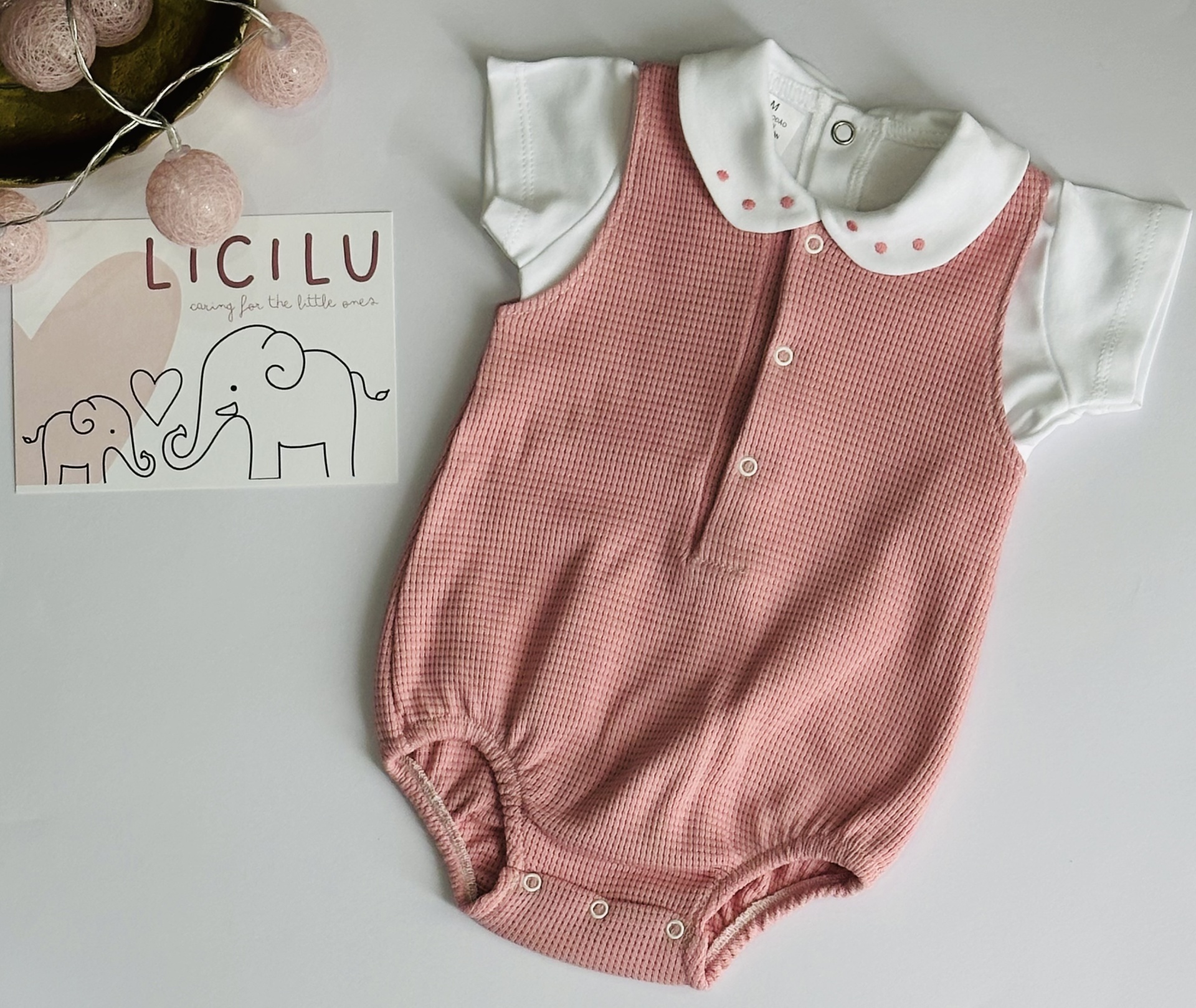 Conjunto de verão composto por camisola com golinha aberta e fofo caveado.