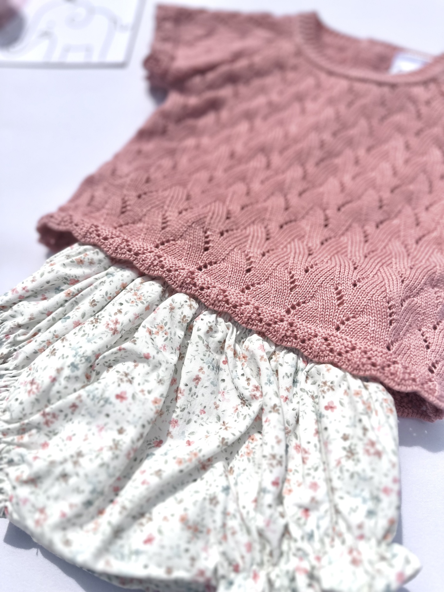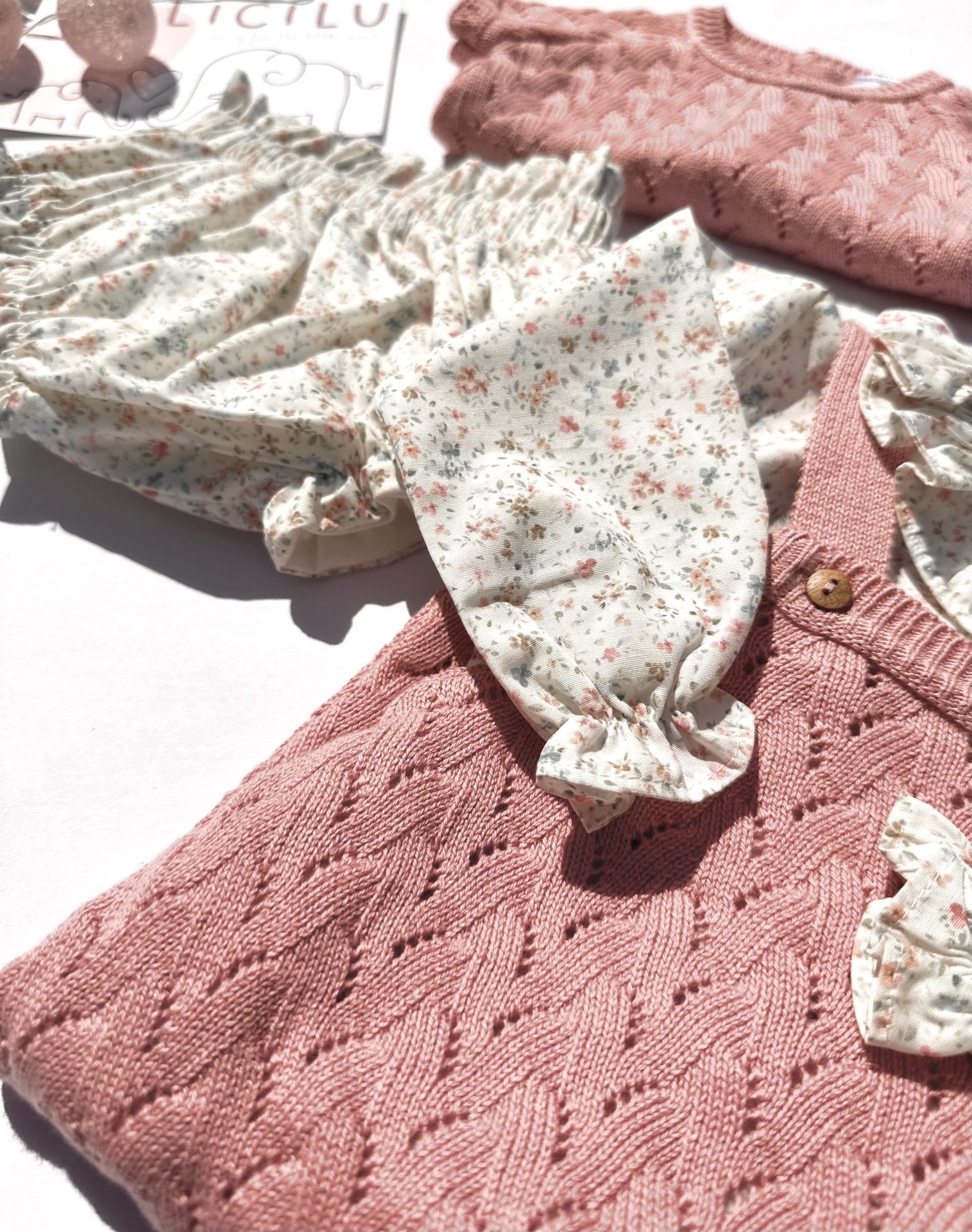 Conjunto de camisola de malha rosa velho e tapa-fraldas com padrão 'sweetness'.