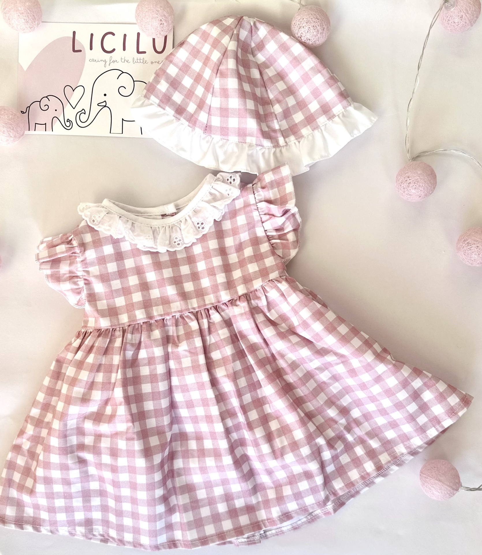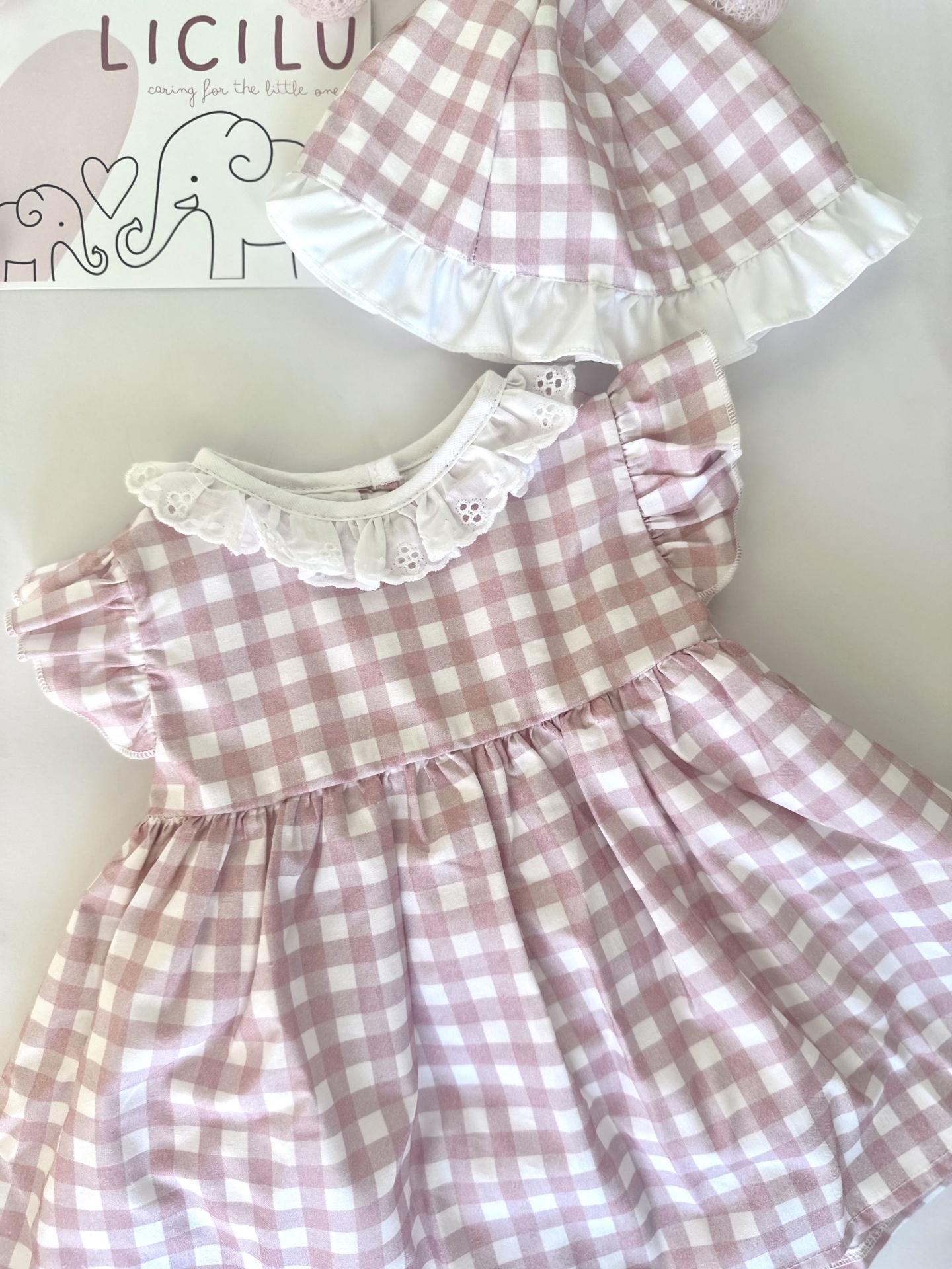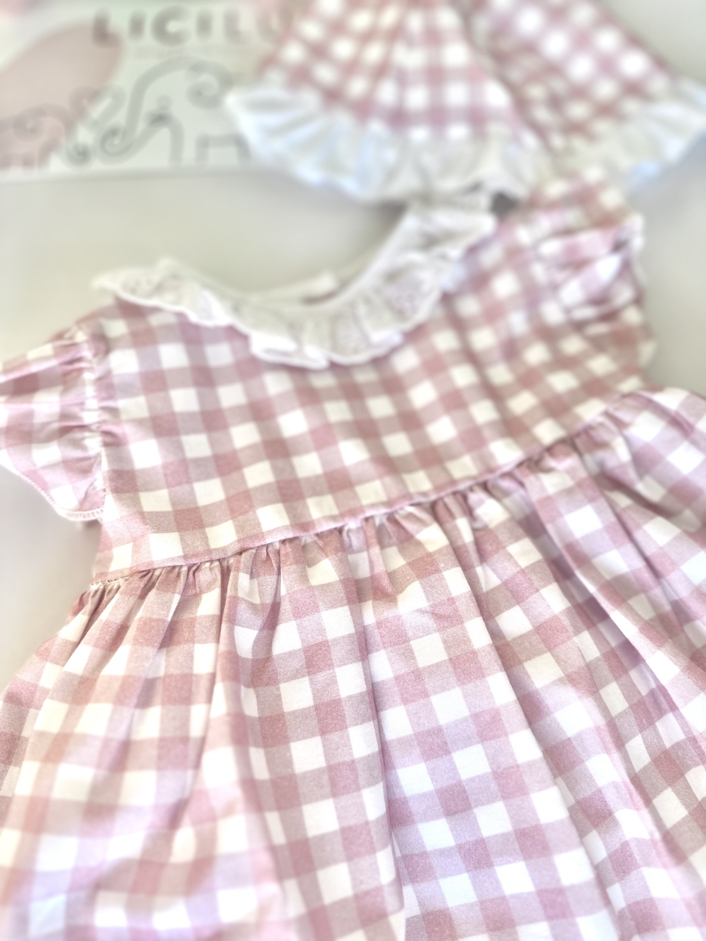 Têm padrão em xadrez rosa velho com branco. O vestido tem ainda uma golinha em branco tipo bordado inglês. Tem também um folho em cada um dos ombros nos mesmos tons do xadrez.