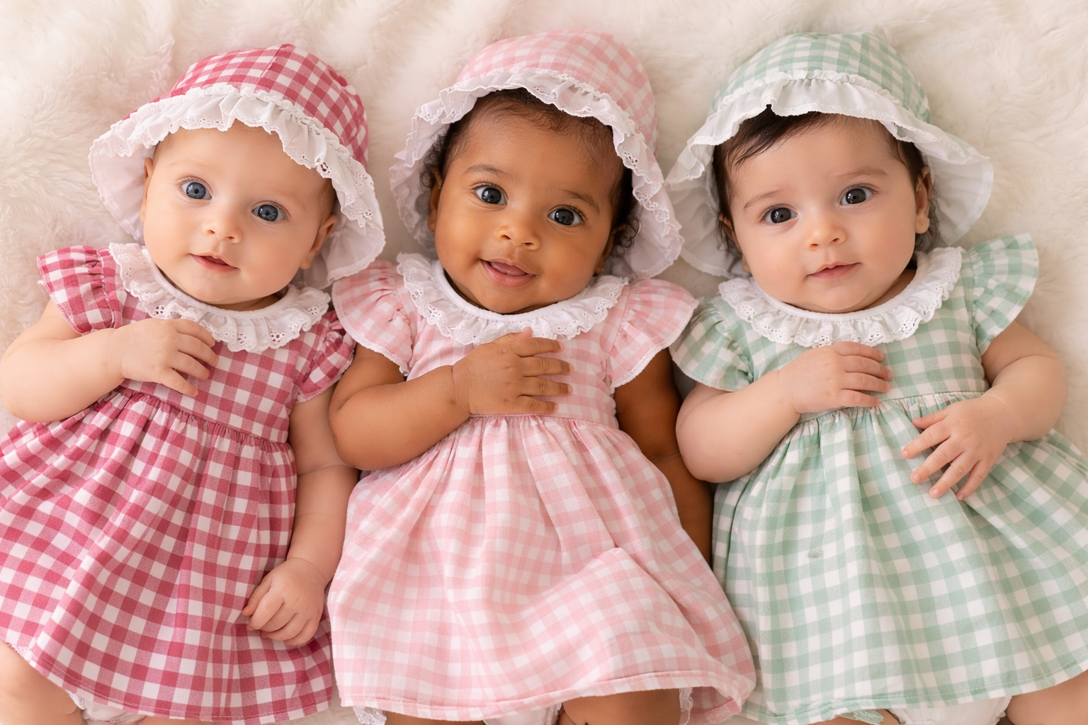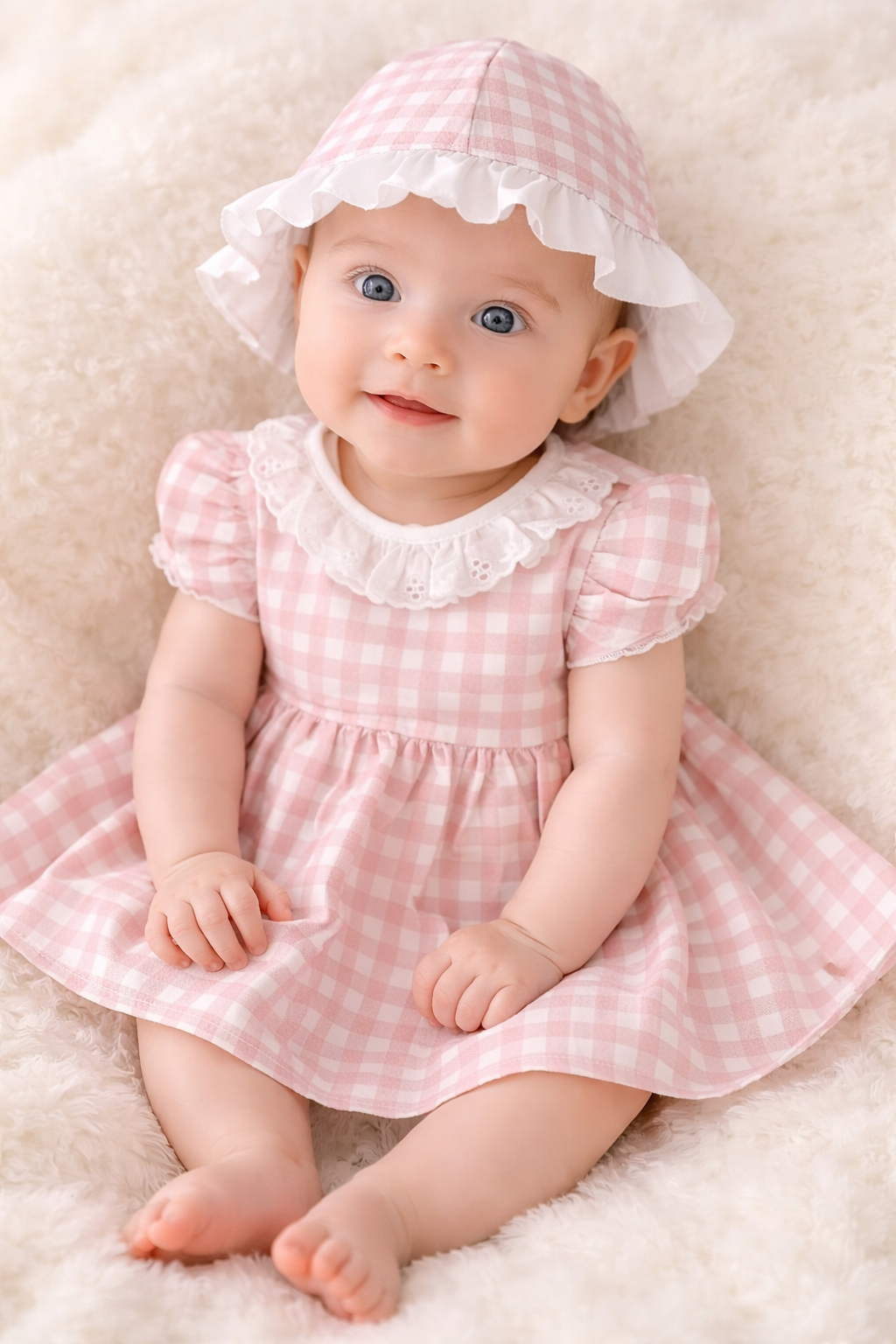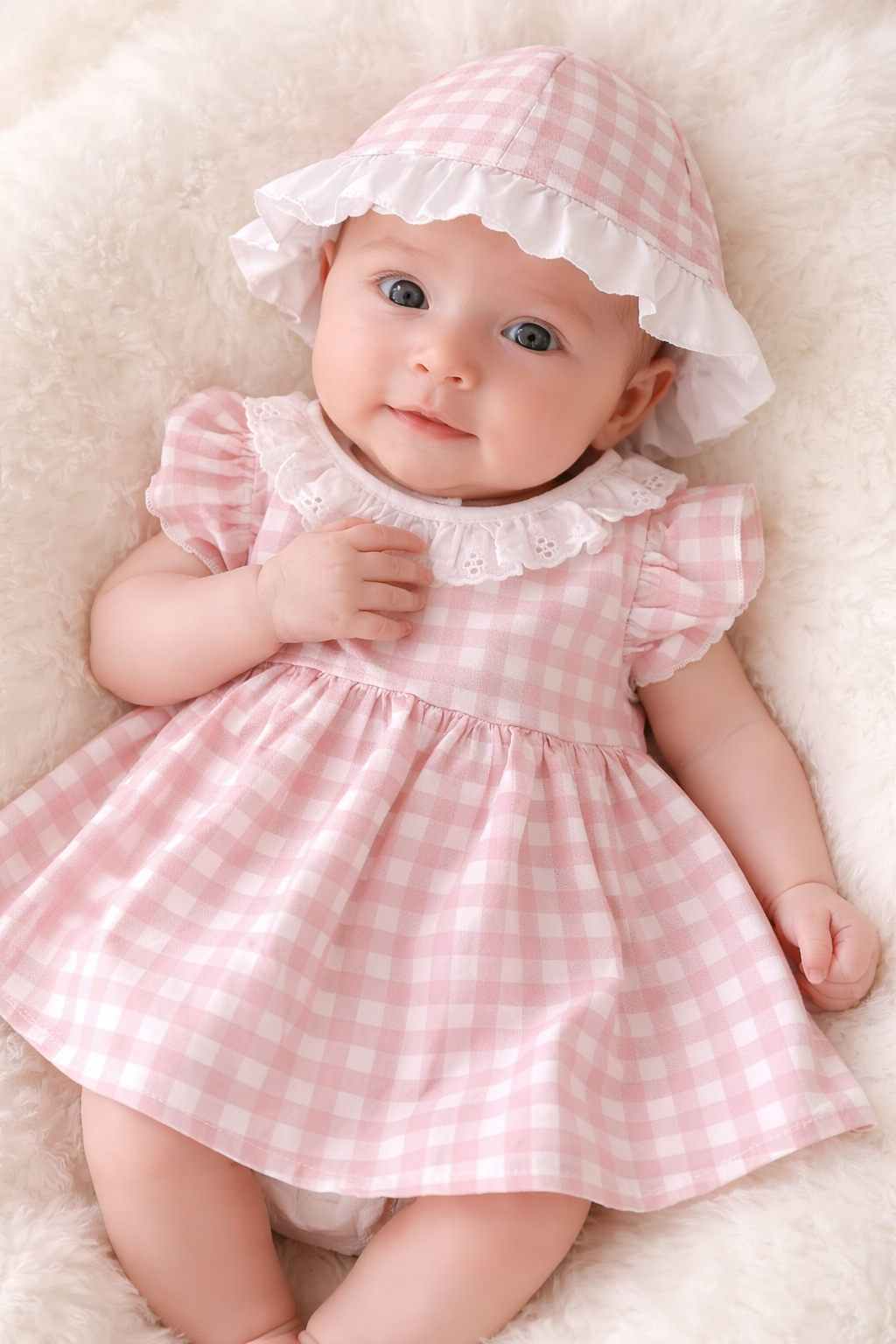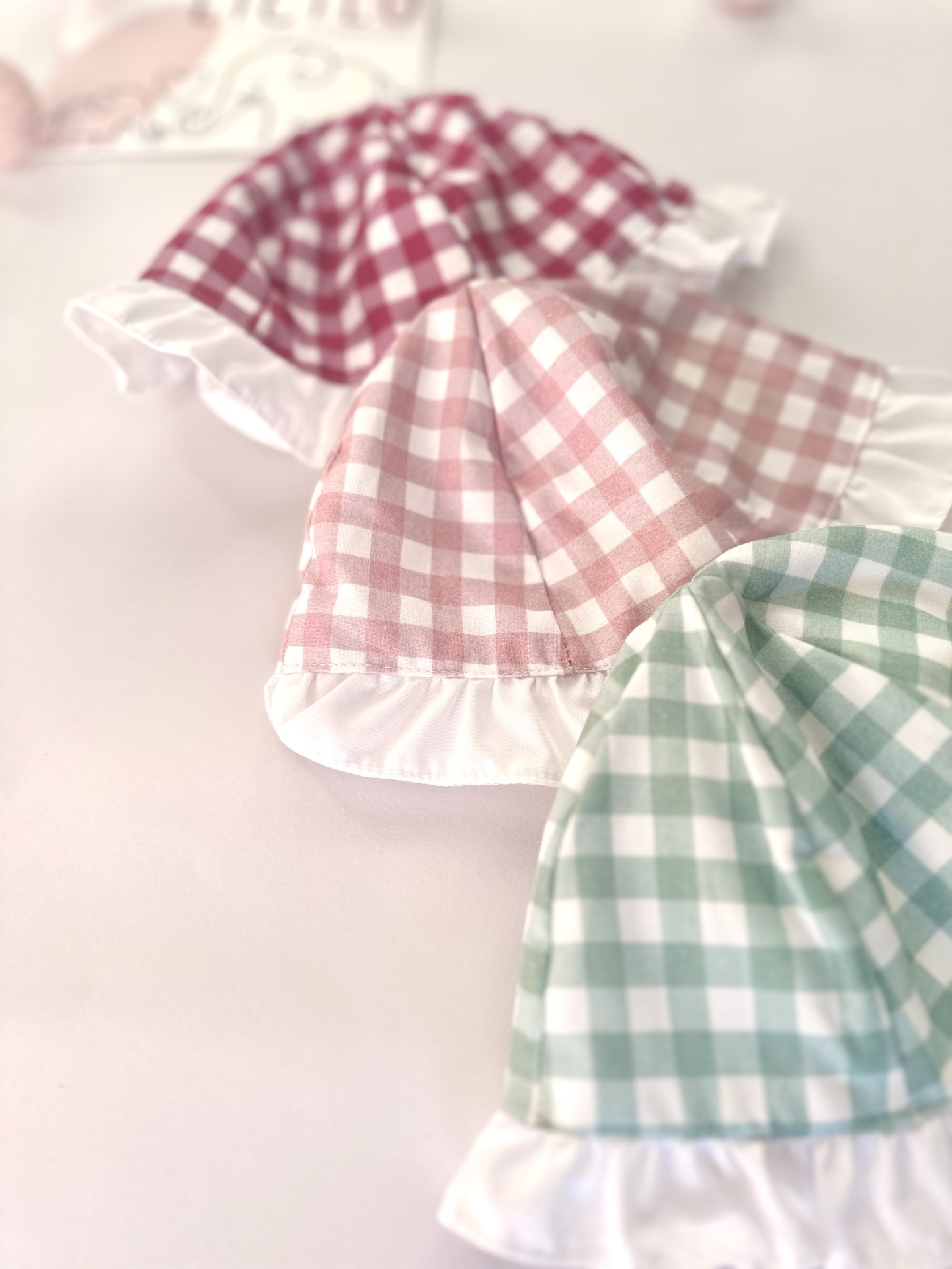 Têm padrão em xadrez rosa velho com branco. O vestido tem ainda uma golinha em branco tipo bordado inglês. Tem também um folho em cada um dos ombros nos mesmos tons do xadrez.