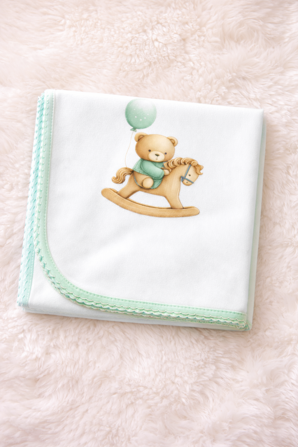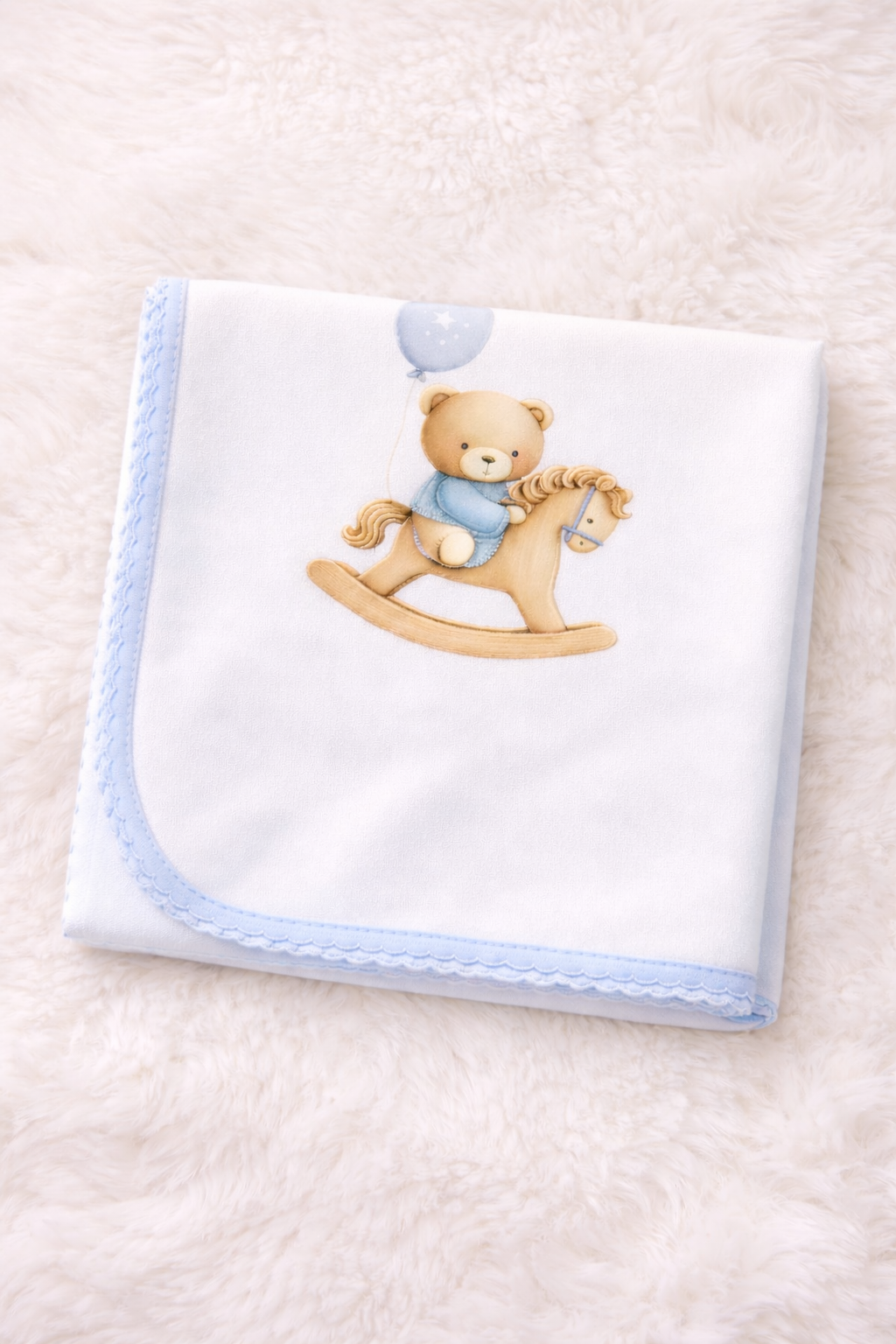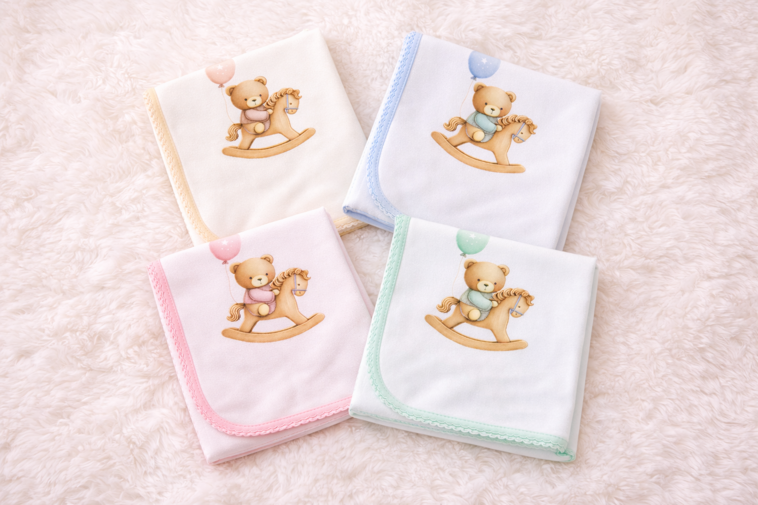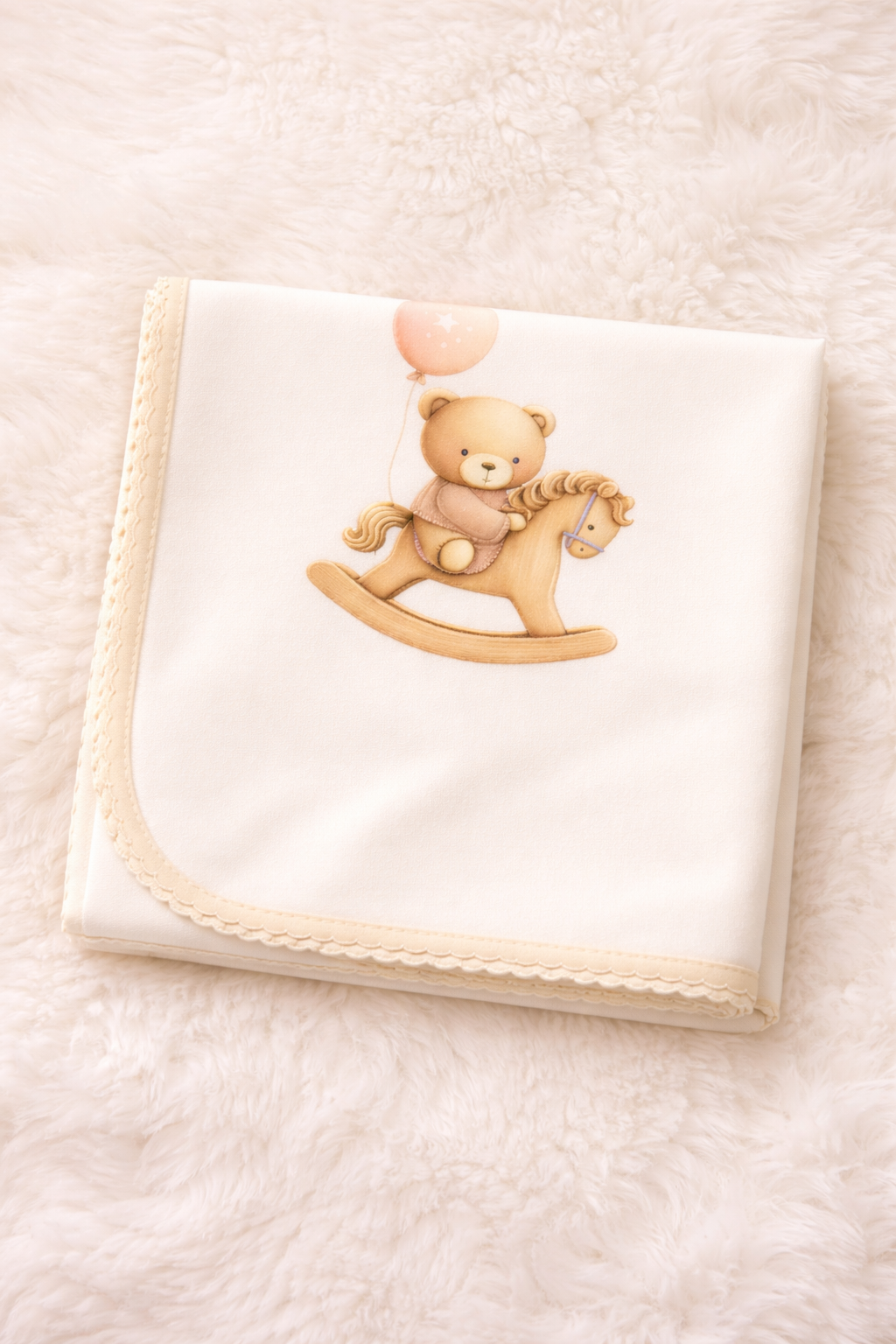 Fralda de pano decorada com motivo da coleção do urso com balão e cavalinho de madeira.