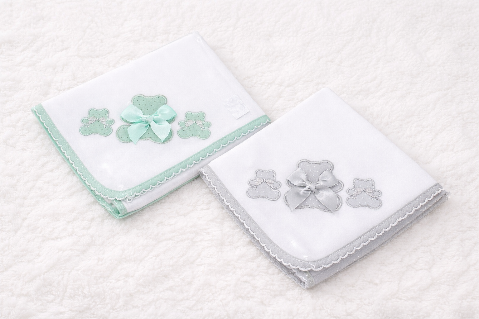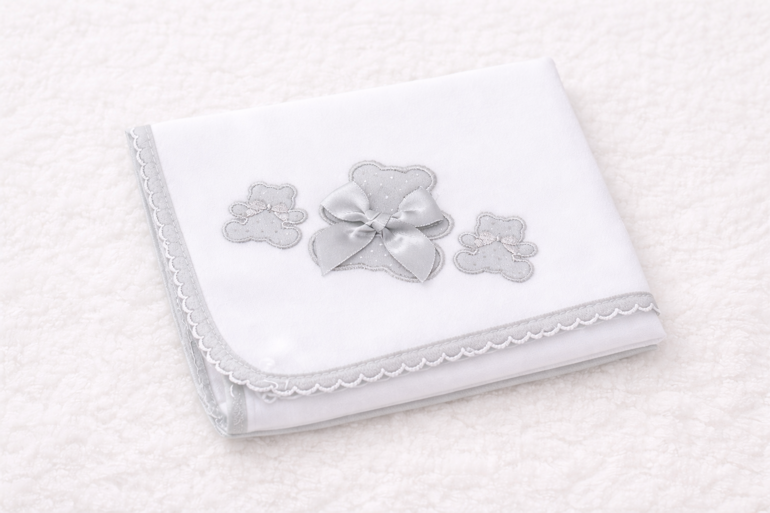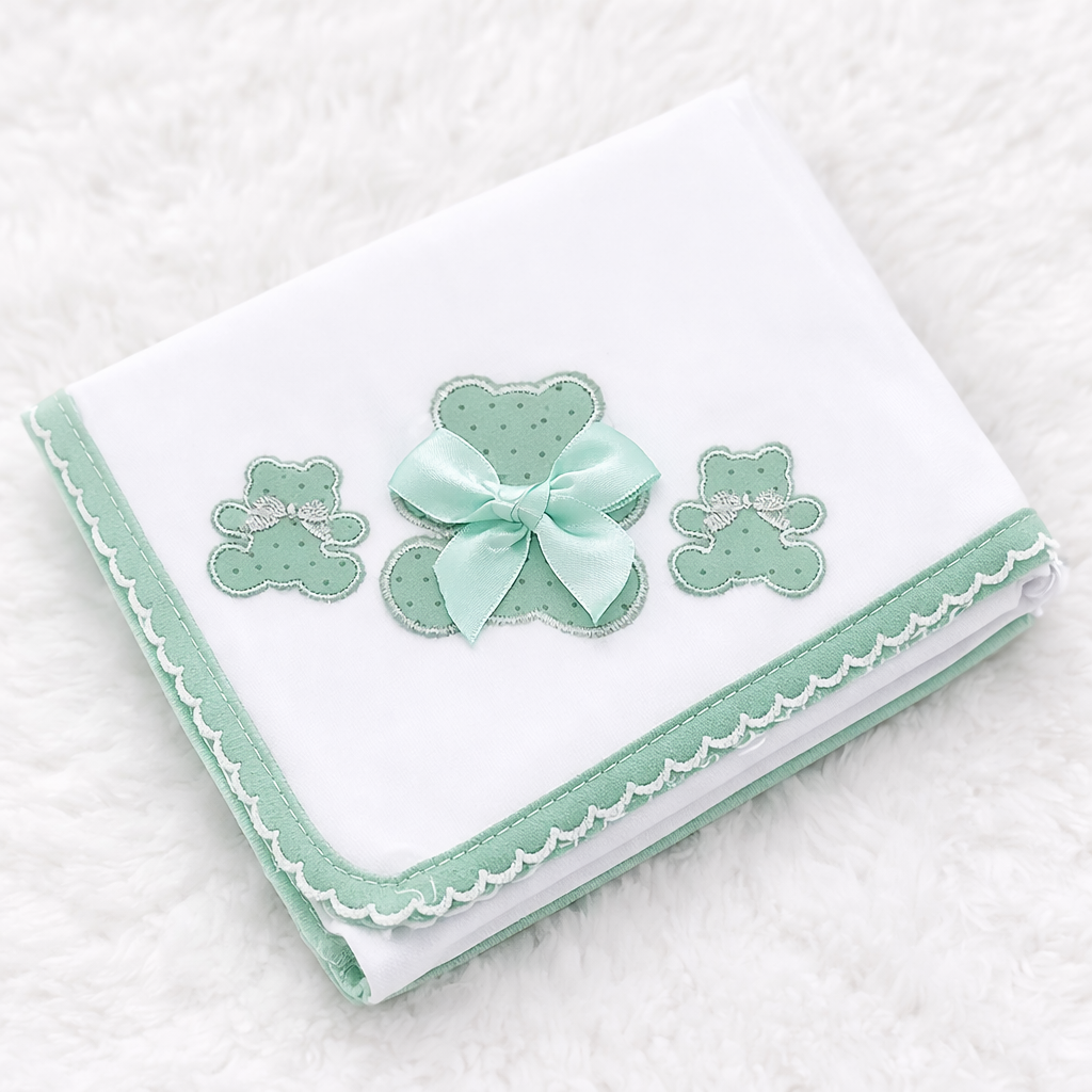 Fralda de pano decorada com três ursinhos bordados, tendo o do meio um laço tipo cetim.