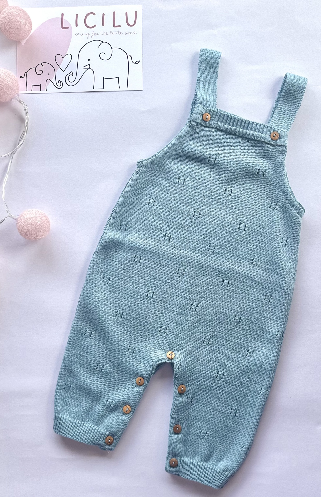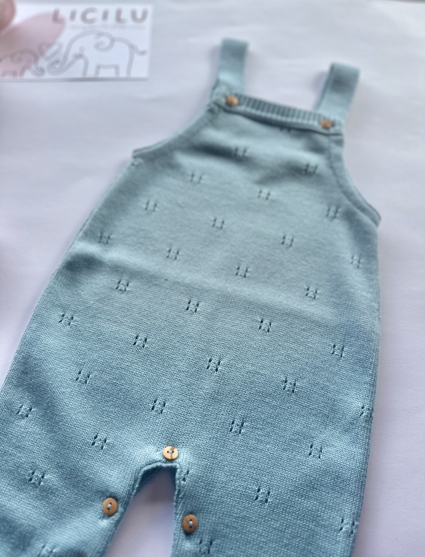 Macacão de malha com botões amadeirados nas alças e nas pernas.