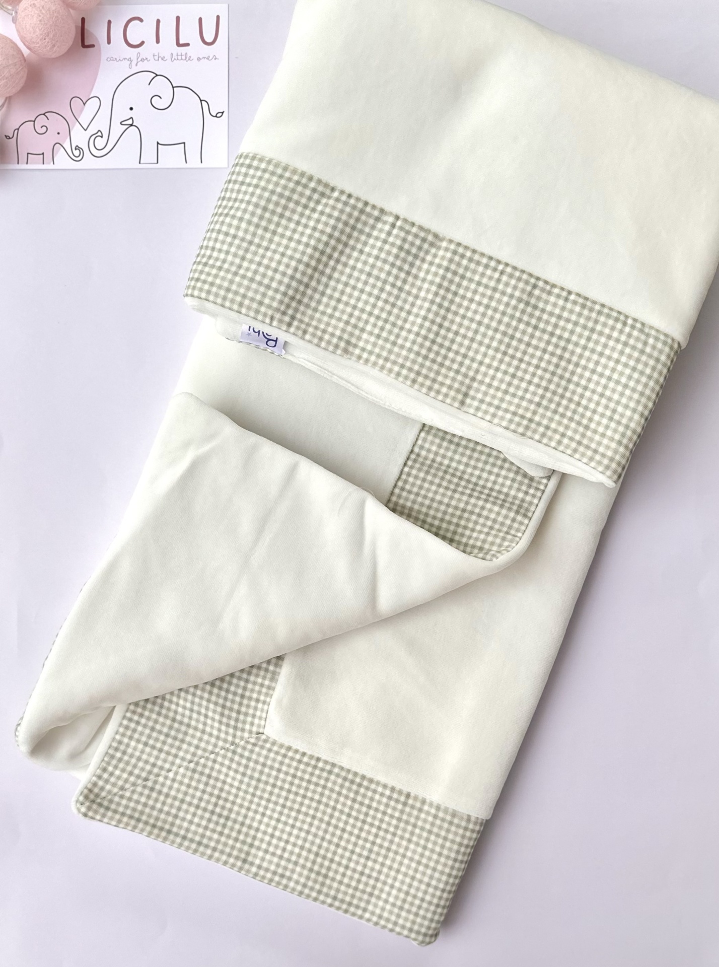 Manta de algodão laminado tipo 'veludo' decorada com padrão xadrez tudo em tons de verde/neutros.