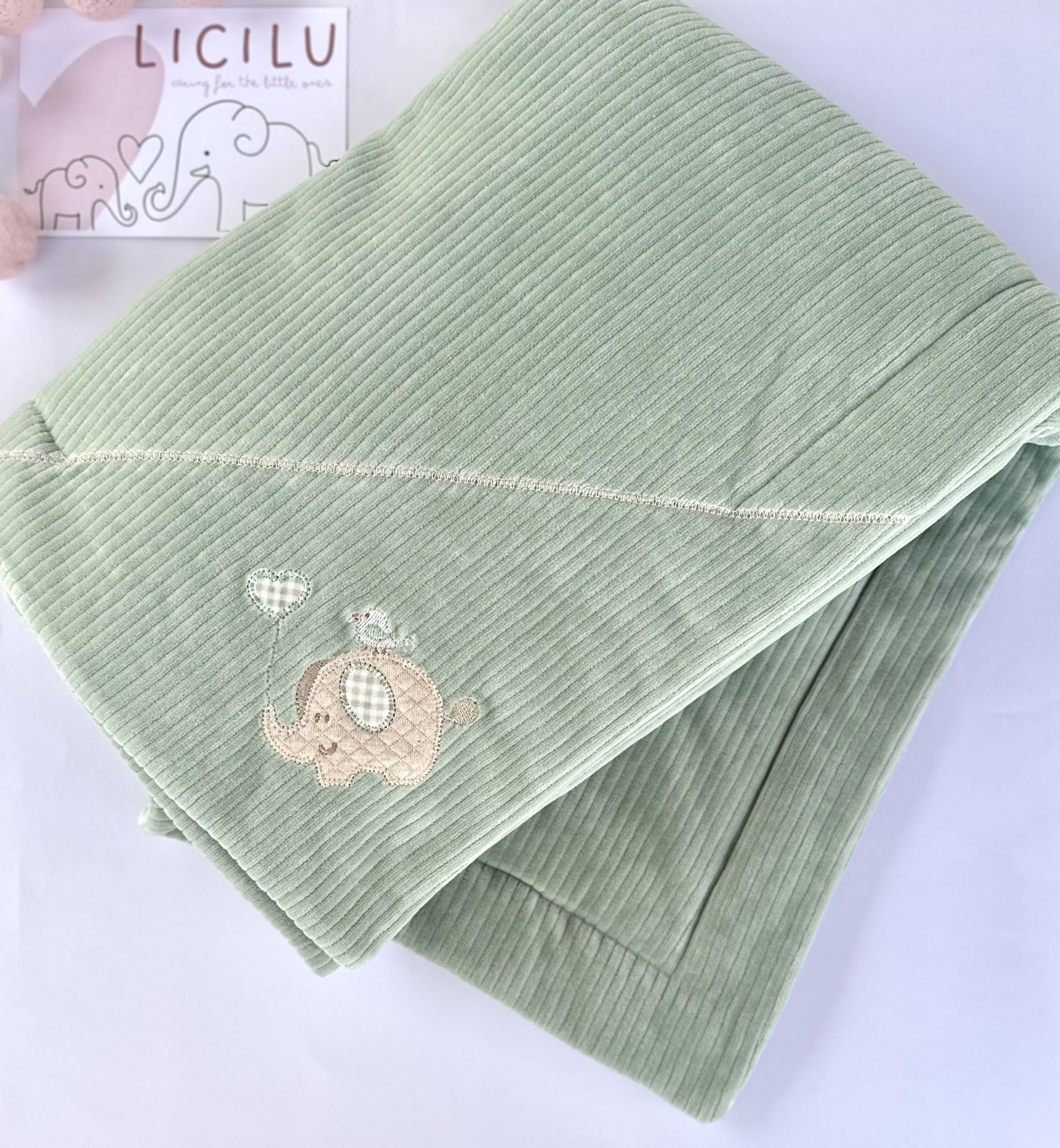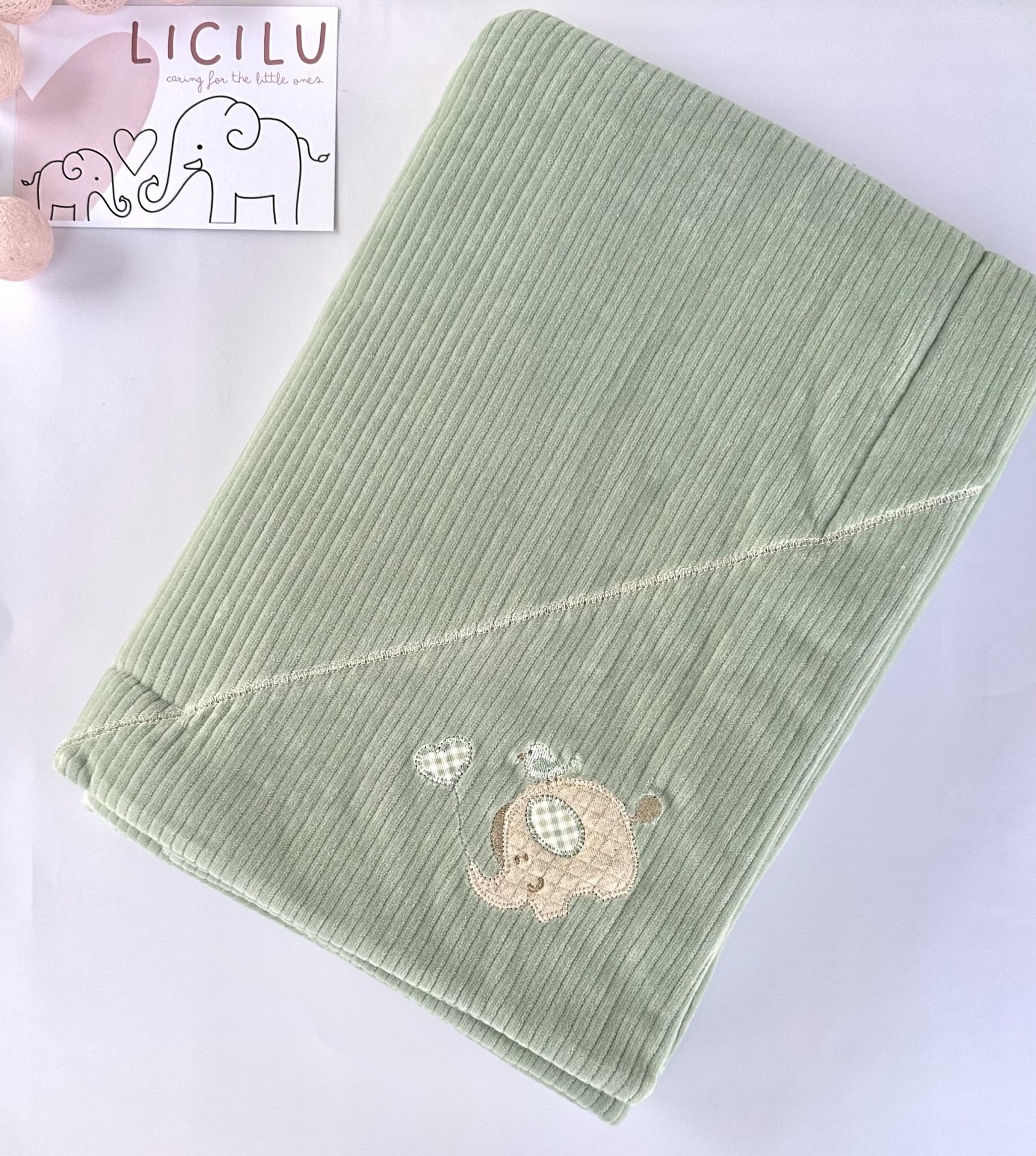 Manta de algodão laminado tipo 'veludo' decorada com um elefante, um coração e um passarinho, tudo em tons de verde/neutros.