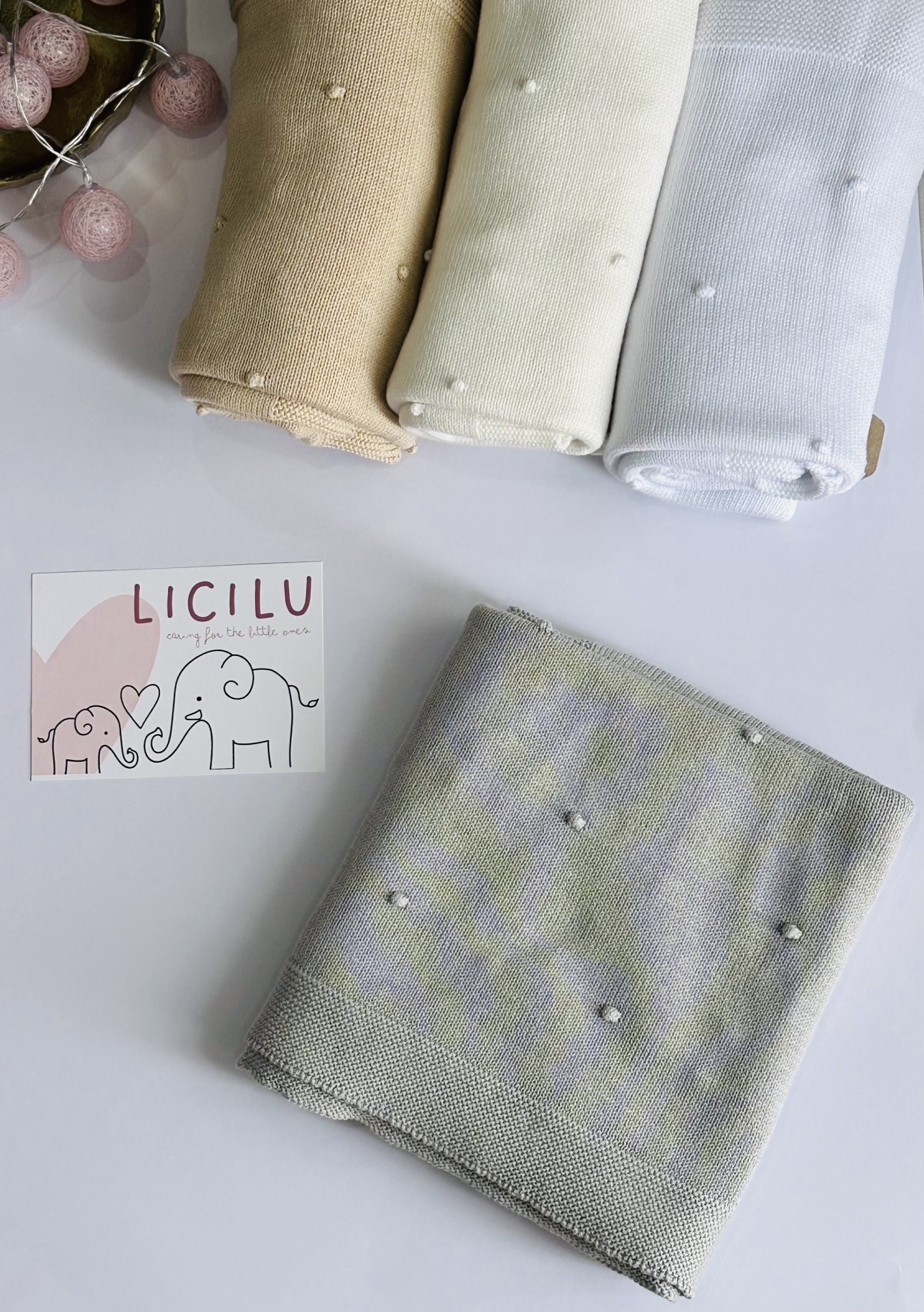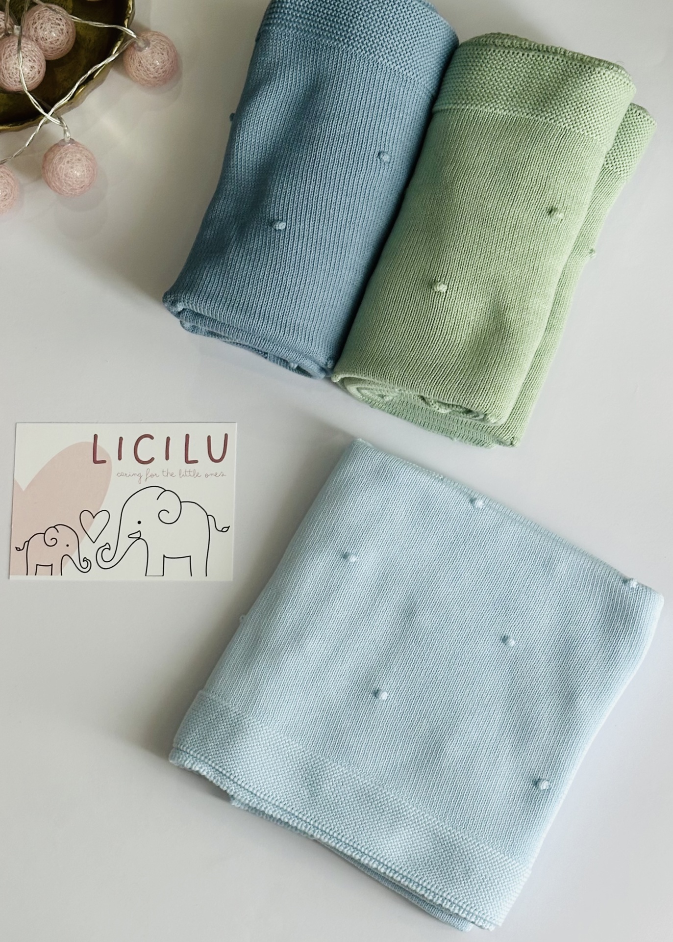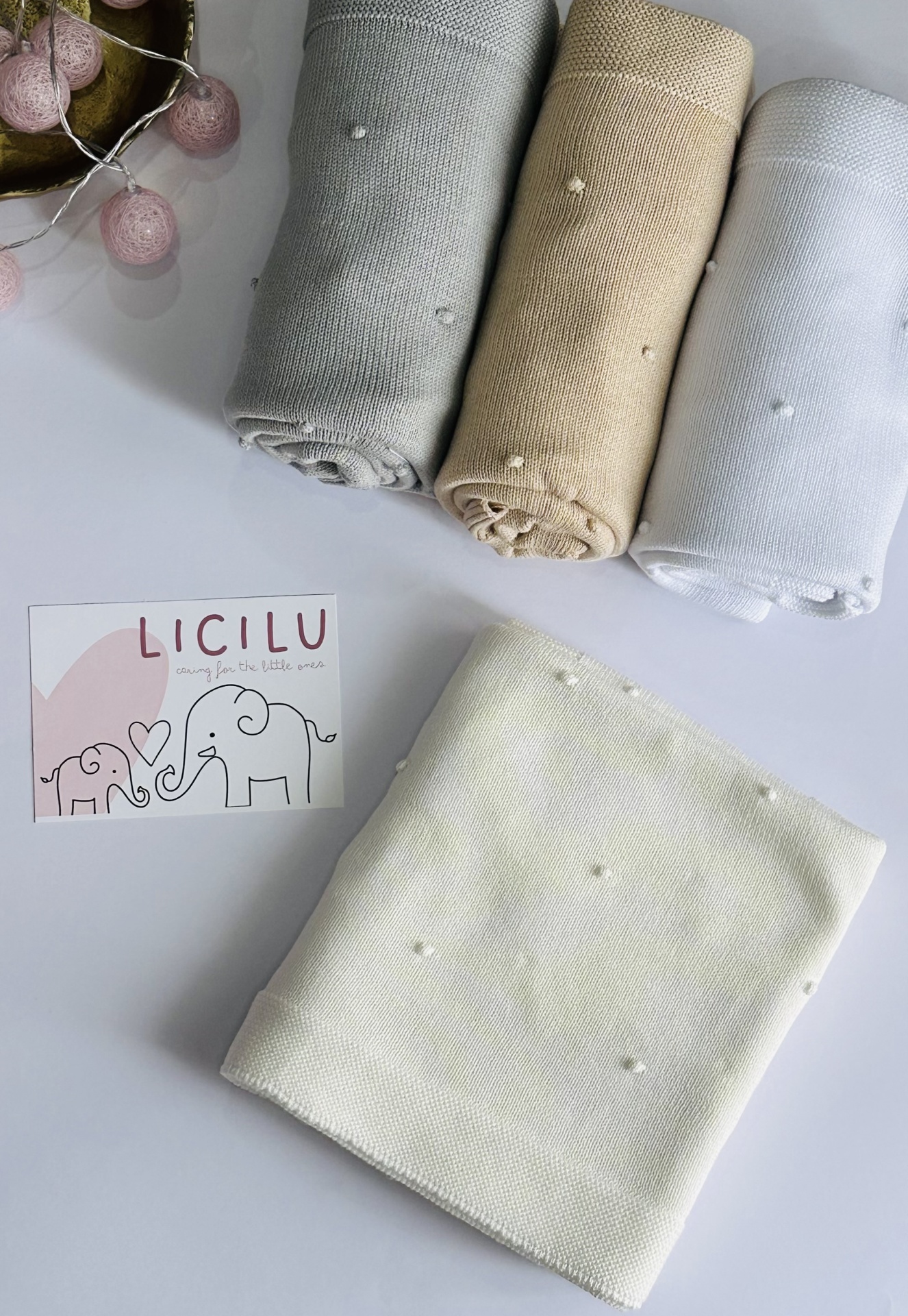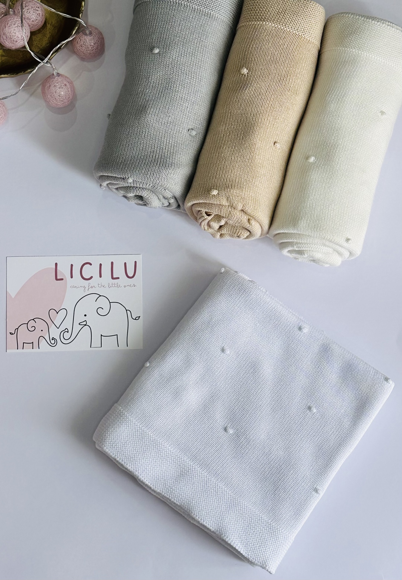 Manta de bebé com 'pompons' na malha. Versátil e universal. Pode ser usada durante todo o ano, seja nos dias mais frios ou mais quentinhos.