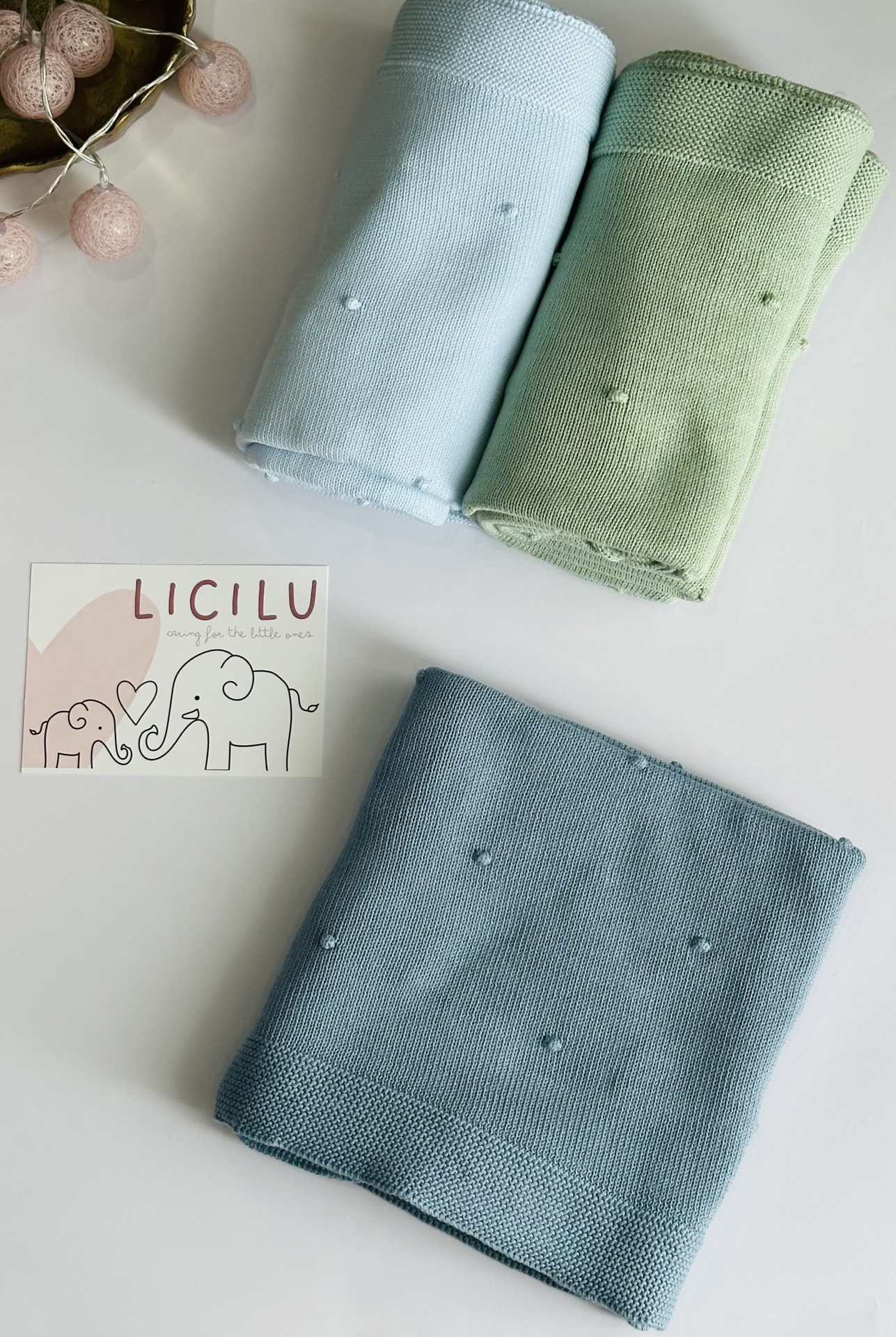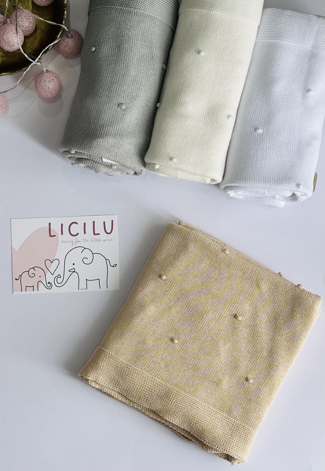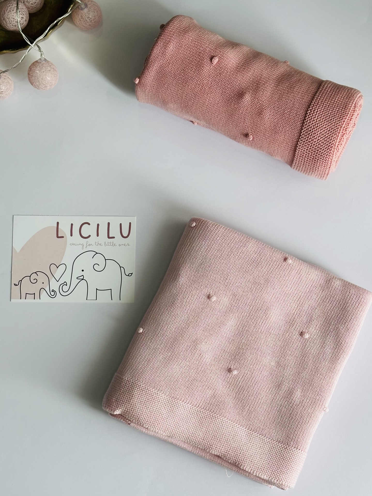 Manta de bebé com 'pompons' na malha. Versátil e universal. Pode ser usada durante todo o ano, seja nos dias mais frios ou mais quentinhos.