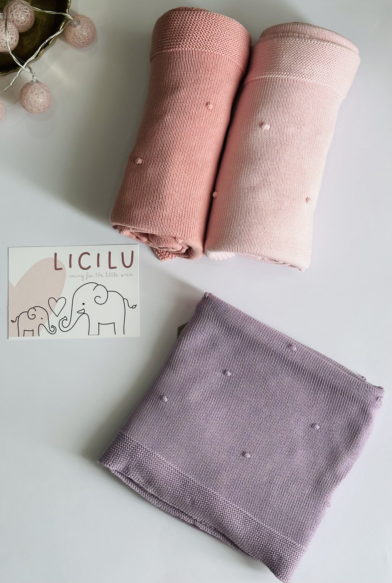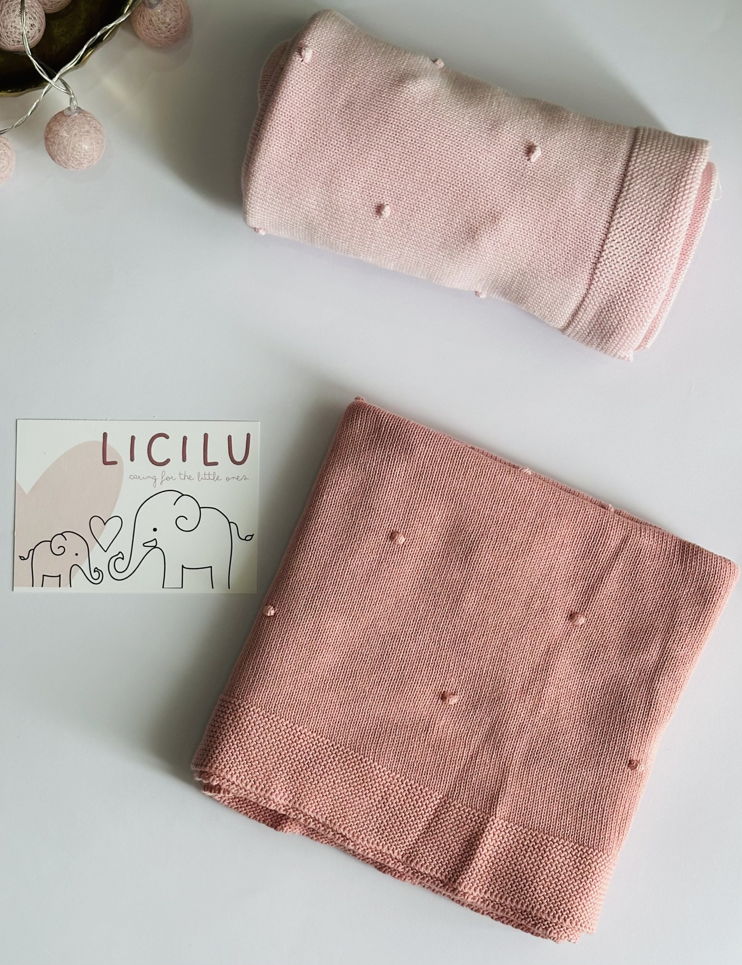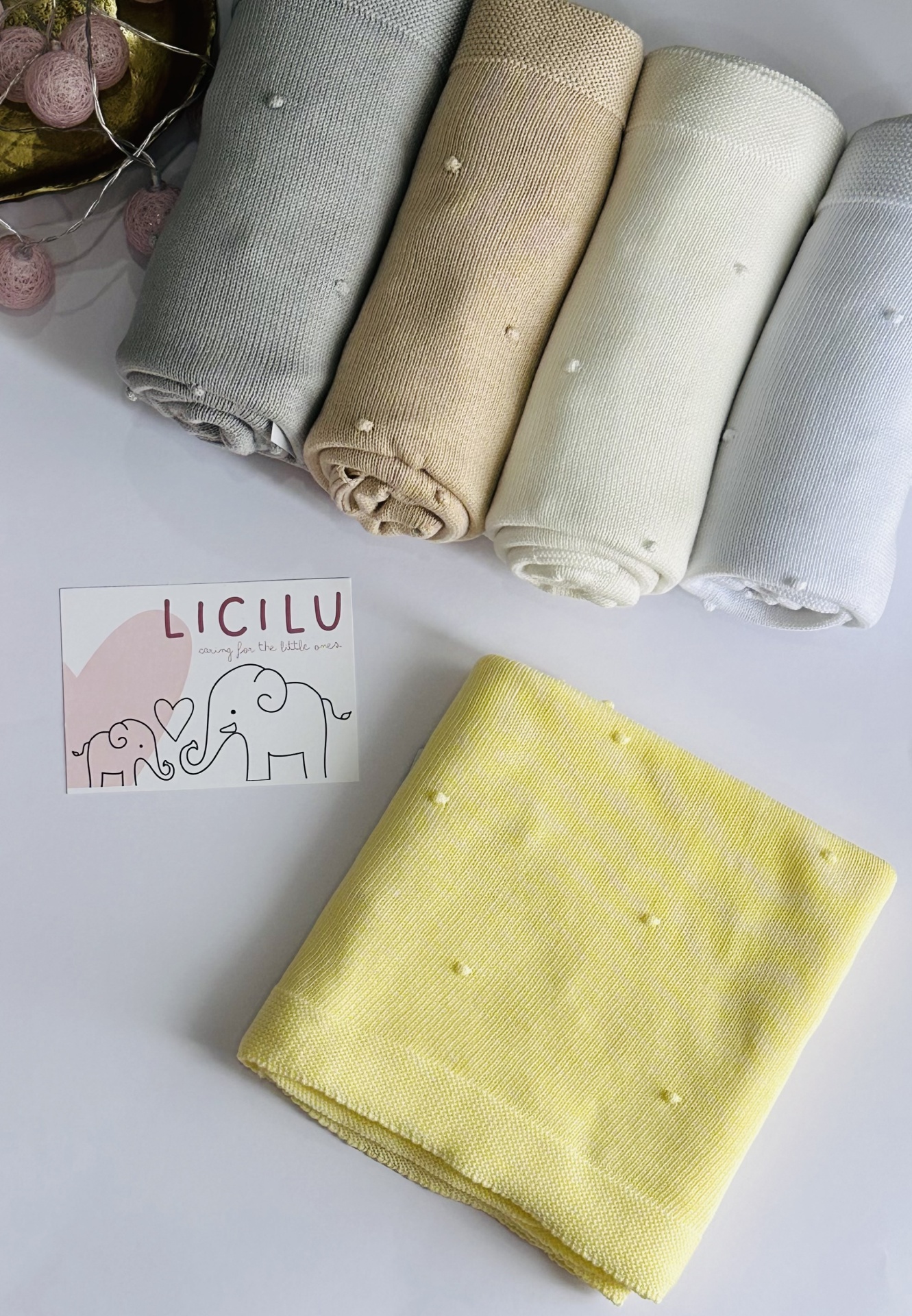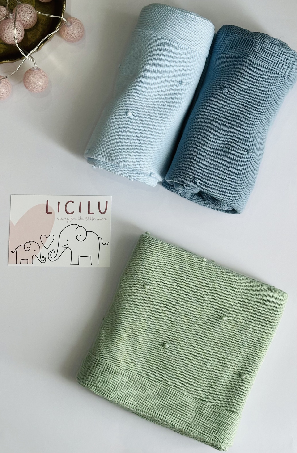 Manta de bebé com 'pompons' na malha. Versátil e universal. Pode ser usada durante todo o ano, seja nos dias mais frios ou mais quentinhos.