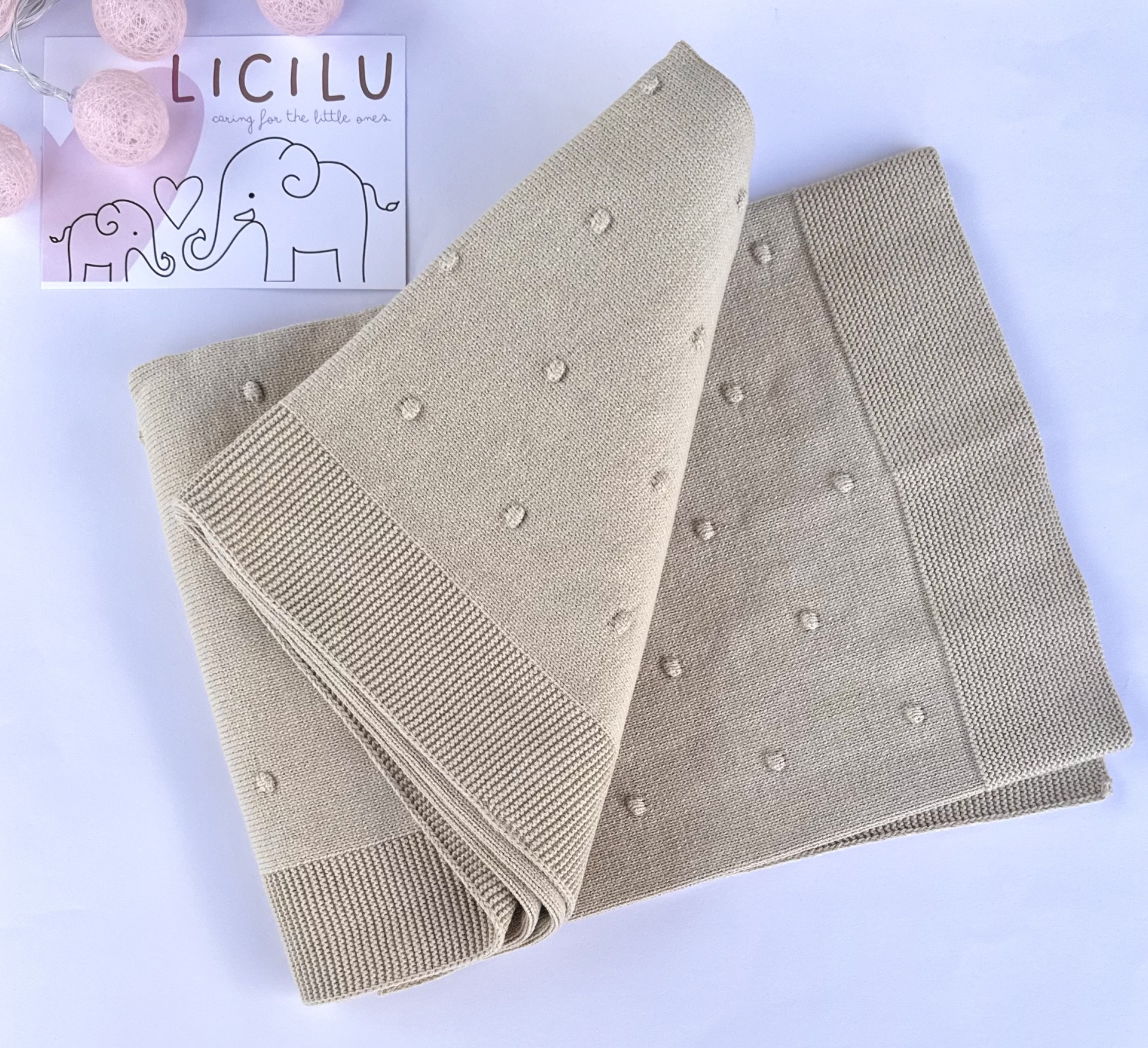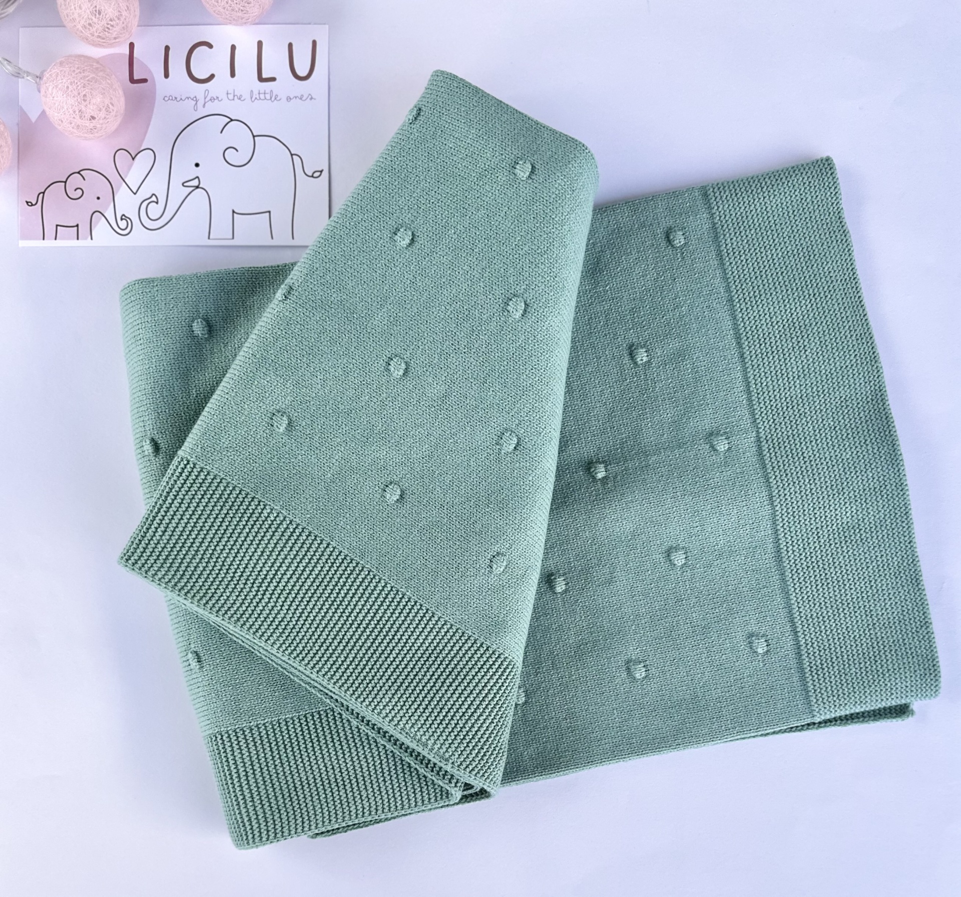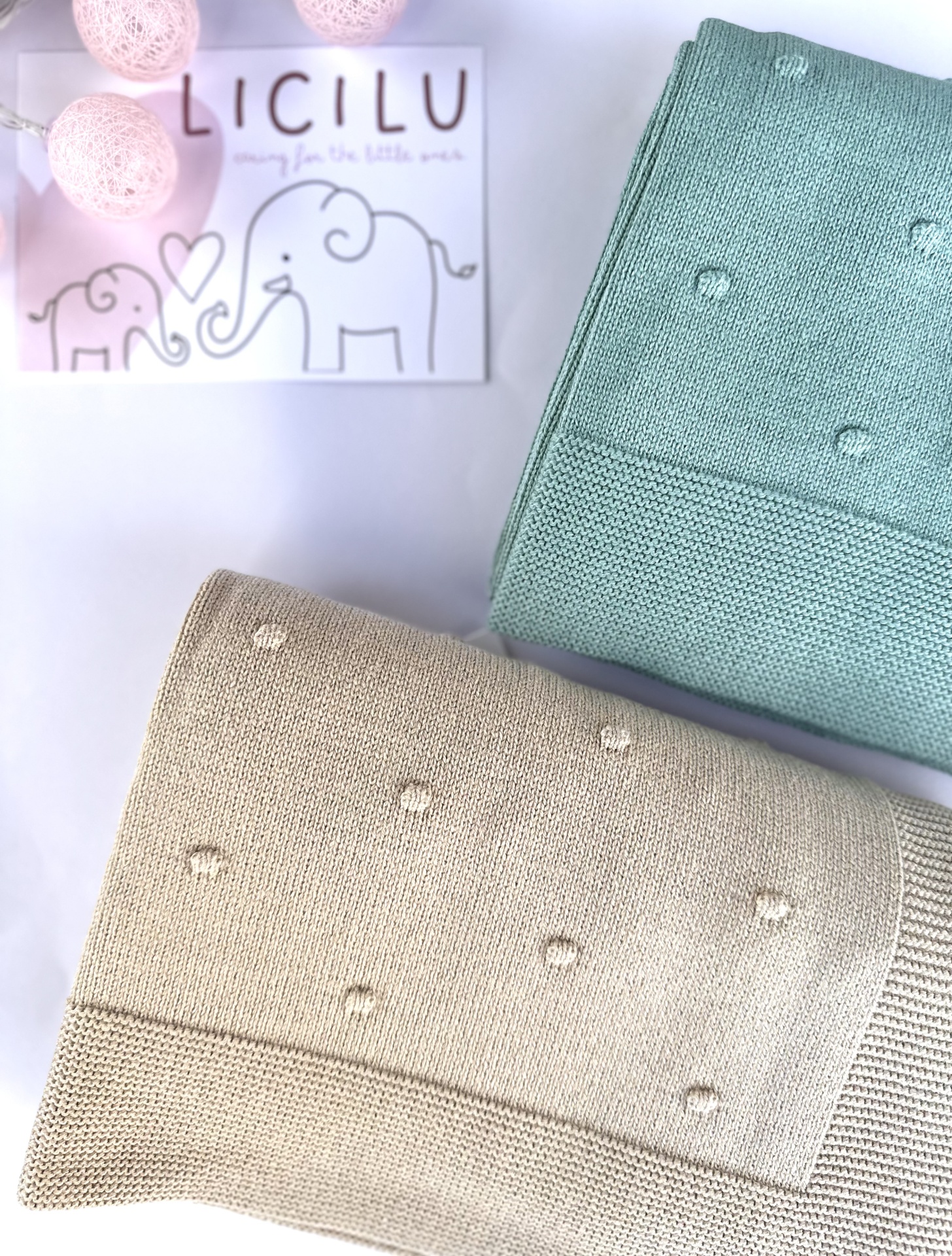 Duas mantas de malha bege e verde água com pequenos pompons, junto a cartão com texto LICILU