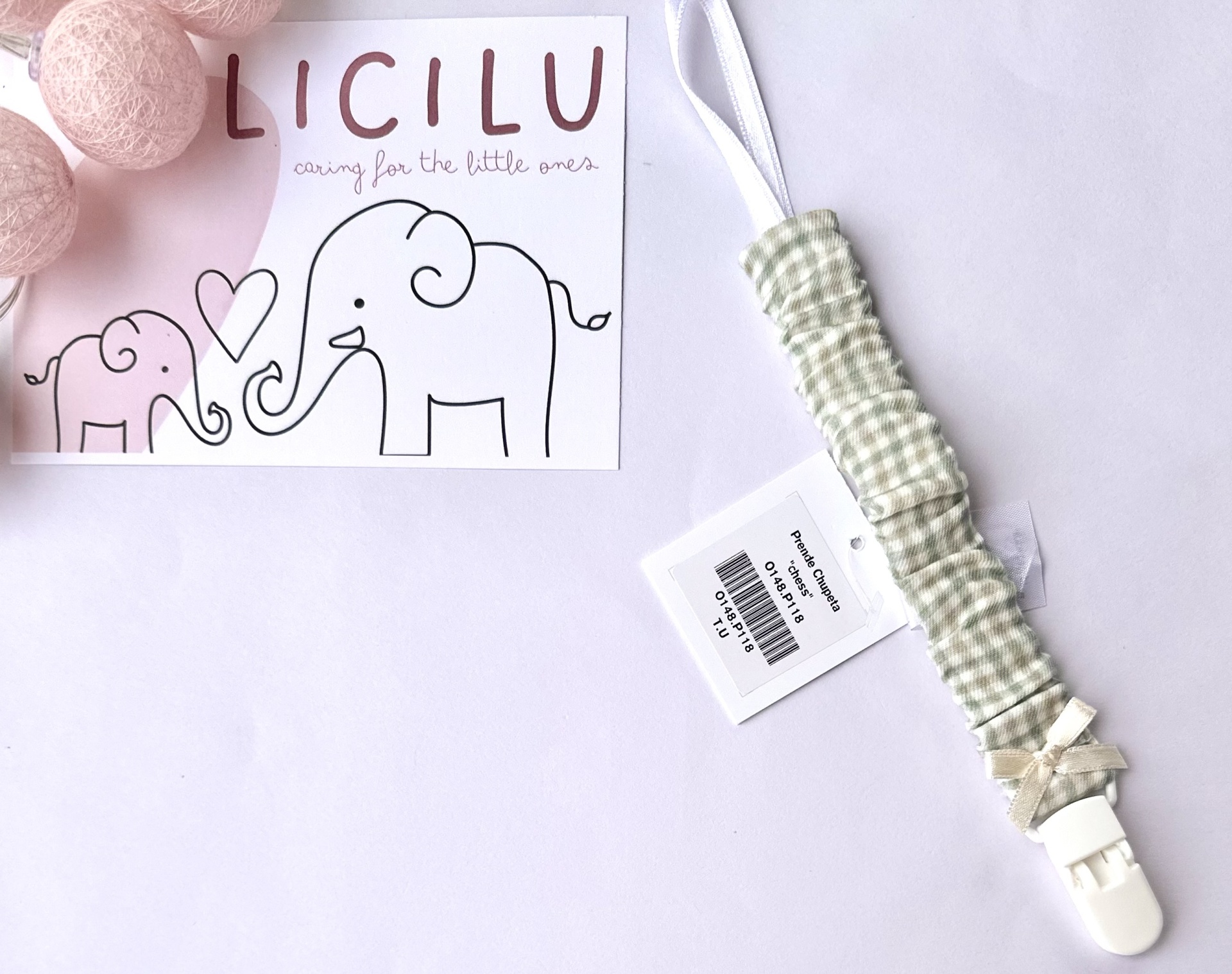 Prende chupetas decorado com padrão xadrez em tons de verde/neutros.