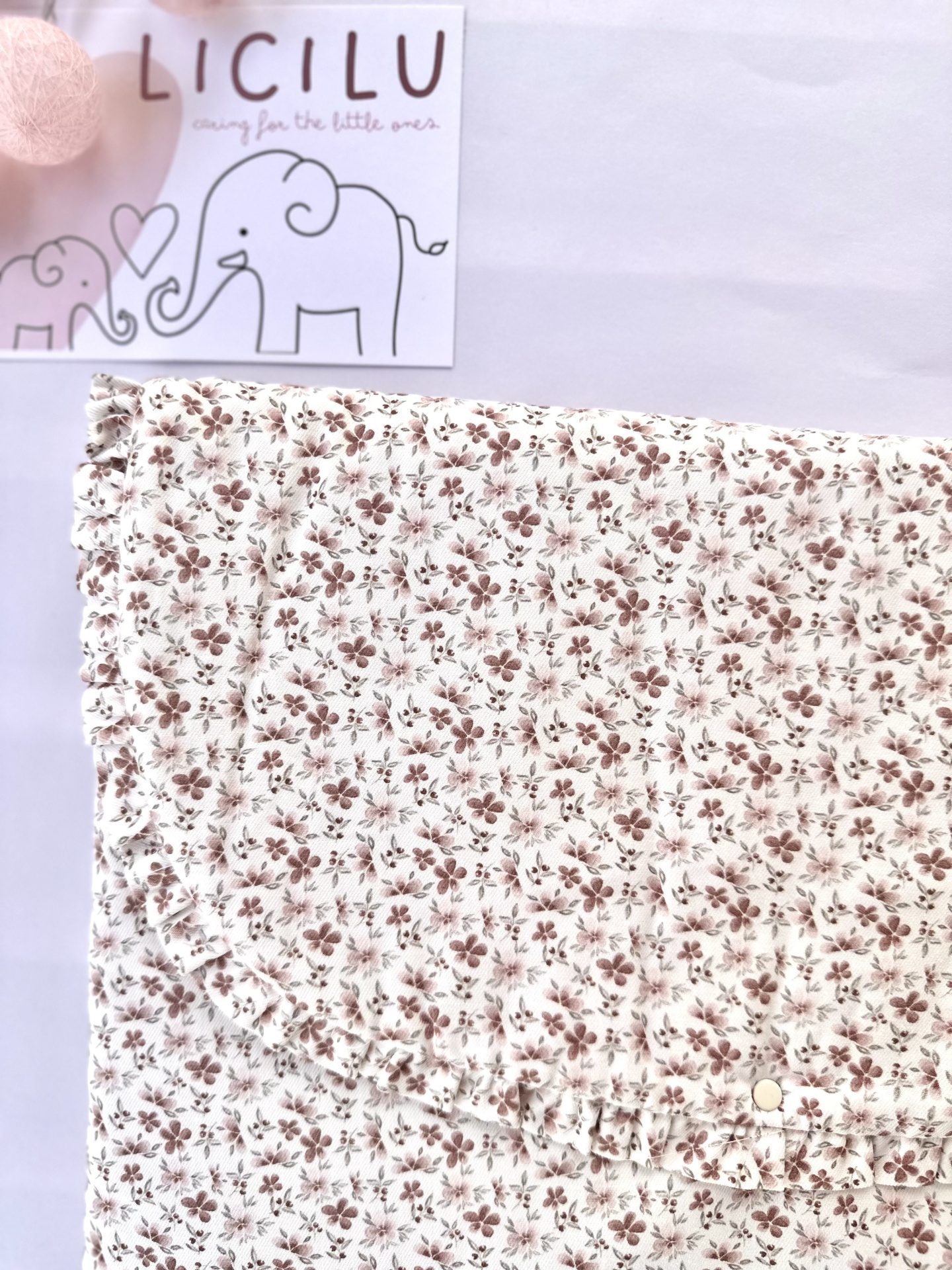 É decorado com padrão de florinhas nos tons de cor-de-rosa. Tem um folhinho no mesmo padrão ao redor da abertura do saco.