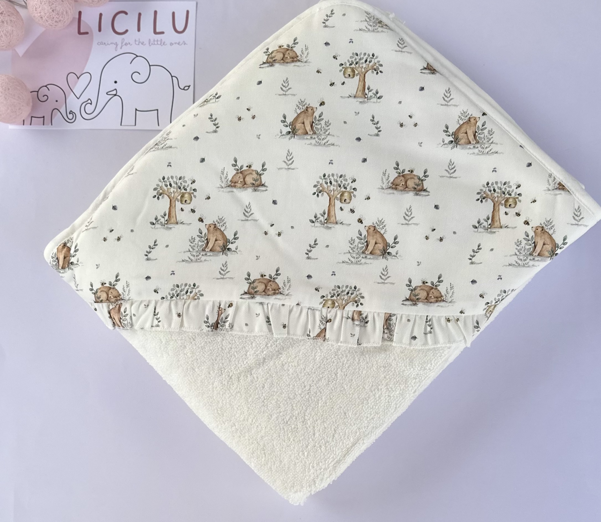 Toalha decorada com padrão intemporal 'honey' com elementos da natureza incluindo ursinhos e abelhas.
