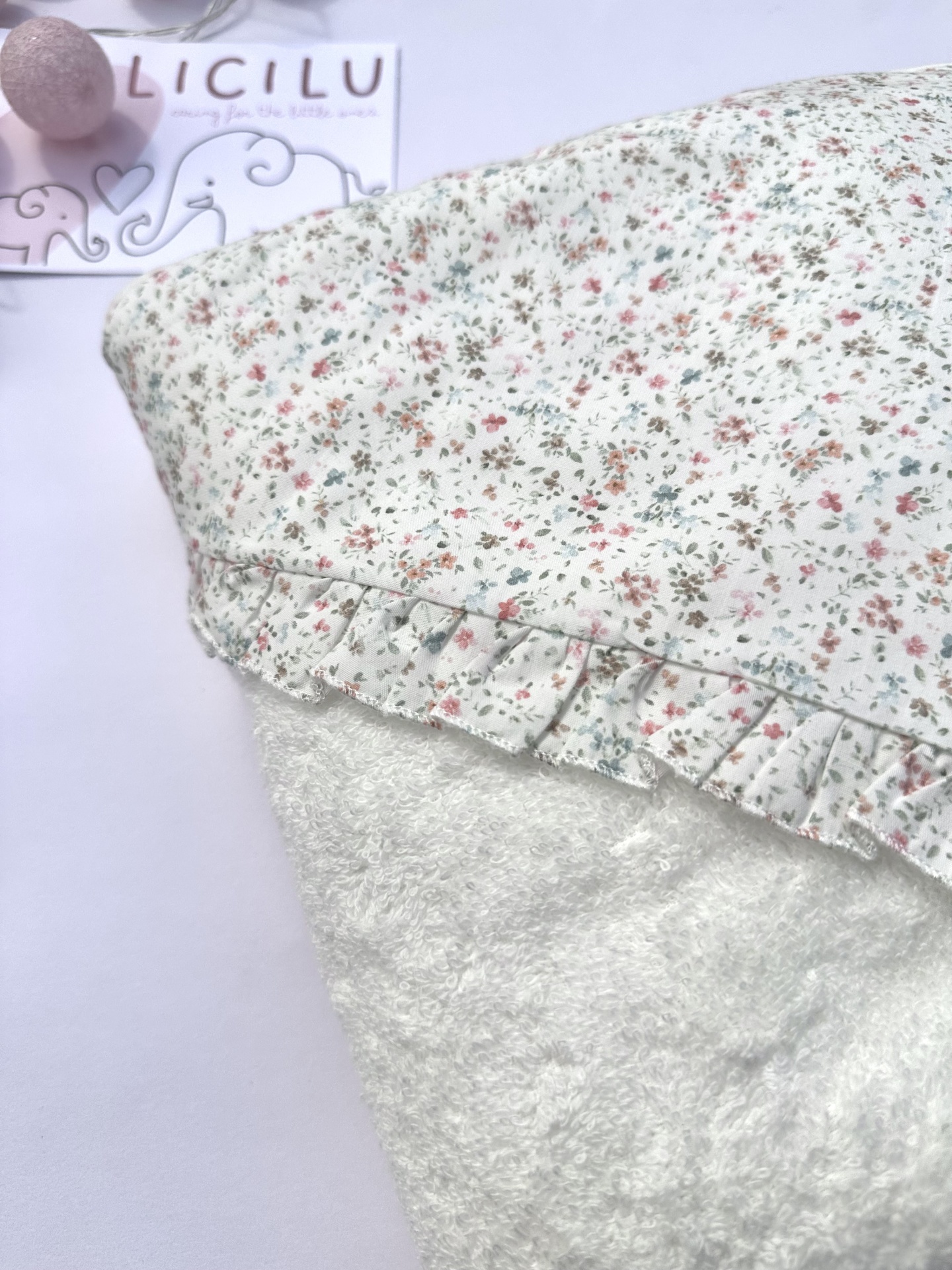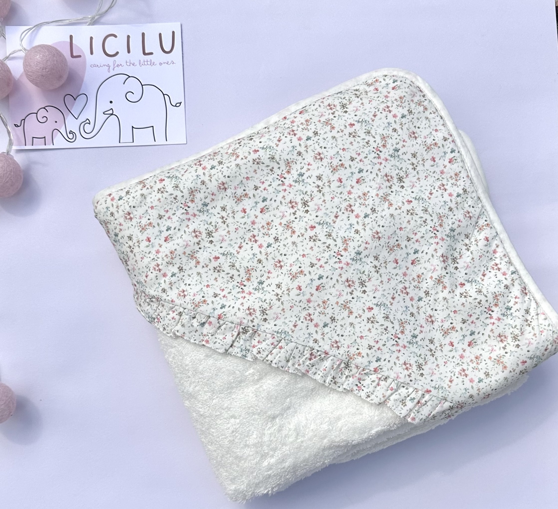 Toalha de banho com padrão 'Sweetness' na zona do capuz com um folhinho no mesmpo padrão nessa zona.