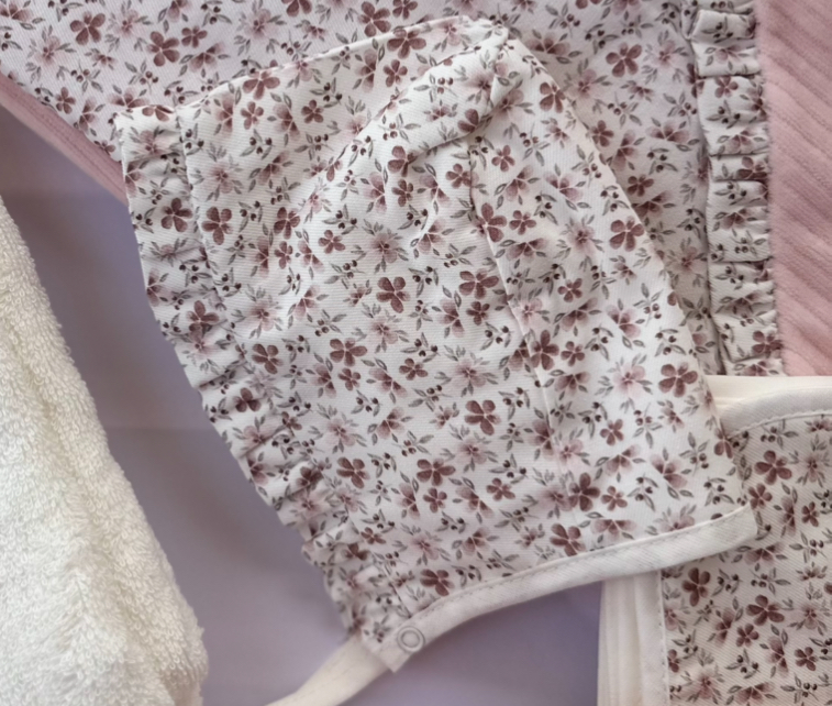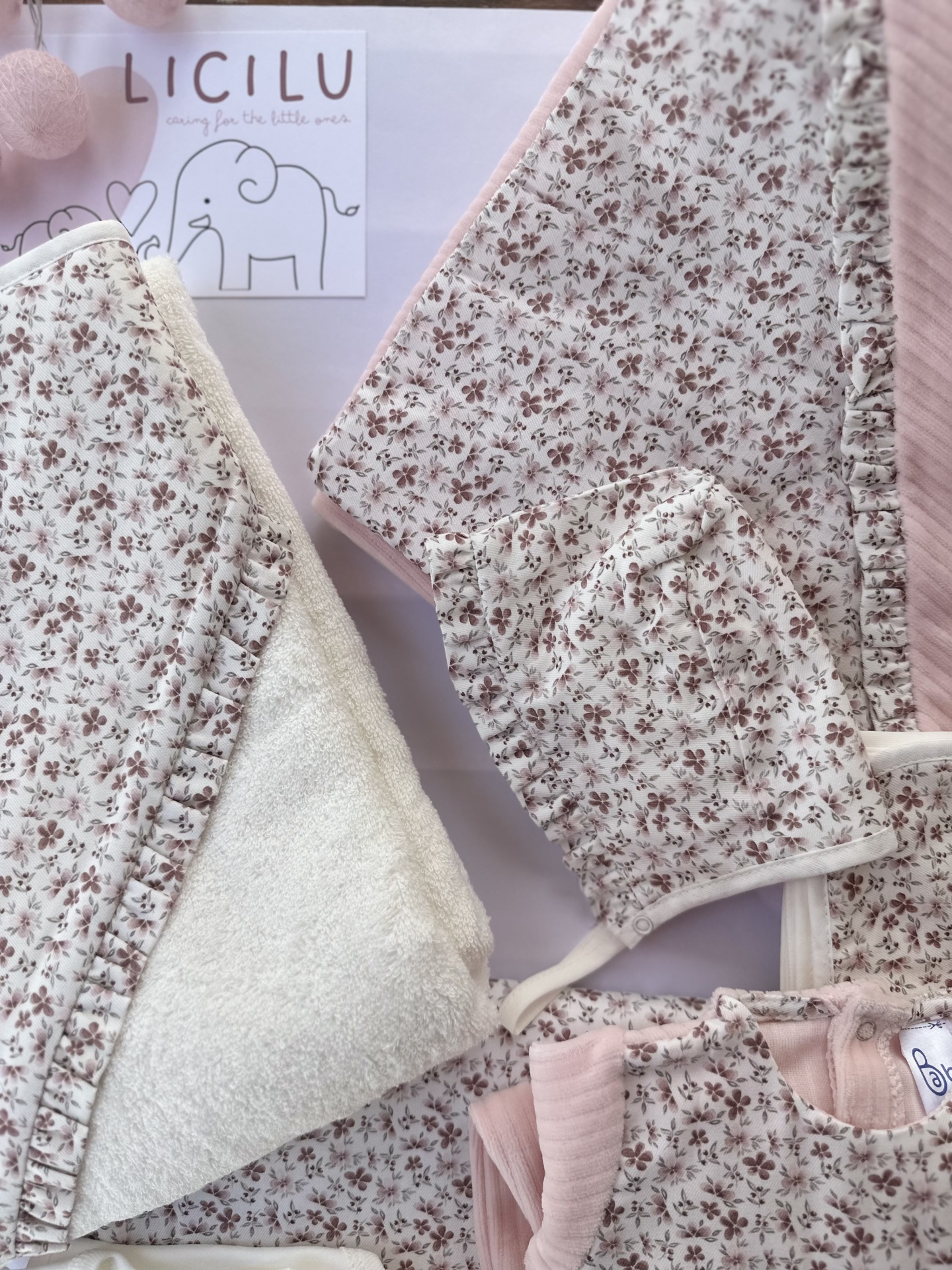 Touca decorada com padrão de florinhas nos tons de cor-de-rosa.